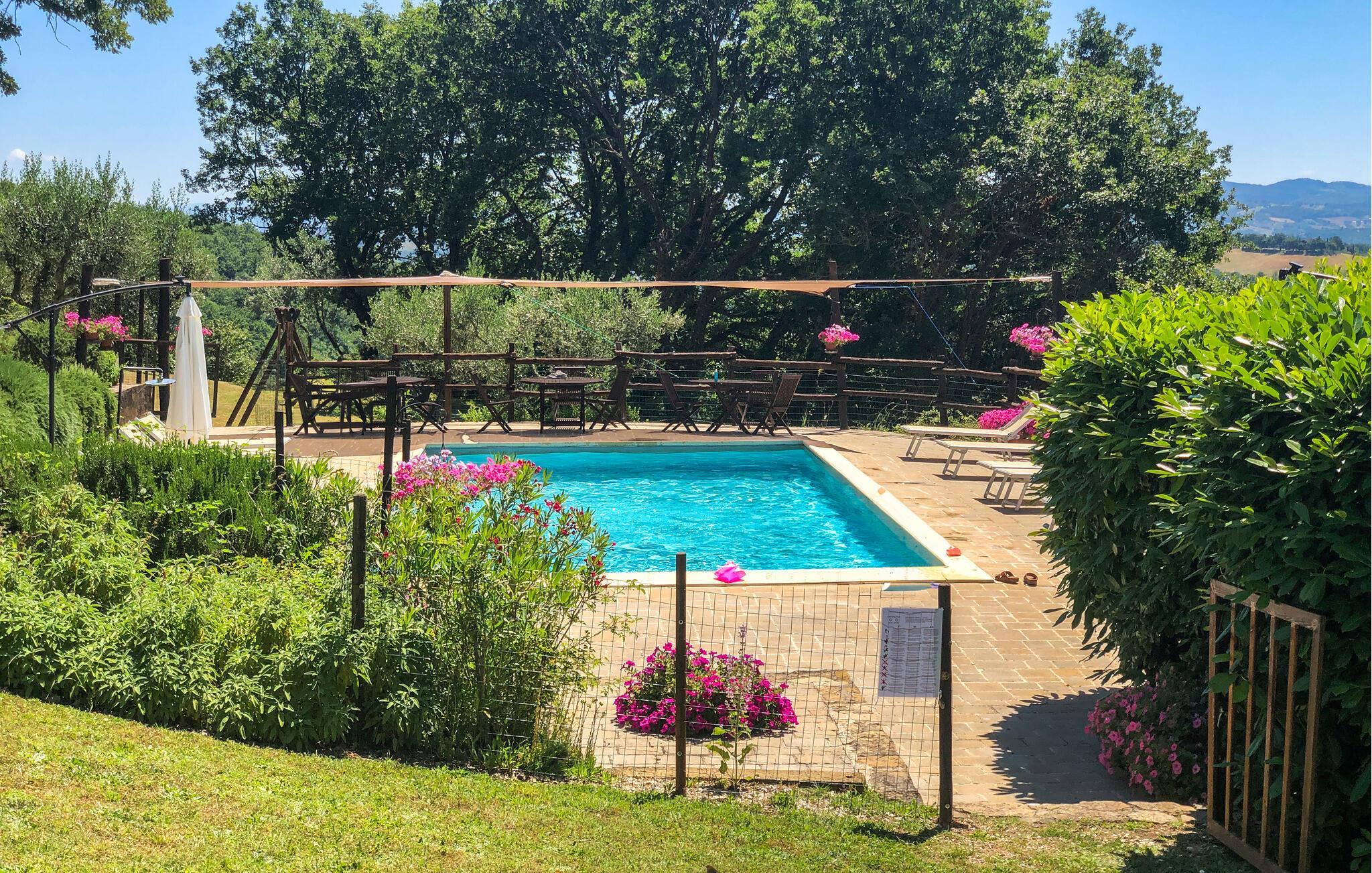 Mit wunderschönem Panoramablick über die Landschaft und herrlichem Gemeinschaftspool empfängt Sie diese gemütliche Ferienwohnung.
