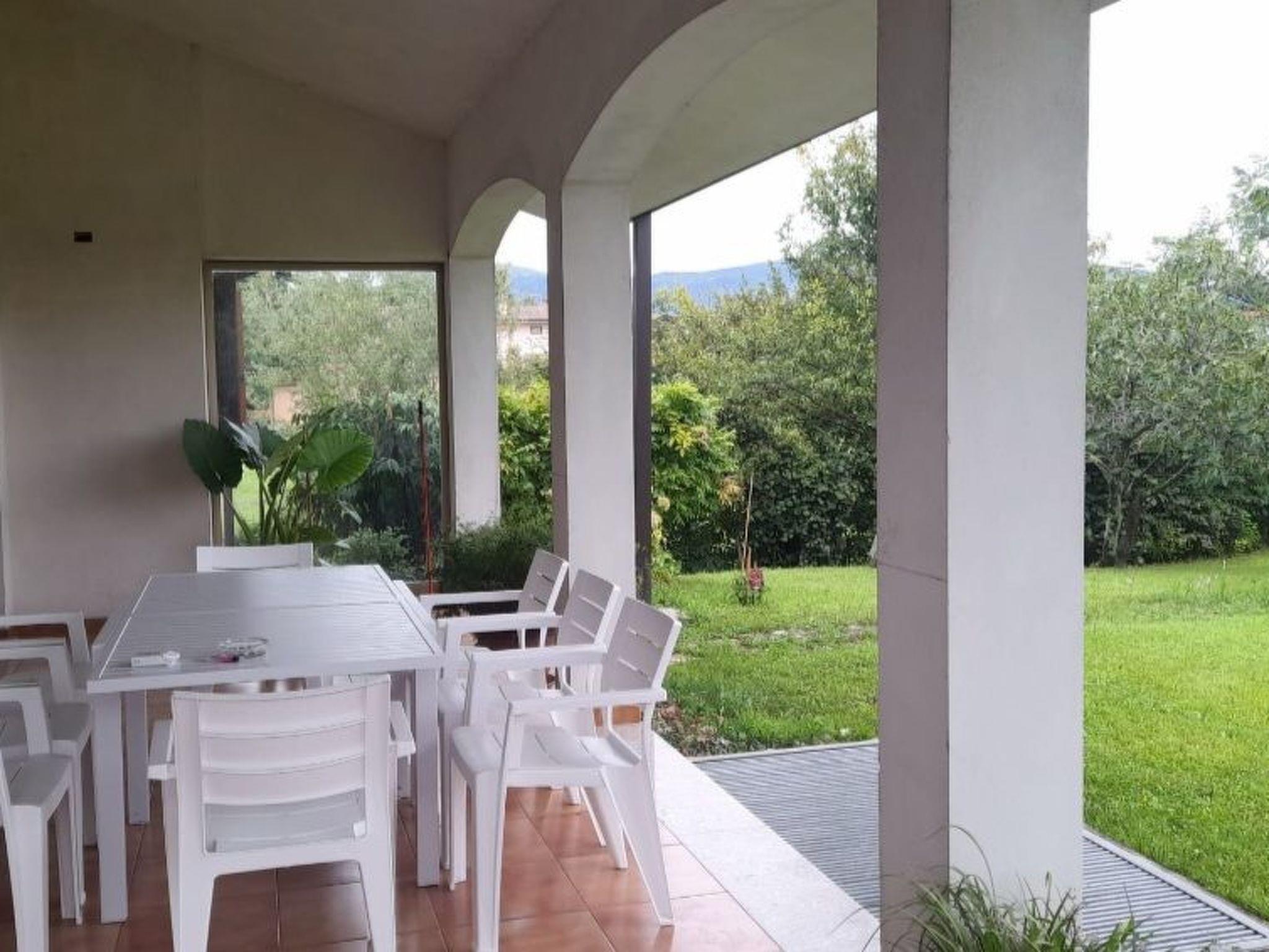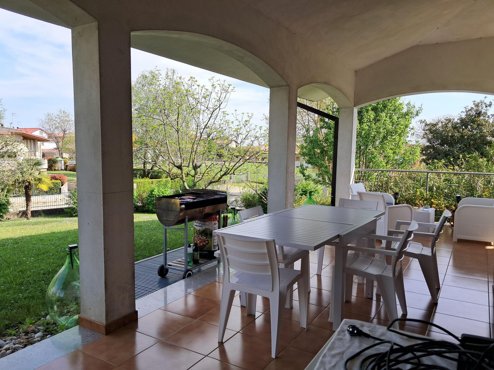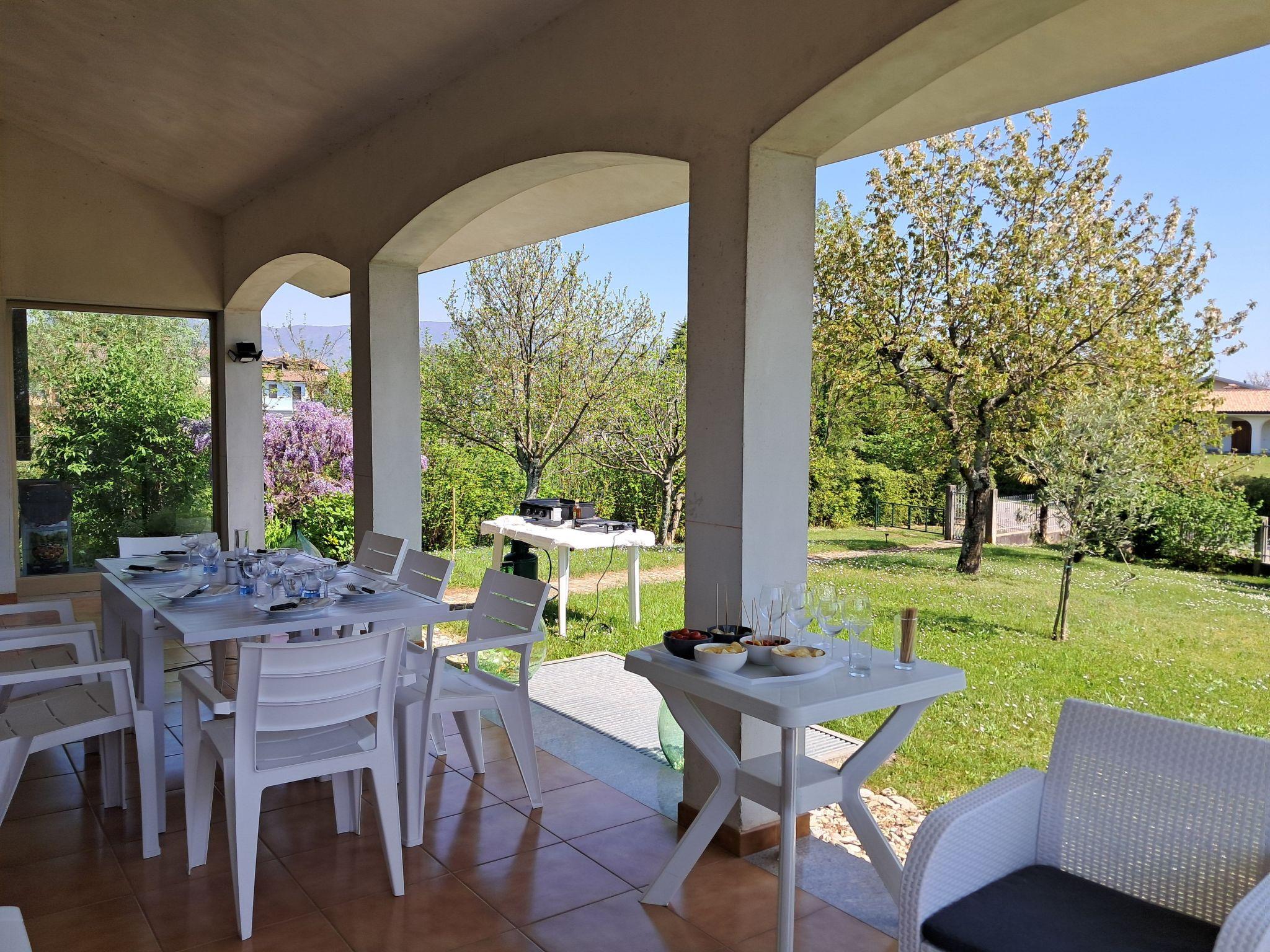 Schöne, halb überdachte Terrasse mit Gartentisch und Grillstühlen, die auf einen großen, eingezäunten Garten hinausgeht.