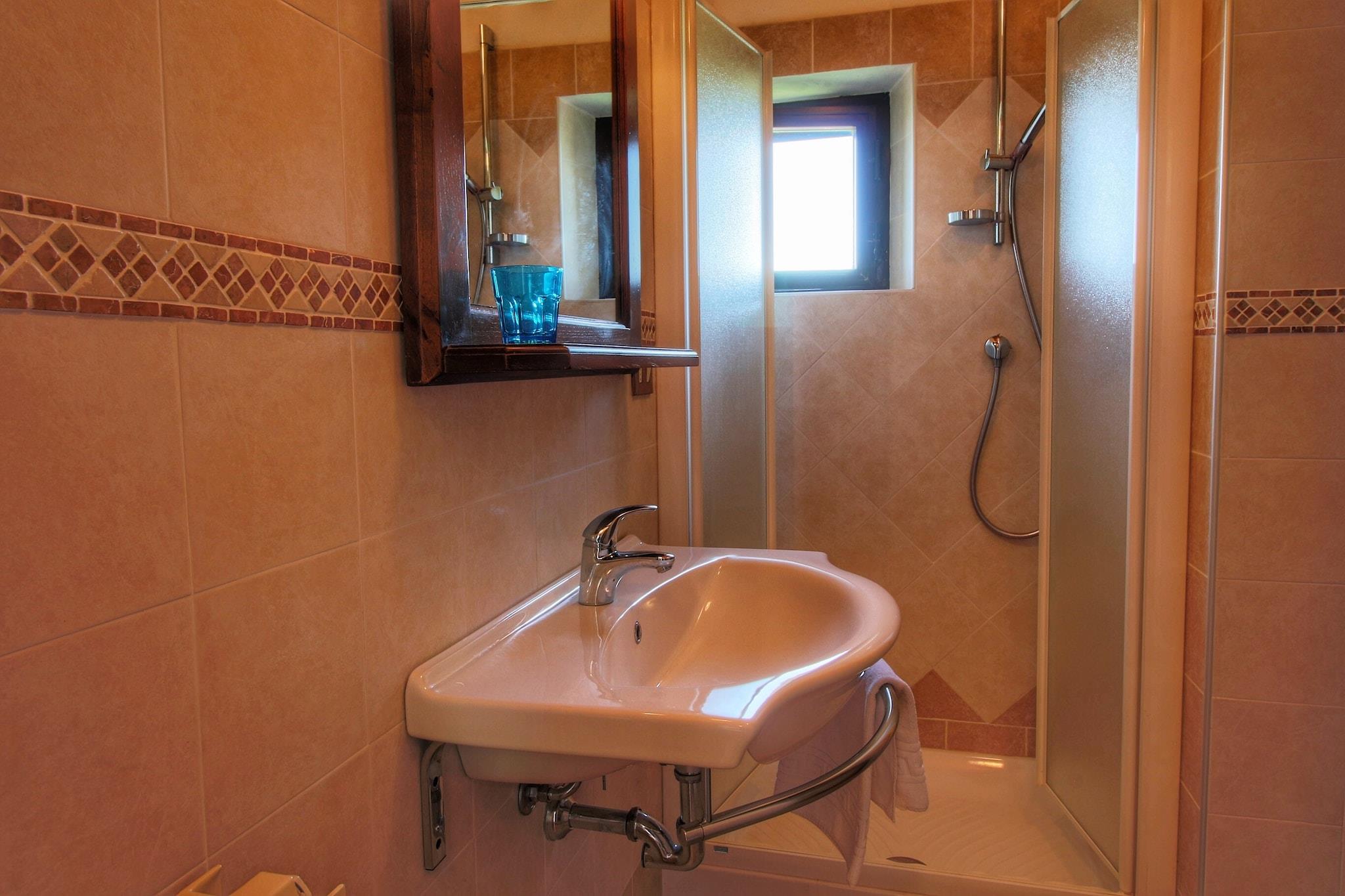 In der 1. Etage: (Wohnzimmer(Kaminofen), Wohnküche(Kochplatte, Kochherd, Dunstabzugshaube, Espressomaschine, Backofen, Mikrowelle, Kühl-/Gefrierkombination), Schlafzimmer(Doppelbett), Schlafzimmer(2x Einzelbett), Schlafzimmer(Doppelbett), Schlafzimmer(2x Einzelbett), Badezimmer(Dusche, Waschbecken, Toilette, Bidet, Waschmaschine), Badezimmer(Dusche, Waschbecken, Toilette, Bidet), Heizung) Esstisch(8 Personen), Terrasse(alleinige Nutzung, 9 m2), Garten(Gemeinschaftliche Nutzung mit anderen Gästen), Gartenmöbel, Grill, Parkplatz, Pool(Gemeinschaftliche Nutzung mit anderen Gästen, 14 x 7 m., geöffnet von Jun bis einschließlich Sep)