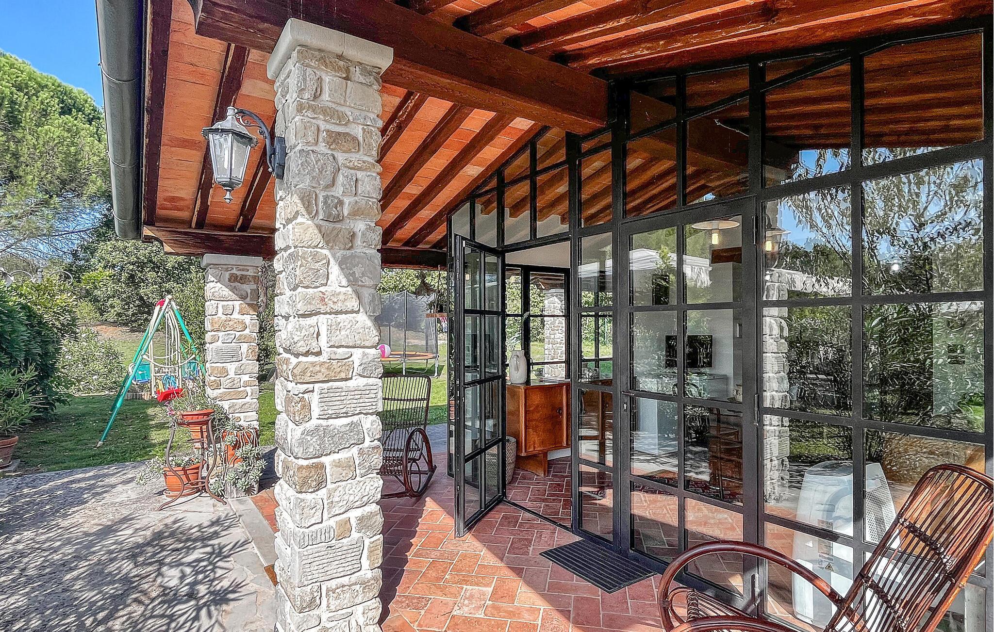 Dieses Haus verzaubert mit toskanischem Charme und zeitloser Gemütlichkeit. Die Terrakottaböden, Holzbalkendecken und der offene Kamin verleihen dem Raum Wärme und Charakter, während große Fenster sanftes Licht hineinlassen. Zwischen antiken Möbeln, Büchern und liebevollen Details spürt man sofort die Seele des Landhauses, das zum Verweilen und Entschleunigen einlädt. Hier können Sie lesen, plaudern oder einfach den Blick in den Garten genießen.