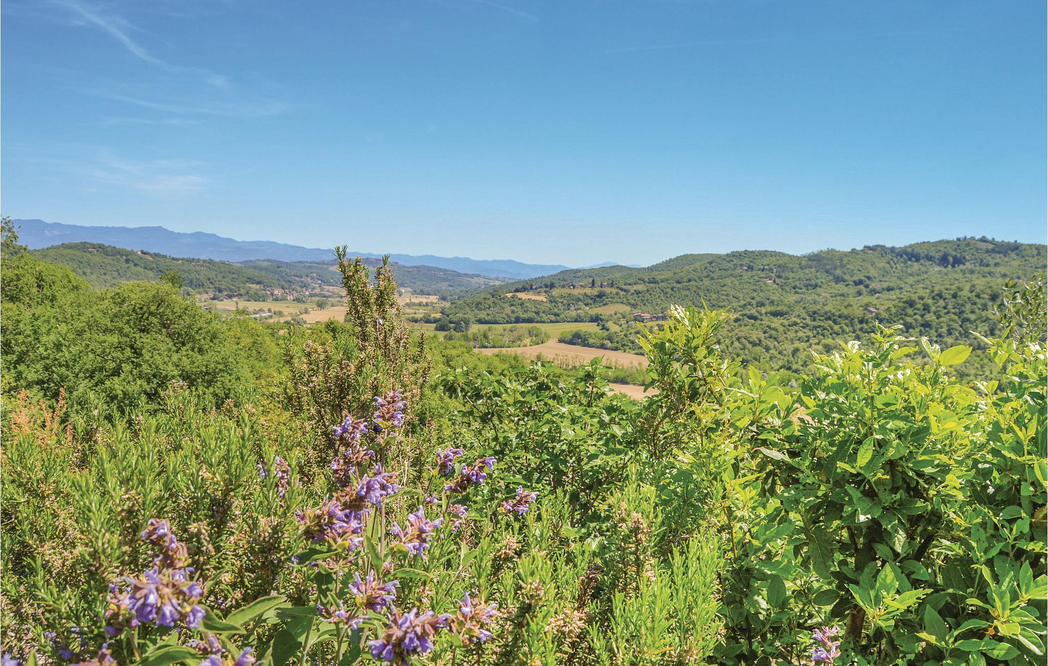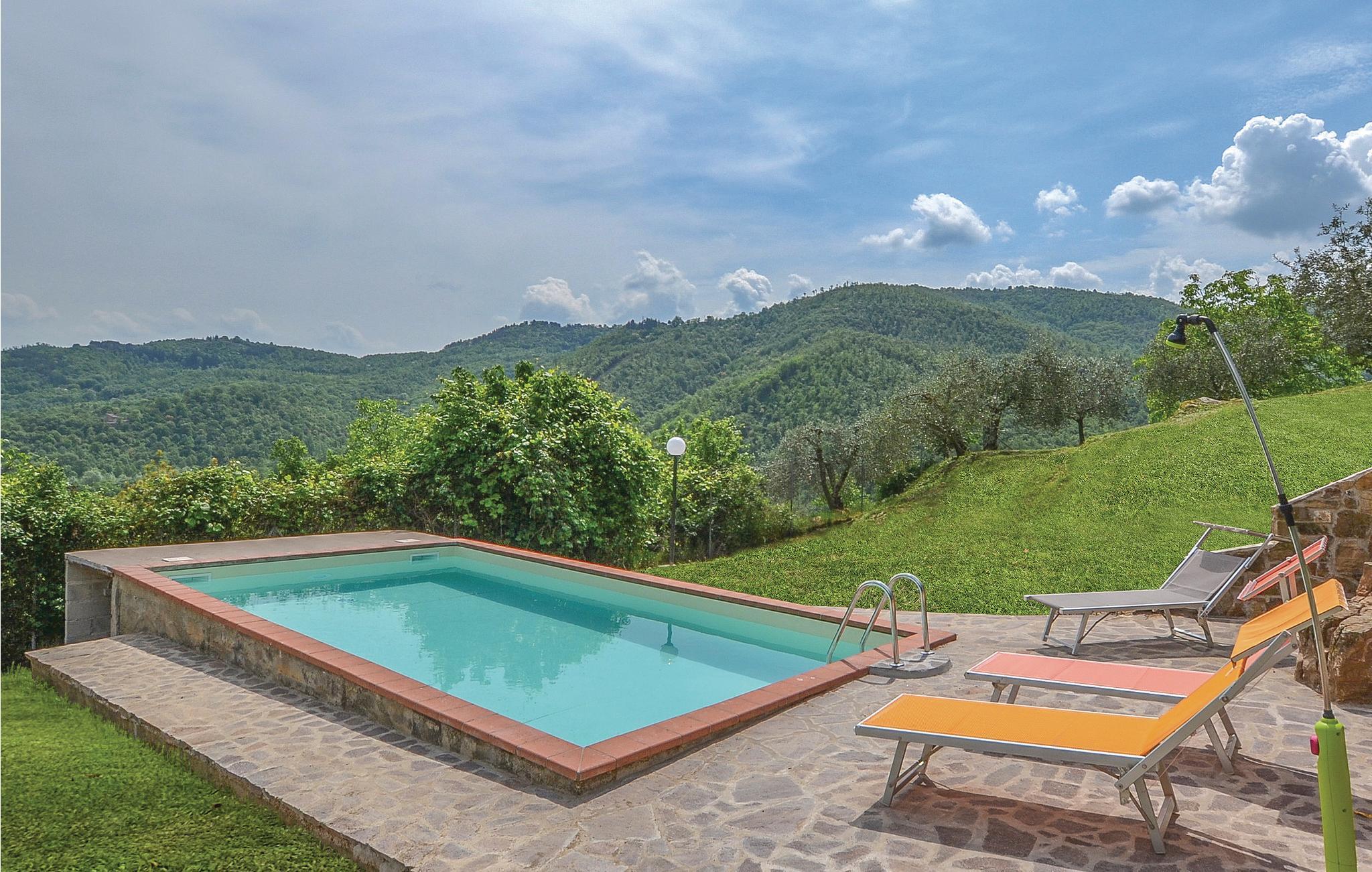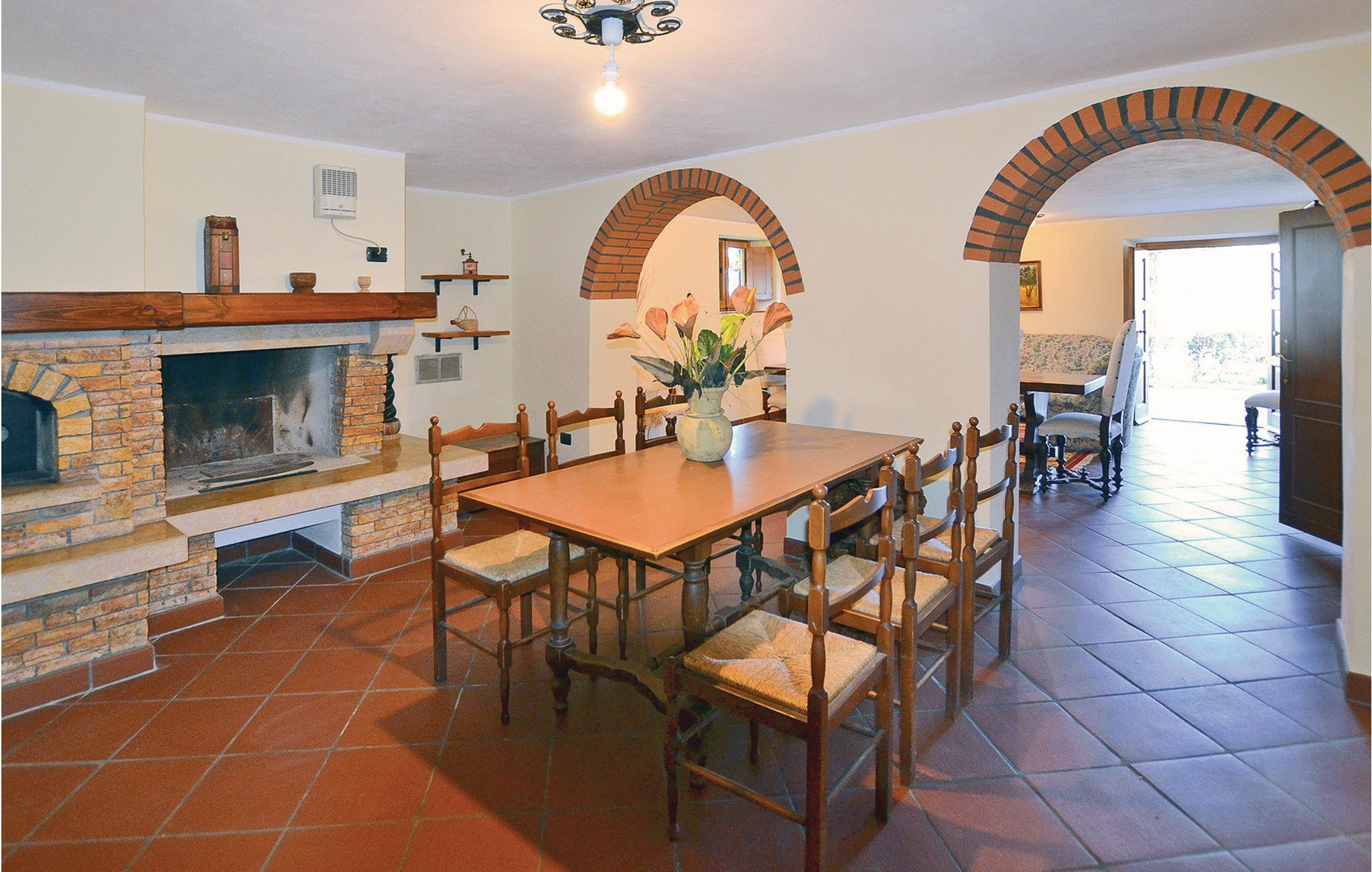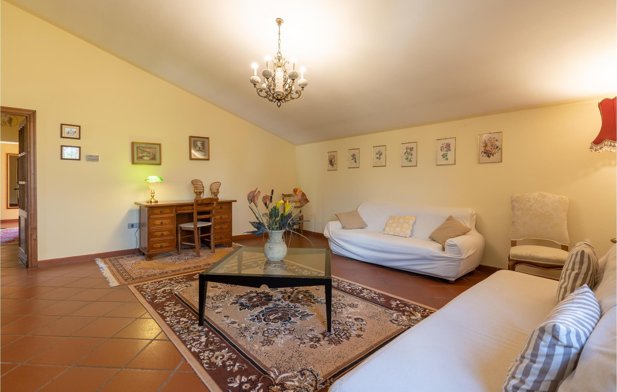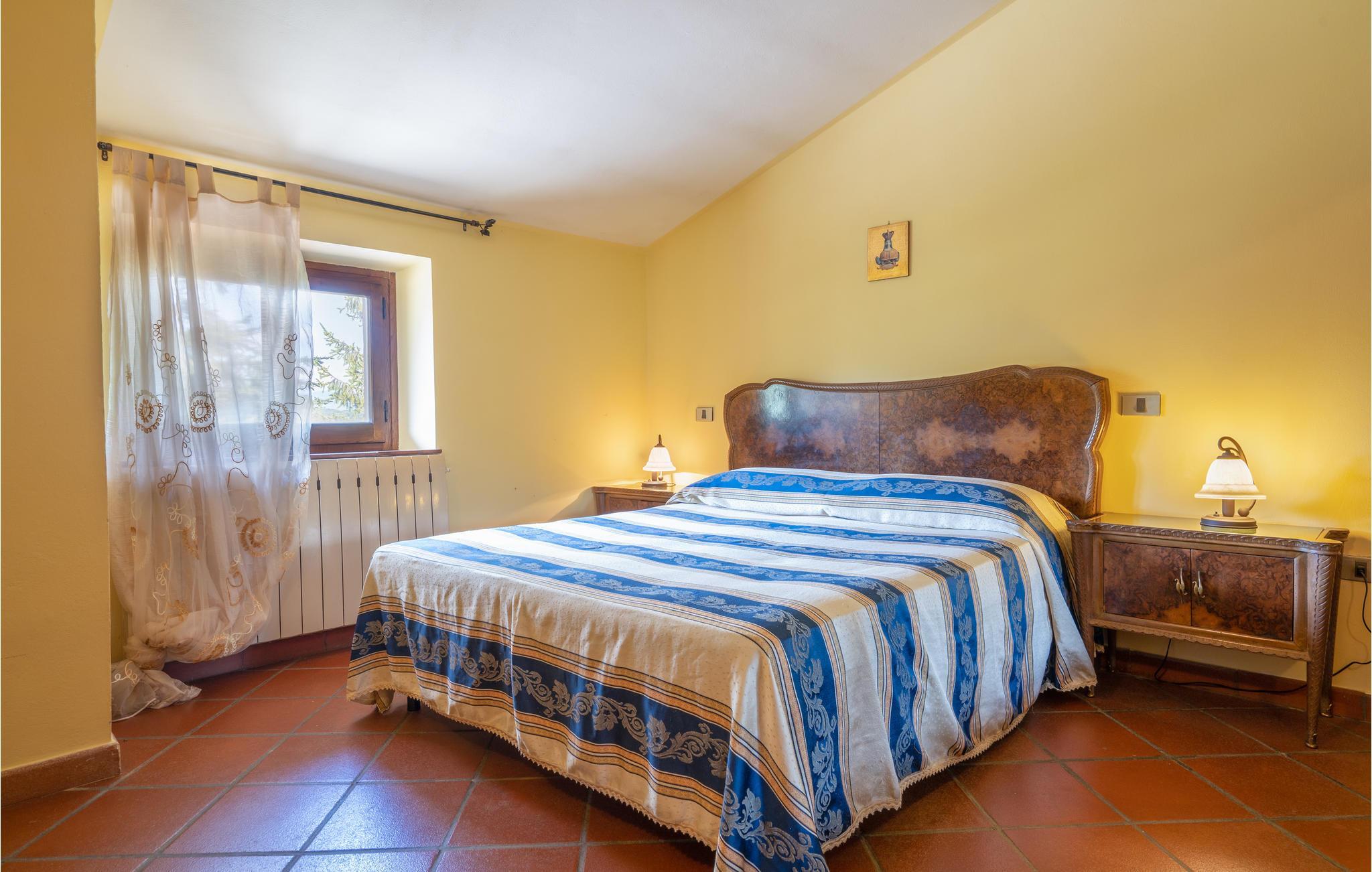 Im Erdgeschoss befindet sich die Wohnküche mit offenem Kamin und zwei angrenzenden Wohnräumen, ebenfalls mit Kamin/Barbecue und Sofaecke sowie einem Bad. Im 1.Stock, der auch über eine Außentreppe mit kleiner Loggia zu erreichen ist, gibt es ein weiteres Kaminzimmer, drei Schlafzimmer, ein Wohnzimmer mit Schlafcouch und ein großes Badezimmer. Von überall haben Sie einen schönen Ausblick auf die waldigen Hügel und das Tibertal. Auf dem Grundstück gibt es viel Auslauf und zur Erfrischung einen Pool und eine überdachte Terrasse mit Barbecue.