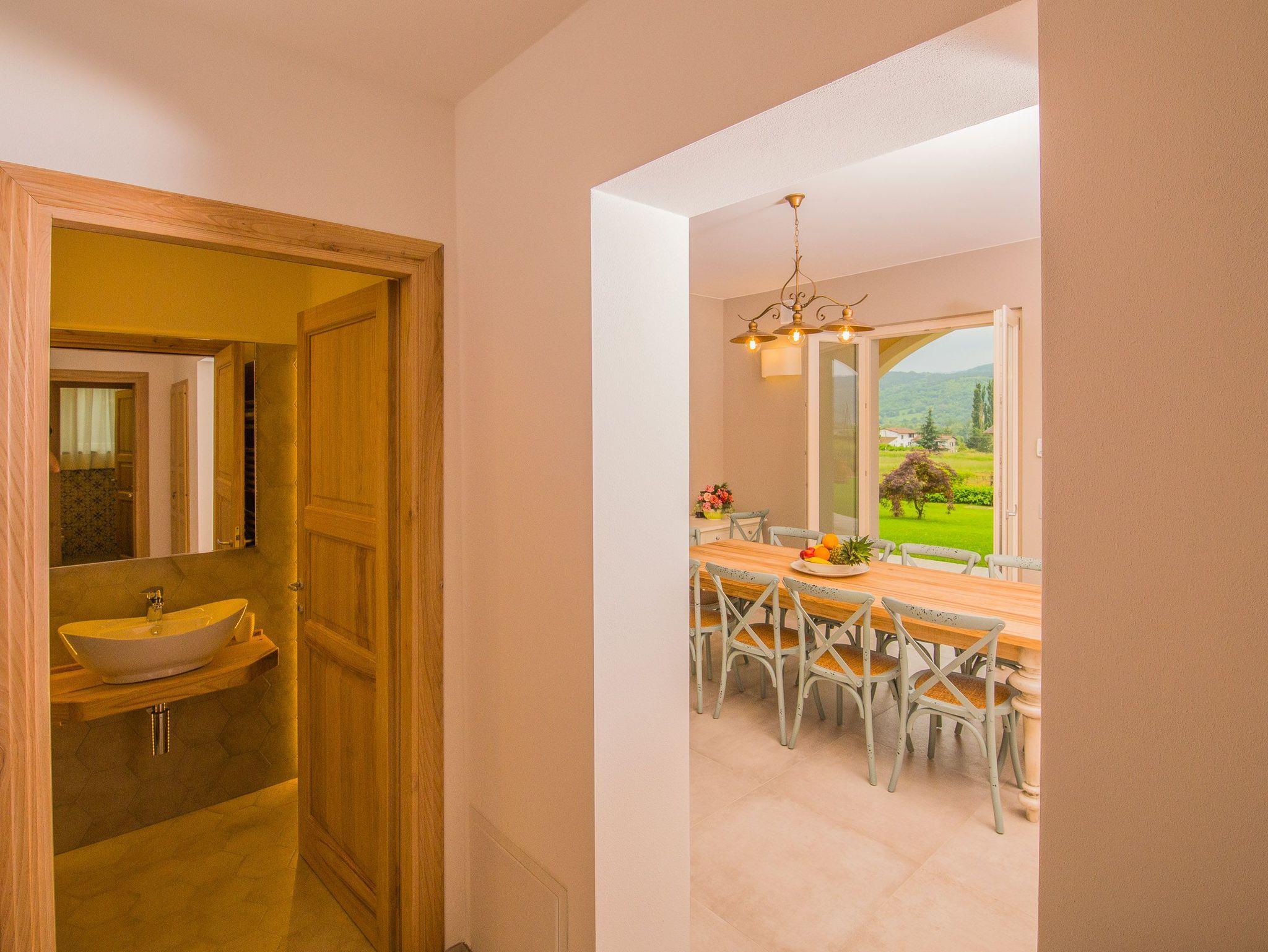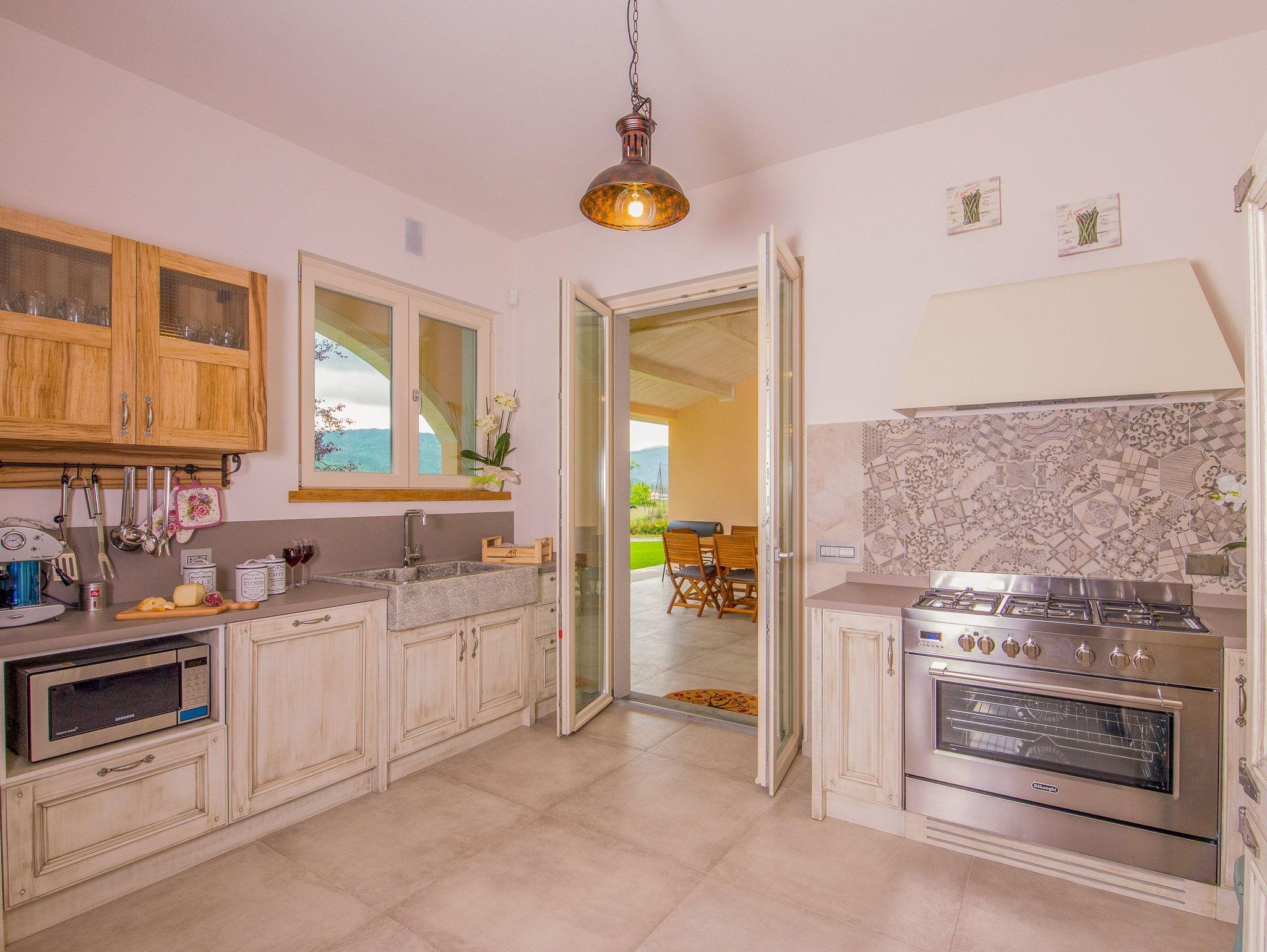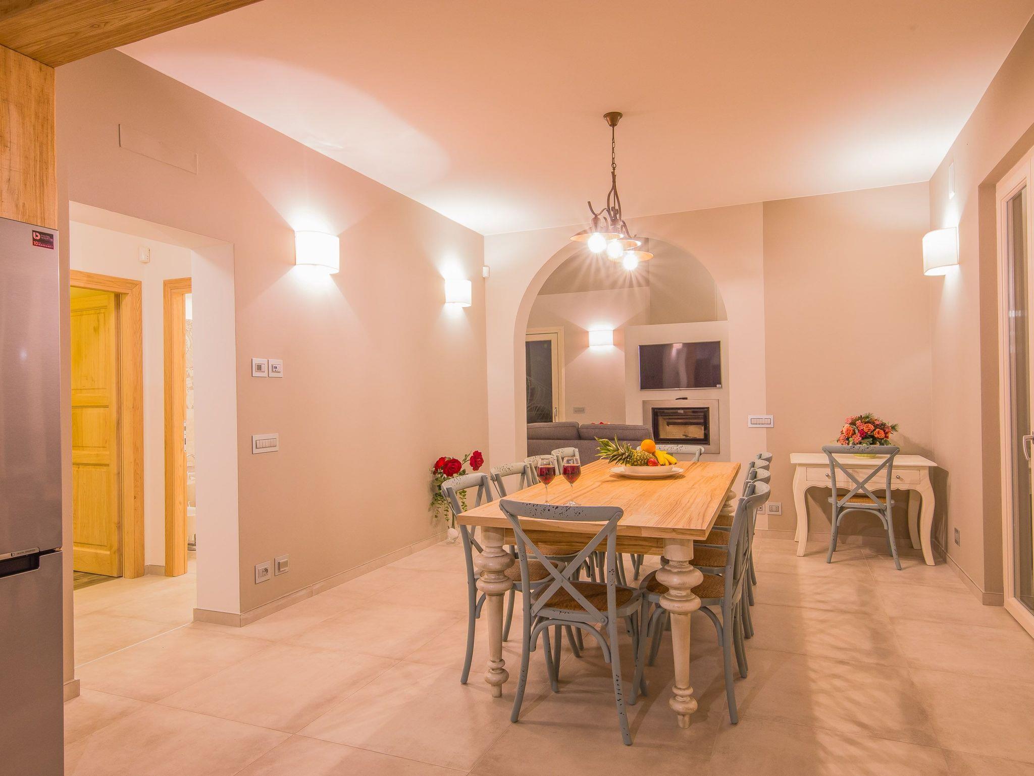 Im ebenerdigen Erdgeschoss befindet sich ein großer, heller Wohnraum mit zwei Sofas, einem 55-Zoll-TV, einem Kamin und einem Zugang zum Garten- und Poolbereich. Zwei Doppelschlafzimmer mit en-suite Bädern, eines davon mit direktem Zugang zum Garten und Pool, stehen ebenfalls zur Verfügung. Ein Gäste-WC und eine traumhaft schöne Küche mit Essbereich, angrenzend zum Wohnbereich, runden das Raumangebot ab. Ein zweiter offener Essbereich befindet sich unter einer überdachten Loggia. Im Nebenhaus gibt es einen Waschraum mit Waschmaschine und Trockner.