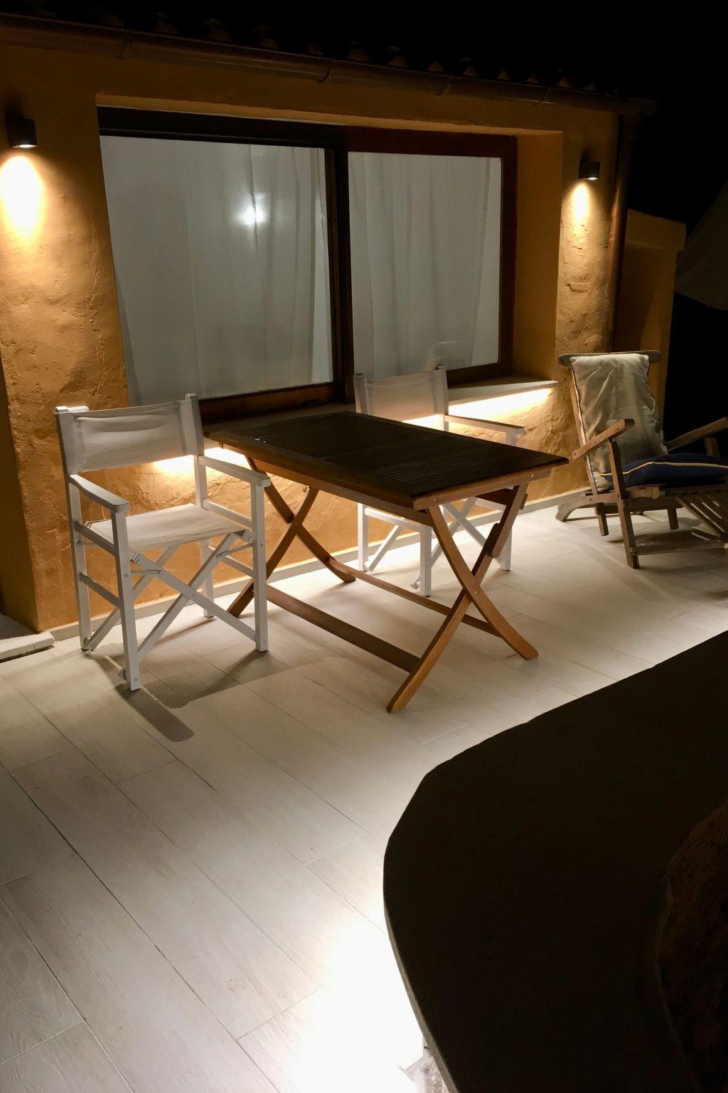 Im Außenbereich liegt eine bezaubernde, private Terrasse, die mit einem Tisch, Stühlen und Liegestühlen ausgestattet ist.