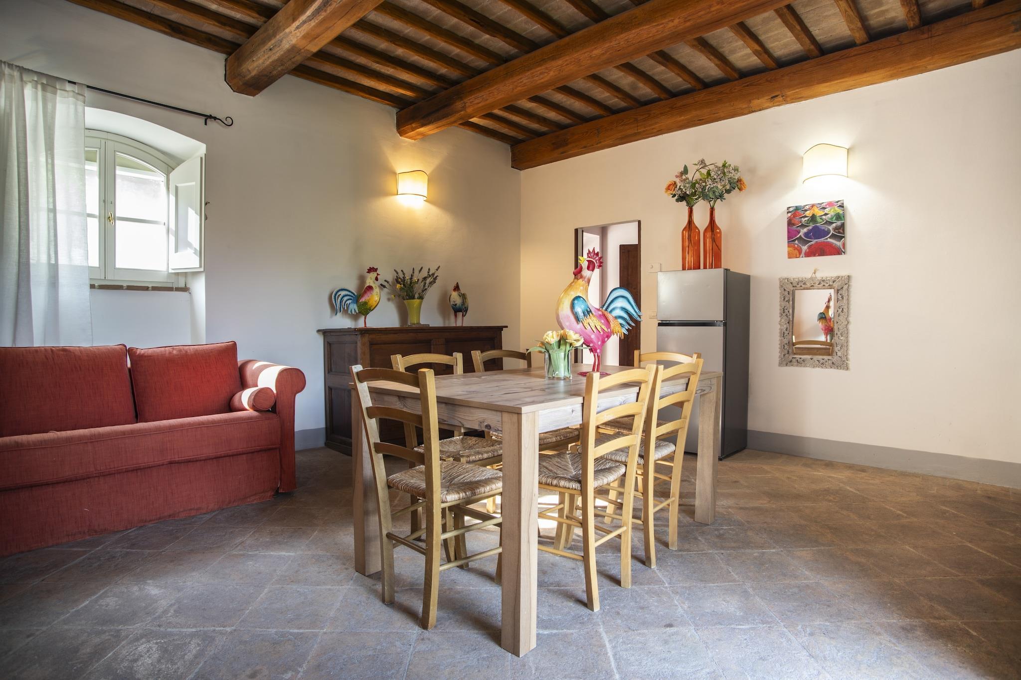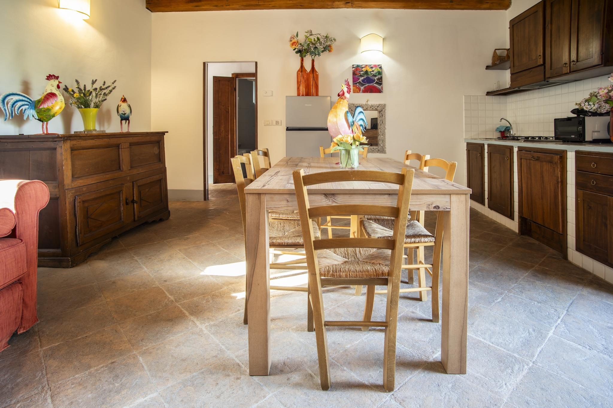 Die Dreizimmerwohnung mit ca. 90 Quadratmetern erstreckt sich über zwei Ebenen und besteht aus einem geräumigen Wohnzimmer mit Esstisch, einer voll ausgestatteten Küche, einem Doppelzimmer, einem Zweibettzimmer, einem Badezimmer mit Dusche und einem Badezimmer mit Badewanne. Im ersten Stock, mit direktem Zugang ins Freie, befindet sich ein Schlafzimmer mit einem Doppelschlafsofa. Eine große Panoramaterrasse mit Sofas, Sonnenschirm und Esstisch steht ebenfalls zur Verfügung. Eingebettet in unberührte Natur und nur wenige Schritte von Assisi entfernt, empfängt das Anwesen seine Gäste in einer charmanten Atmosphäre inmitten von Olivenhainen und Weinbergen mit herrlichem Blick auf den San Francesco-Komplex. Das Bauernhaus, das über eine kurze unbefestigte Straße erreichbar ist, bewahrt den authentischen rustikalen Charme eines umbrischen Bauernhauses und ist in fünf unabhängige Apartments unterteilt – Studios, Apartments mit einem Schlafzimmer und ein geräumiges Apartment mit zwei Schlafzimmern –, die den alchemistischen Elementen Sonne, Mond, Erde, Feuer und Wasser gewidmet sind. Jedes Apartment ist liebevoll eingerichtet und verfügt über eine voll ausgestattete Küche, WLAN, Sat-TV und private Außenbereiche wie Gärten oder Panoramaterrassen. Auf der Wiese, nur wenige Schritte vom Bauernhaus entfernt, befindet sich der Swimmingpool mit möbliertem Gartenbereich. Grillmöglichkeiten, Parkplätze und Mountainbikes stehen für Ausflüge entlang der Franziskanerpfade zur Verfügung. Das Anwesen bietet außerdem kulinarische Erlebnisse mit einem Restaurant, DOP-Wein- und Olivenölverkostungen, Kochkursen, einem Kochservice in der Villa und einem Willkommenspaket für Haustiere. Der hauseigene Bauernhof produziert hervorragende umbrische Weine und Olivenöle, die Ihren Aufenthalt noch authentischer machen.