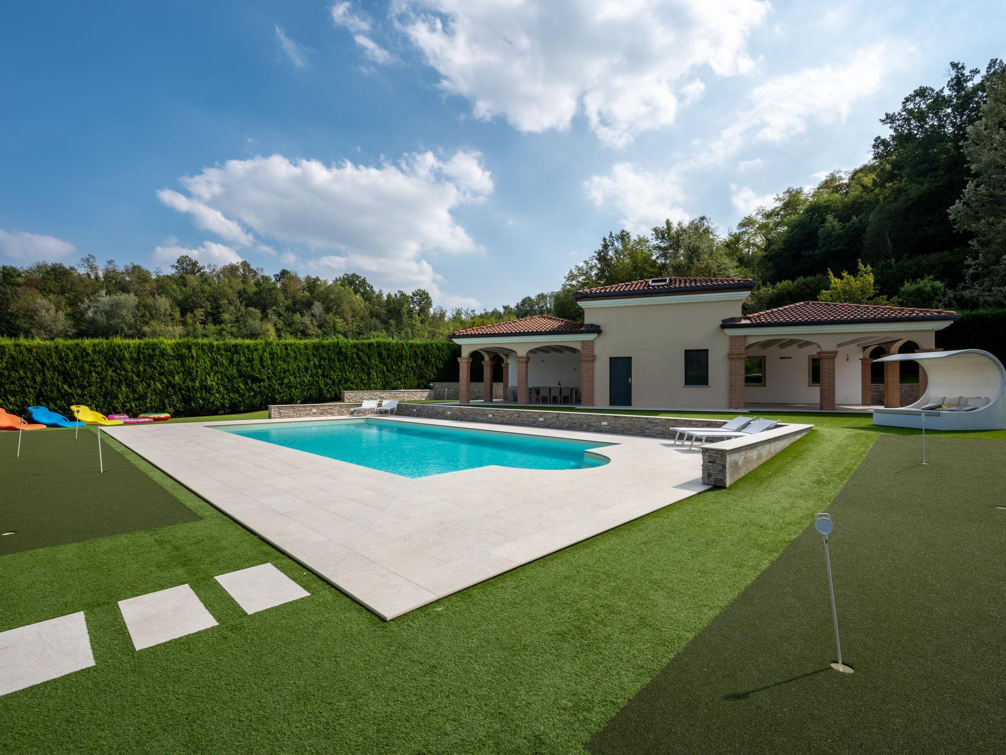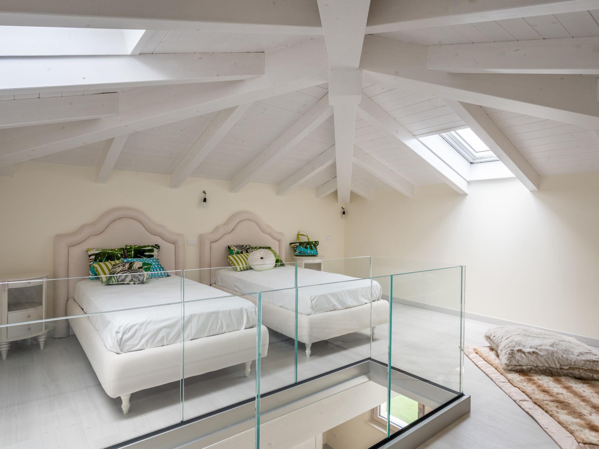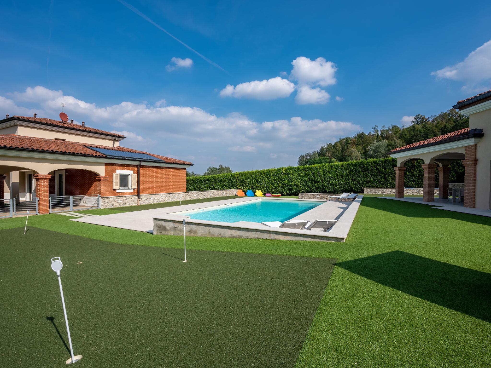 7-Zimmer-Haus 250 m2 auf 2 Stockwerken. Hell, modern und geschmackvoll eingerichtet: Wohn-/Esszimmer mit Esstisch und TV. Ausgang zur Terrasse. 1 Doppelzimmer mit Bad/Bidet/WC und Doppelwaschbecken. Ausgang zum Garten. Wohnzimmer. Ausgang zur Terrasse. Offene Küche (Backofen, Geschirrspüler, 5 Induktionskochplatten, Toaster, Wasserkocher, Tiefkühler, elektrische Kaffeemaschine). Ausgang zur Terrasse. 2 Duschen/Bidet/WC, Doppelwaschbecken. Unteres Geschoss: 1 Zimmer, ohne Fenster mit 1 franz. Bett (160 cm). 1 Zimmer mit 1 x 2 Etagenbetten, 1 Ausziehbett (1 Pers.). Dusche/Bidet/WC, Doppelwaschbecken. Obergeschoss: 1 Zimmer mit begehbarem Kleiderschrank mit 1 franz. Bett (160 cm), Dusche/Bidet/WC. (geländerlose Treppe) 1 offenes Zimmer mit 2 Betten (100 cm, Länge 200 cm), Klimaanlage. Keine Heizmöglichkeit. Parkettboden. Terrasse 30 m2, überdacht Terrasse 50 m2, überdacht. Terrassenmöbel, Gartengrill, Liegestühle. Zur Verfügung: Waschmaschine, Babybett. Internet (WLAN, gratis). Bitte beachten: Nichtraucher-Haus. Keine interne Verbindung zwischen den separaten Wohneinheiten. Kleiner Golfübungsplatz (Driving Range) auf dem privaten Grundstück. IT005106C2YJ9AVVDP