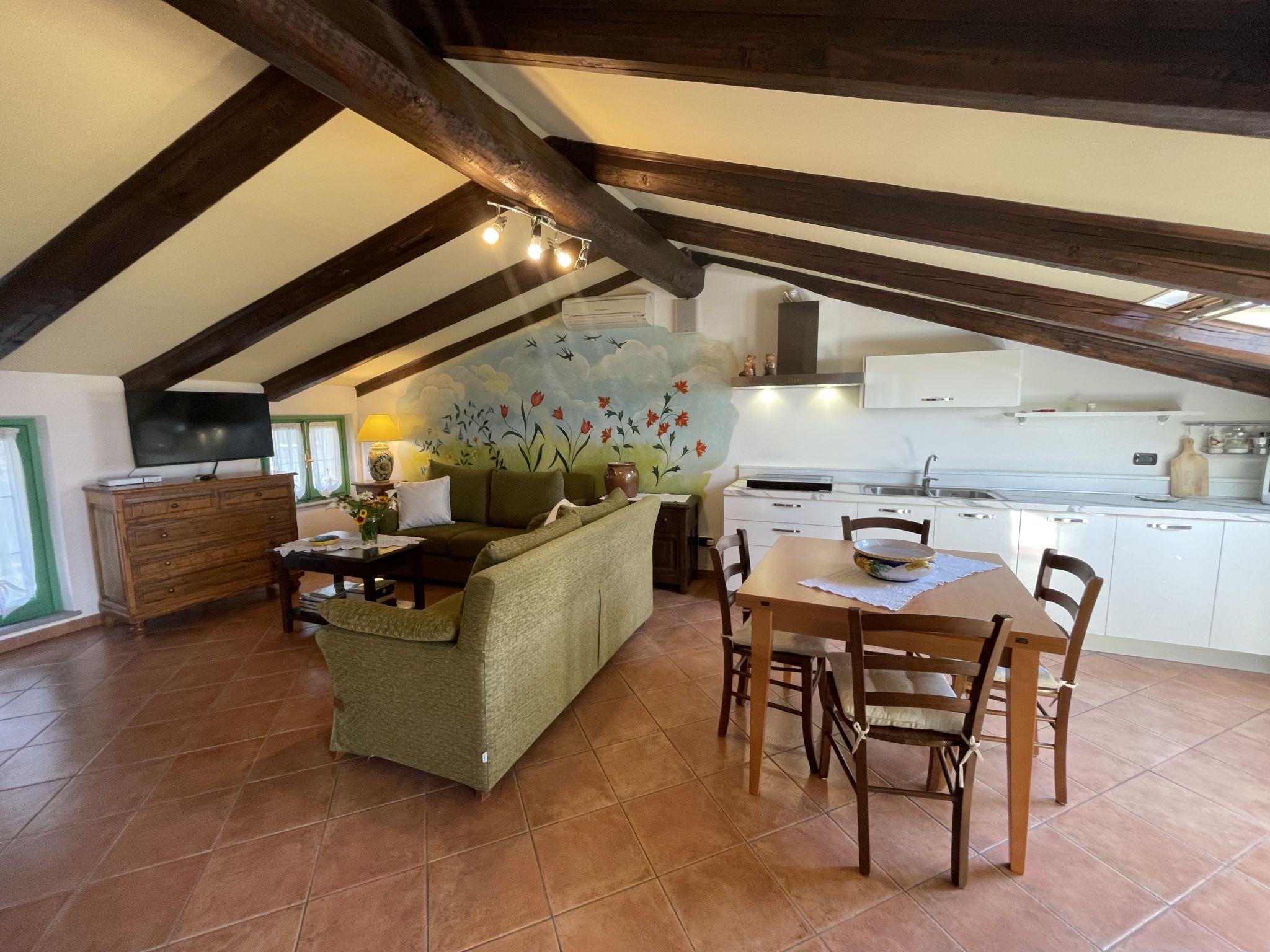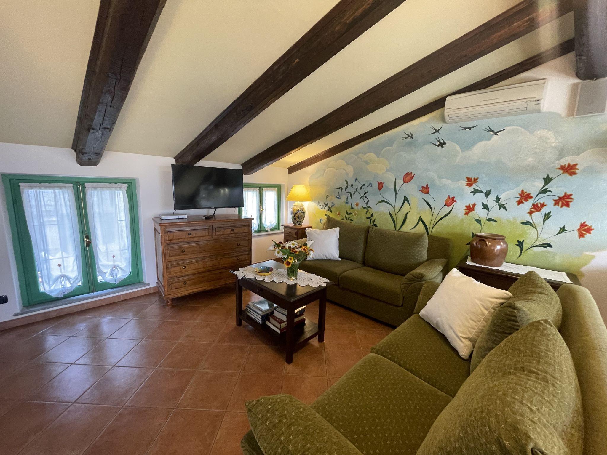 2-Zimmer-Wohnung 80 m2, im Dachgeschoss. Renoviert im Jahre 2023, geschmackvoll und gemütlich eingerichtet: abgeschrägtes Wohnzimmer mit Esstisch, Sat-TV und CD. Ausgang zur Terrasse. 1 abgeschrägtes Zimmer mit 1 franz. Bett (160 cm). Abgeschrägte, kleine, offene Küche (4 Flammen, Toaster, Mikrowelle, elektrische Kaffeemaschine). Dusche/WC. (extra), Klimaanlage, Fussbodenheizung. Heizung nur verfügbar von 01.10. bis 26.04. Natursteinboden. Terrasse, Gartensitzplatz. Terrassenmöbel, Gartengrill. Panoramasicht. Zur Verfügung: Waschmaschine. Internet (WLAN, gratis). Maximal 1 Haustier/Hund erlaubt. IT005075C25G7RPYIL