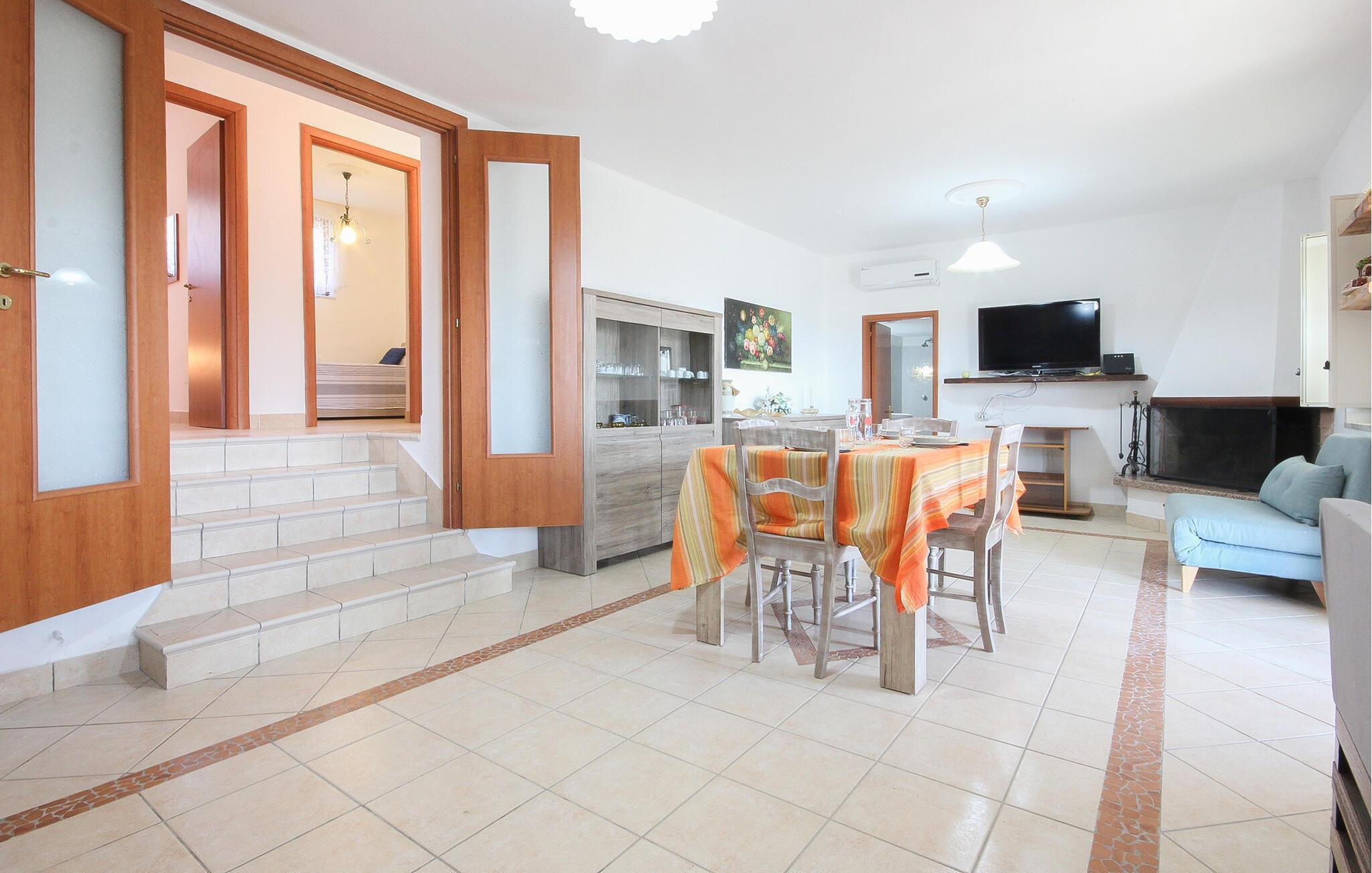 Dieses ebenerdig erbaute Domizil begrüßt Sie inmitten einer wunderschönen Landschaft und verwöhnt Sie mit viel Ruhe und einem herrlichen Panoramablick. Bereiten Sie in der offenen Küche köstliche Mahlzeiten zu und planen Sie gemeinsam Ihre Unternehmungen am einladenden Esstisch. Nach einem langen Tag können Sie bei einem Film entspannen, einen geselligen Spieleabend veranstalten oder sich in Ihre Urlaubslektüre vertiefen.