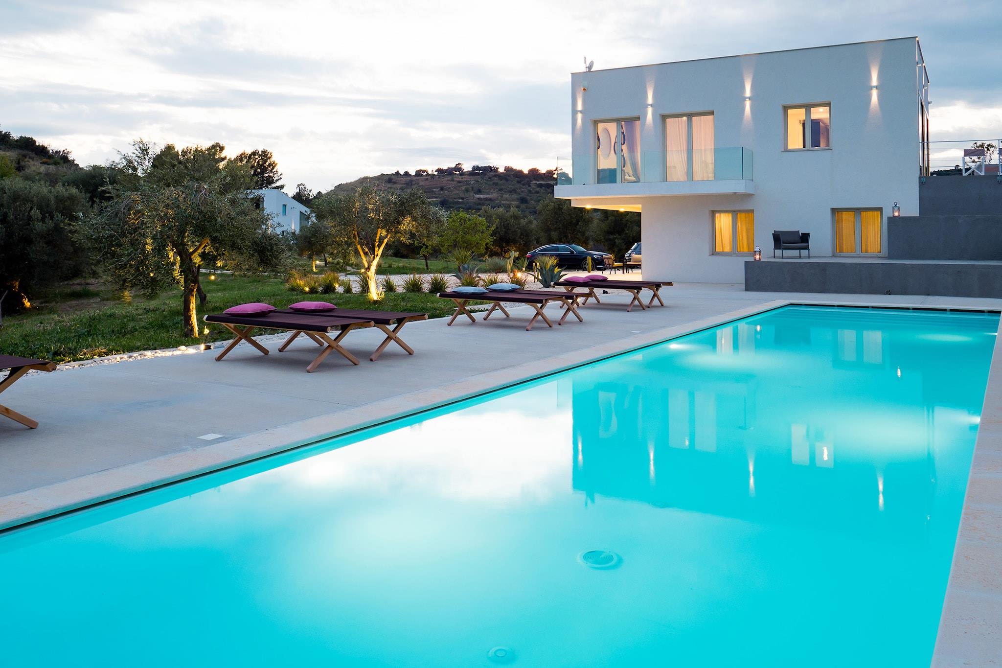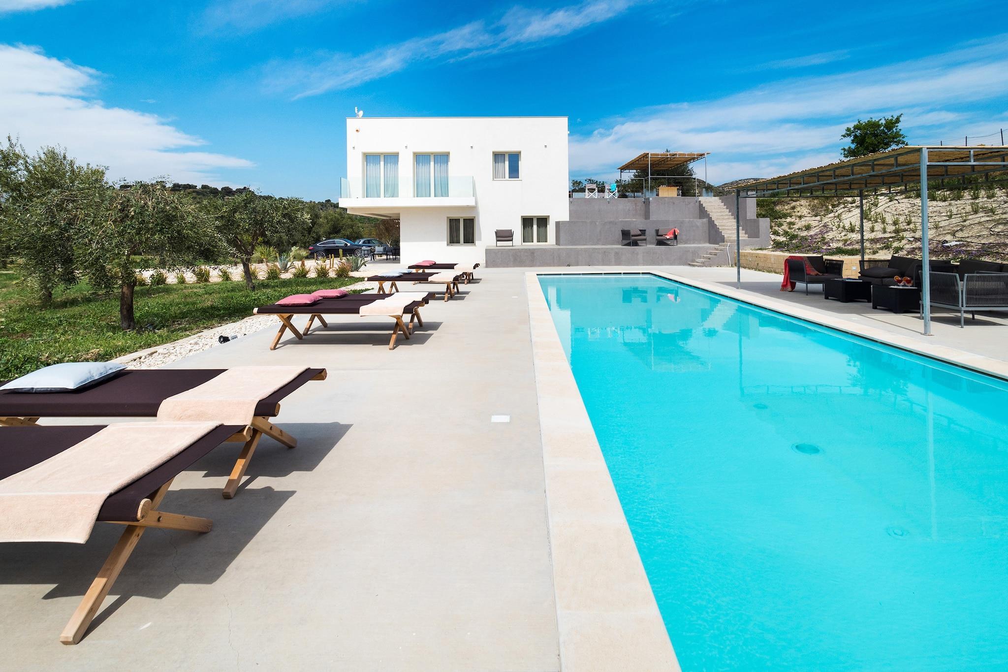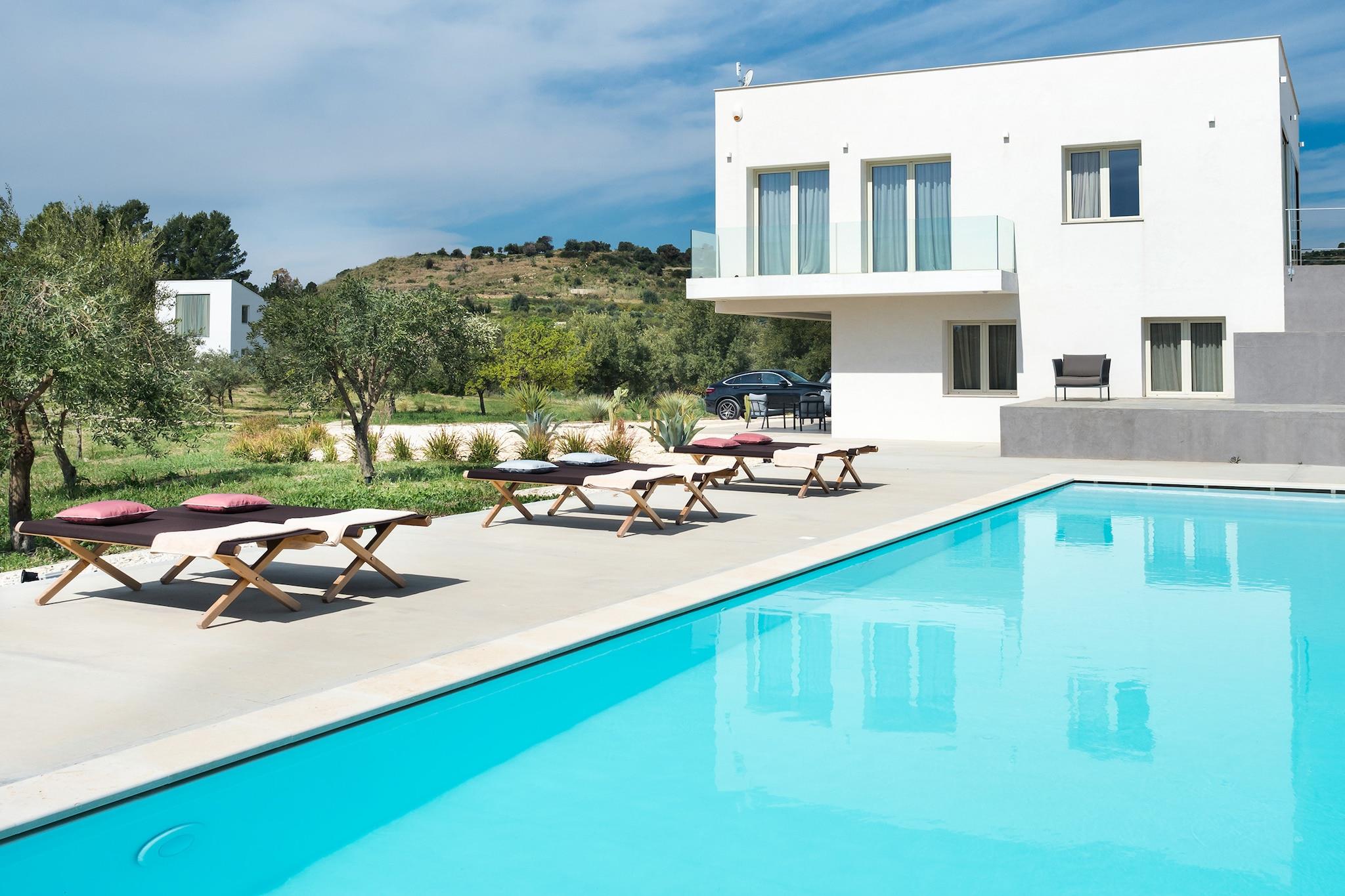 Luxuriöse Villa mit privatem Pool in der Nähe von Noto, einer alten und charmanten Barockstadt, 30 km südlich von Syrakus. Die Unterkunft befindet sich in Panoramalage und bietet einen bezaubernden Blick auf die umliegende Landschaft und das Meer. Entspannen Sie in absoluter Ruhe durch den charakteristischen Naturgarten, den schönen beheizten Pool und die großen und gut ausgestatteten Terrassen. Von dieser charmanten Traumvilla aus erreichen Sie die Strände von Calamosche, San Lorenzo und Fontane Bianche, die schönen Barockstädte Noto, Syrakus, Palazzolo Acreide, Modica, Scicli und Ragusa sowie die Naturschutzgebiete Vendicari und Cavagrande del Cassibile. Die kürzlich gebaute, moderne Villa ist in zwei Gebäude aufgeteilt, die sich auf zwei Ebenen befinden. Die Hauptvilla besteht aus zwei eleganten Suiten mit einem Doppelbett und einem Badezimmer mit Dusche im Erdgeschoss. In der ersten Etage, die durch interne und externe Treppen miteinander verbunden ist, gibt es ein großes und helles Wohnzimmer mit Wohn- und Esszimmer, eine moderne Küche, ein Servicebad und ein zusätzliches Doppelzimmer mit eigenem Bad. Das Nebengebäude besteht im Erdgeschoss aus einem Wohnzimmer mit Küchenzeile, einem Einzelzimmer und einem Badezimmer, während sich im ersten Stock das fünfte Schlafzimmer mit einem eigenen Badezimmer befindet. Das luxuriöse Interieur ist wunderschön eingerichtet und mit allen modernen Annehmlichkeiten ausgestattet, darunter Klimaanlage, WLAN-Internetzugang, Sat-Receiver, 4 TVs, Waschmaschine, 2 Öfen und 2 Geschirrspüler.