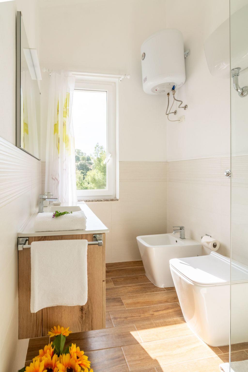 Im Außenbereich wartet ein prächtiger Garten mit typisch mediterraner Macchia, blühenden Blumen und Pflanzen auf Sie. Ein großer, privater Parkplatz vor dem Haus macht die Anreise besonders komfortabel.