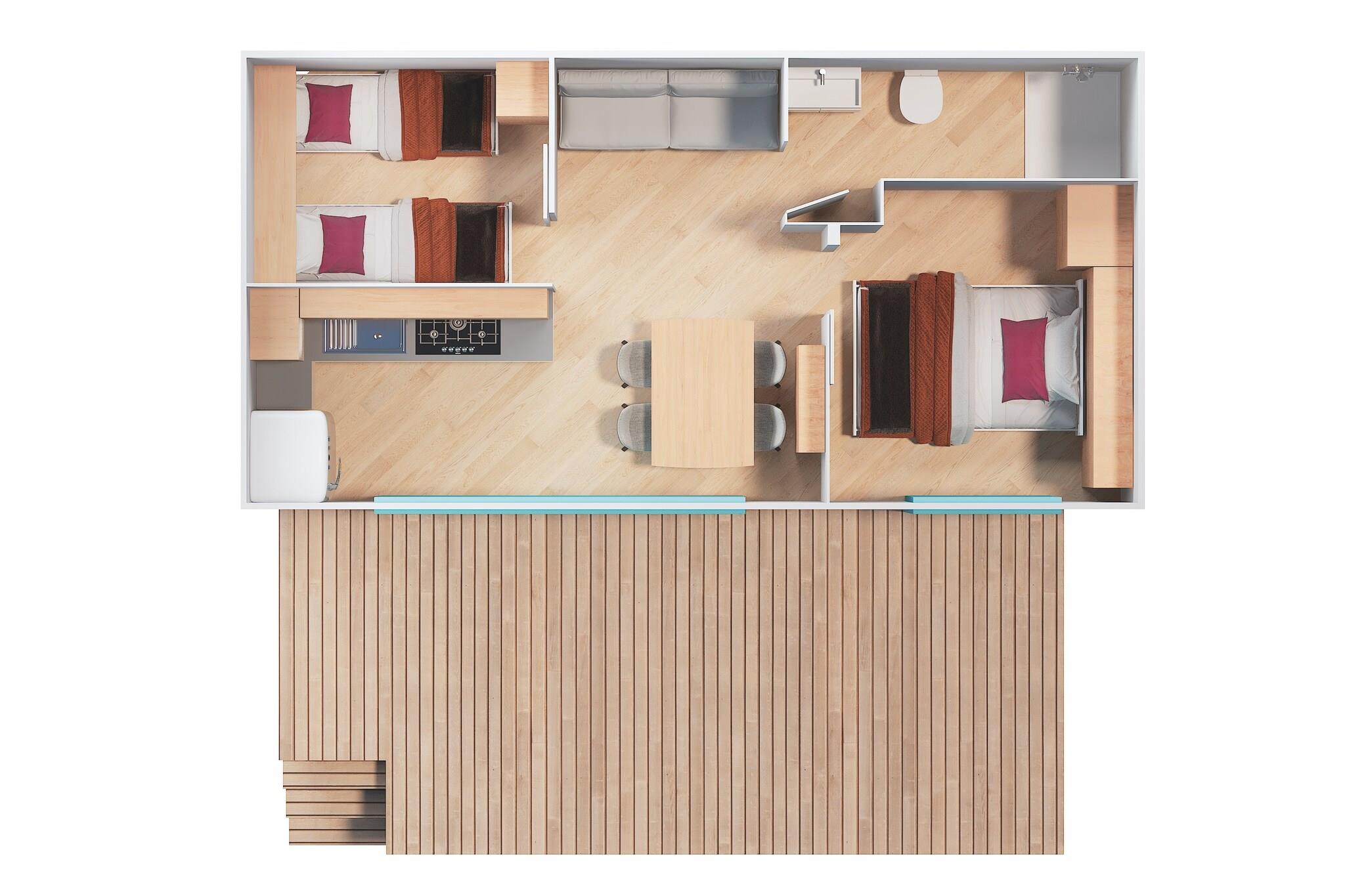 Eingebettet in den ruhigen Pinienwald des Baia Domizia Camping Village bietet dieses moderne und frisch eingerichtete Chalet einen ruhigen Rückzugsort am wunderschönen Golf von Neapel. Das komfortable Chalet verfügt über zwei gemütliche Schlafzimmer, eine gut ausgestattete Küchenzeile, Klimaanlage (gegen Gebühr) und eine private Terrasse mit Gartenmöbeln. Ob Sie mit einem Buch im Schatten entspannen oder auf Ihren eigenen Liegen sonnenbaden – die Umgebung verbindet Outdoor-Leben mit heimeligem Komfort – perfekt für Paare oder kleine Familien. Alles, was Sie für einen unvergesslichen Urlaub brauchen, ist in Reichweite. Tauchen Sie ein in den großen Pool mit Panoramablick auf das Meer oder verbringen Sie entspannte Tage am 1 km langen Privatstrand mit goldenem Sand. Genießen Sie Aktivitäten wie Tennis, Fußball und Gruppenfitness im hauseigenen Fitnessstudio oder lassen Sie Ihre Kinder im lebhaften Miniclub und beim Unterhaltungsprogramm vergnügen. Ein Einkaufszentrum, Restaurants und Bars befinden sich auf dem Campingplatz und bieten Komfort und kulinarische Vielfalt – Pizza aus dem Holzofen, Meeresfrüchtegerichte aus der Küste und erfrischendes Eis sind nur wenige Schritte entfernt. Der Campingplatz ist ideal für Abenteuer und bietet den idealen Ausgangspunkt für die Erkundung der Wunder Kampaniens. Unternehmen Sie Tagesausflüge nach Neapel, zum archäologischen Wunder Pompeji oder segeln Sie zu den traumhaften Inseln Capri, Ischia und Ponza. Ob Sie Geschichte, Strandtage oder Familienspaß suchen – hier erwartet Sie ein unvergesslicher Urlaub in Süditalien.