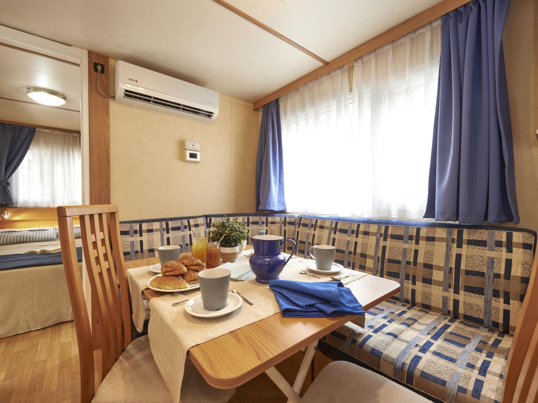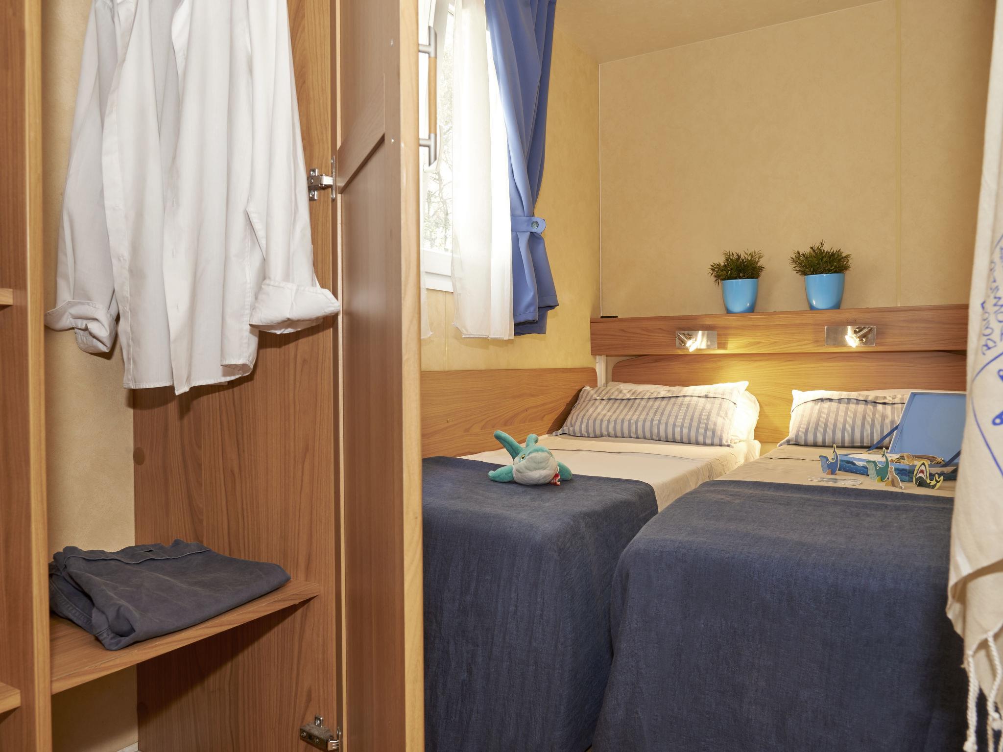 "Deluxe", 3-Zimmer-Mobilheim 25 m2. Objekt geeignet für 4 Erwachsene + 2 Kinder. Zweckmässig eingerichtet: Wohn-/Schlafzimmer mit 1 Doppeldiwanbett (140 cm), Esstisch, Küchenblock, Sat-TV und Klimaanlage. Ausgang zur Terrasse. 1 Zimmer mit 1 franz. Bett (140 cm), sep. WC. 1 Zimmer mit 2 Betten (70 cm). Offene Küche (4 Flammen). Dusche/WC. Klimaanlage (extra). Keine Heizmöglichkeit. Terrasse überdacht. Terrassenmöbel, Liegestühle (1). Parkplatz (1 Auto). Bitte beachten: Nichtraucher-Unterkunft. IT061088B3LUIBMCPY