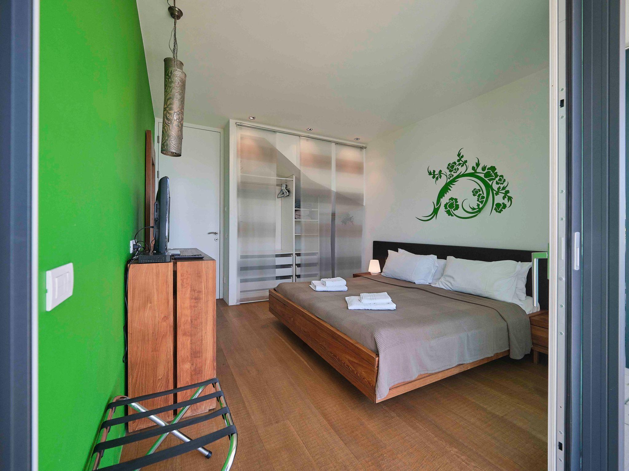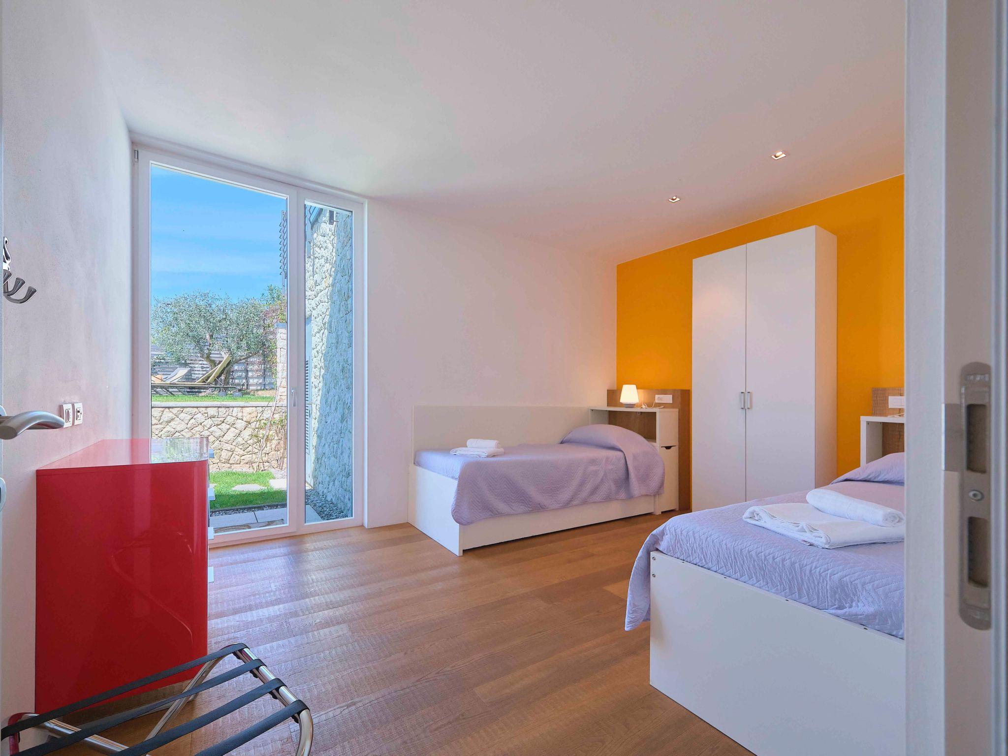 Die Villa ist vertikal in 2 Wohnungen aufgeteilt. Wir vermieten das Haus mit Blick auf das Schwimmbad (3,5 x 10 Meter), das maximal 8 Personen beherbergen kann. Der Eingang befindet sich im Obergeschoss und besteht aus einem Wohnzimmer mit Sofa (umwandelbar in ein Schlafsofa 160 x 200 cm), Essbereich mit Kochnische und einem Badezimmer. Im Erdgeschoss, das über eine bequeme Treppe zu erreichen ist, befinden sich 3 Schlafzimmer, von denen zwei mit einem Doppelbett 180 x 200 cm ausgestattet sind, während das dritte Schlafzimmer 2 Einzelbetten und 2 weitere Klappbetten darunter hat. Auf der gleichen Etage befinden sich auch 2 große Badezimmer, beide mit Dusche. Die Küche ist brandneu und mit Geschirrspüler, Induktionskochfeld, Backofen, Kühlschrank und Gefrierschrank ausgestattet. Das Anwesen ist mit Klimaanlage, Sat-TV, Wi-Fi, elektrische Rollläden, elektrische Markisen auf der Terrasse und Grill ausgestattet.