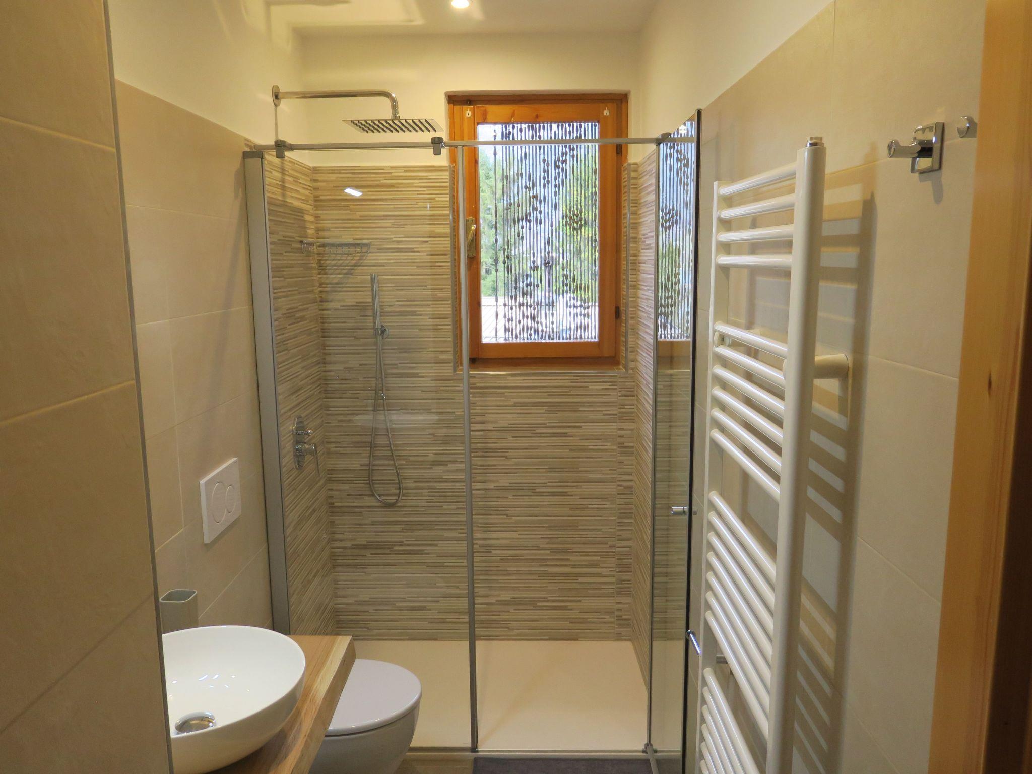 Das Innere der Wohnung ist gepflegt und gemütlich. Im ersten Stock befindet sich ein Wohnzimmer, das mit einem Tisch, Bänken und Stühlen, einem bequemen Sofa und einem Satellitenfernseher ausgestattet ist. Die Küchenzeile ist komplett ausgestattet mit Kühlschrank, Gefrierschrank, Backofen, Induktionskochfeld und Geschirrspüler. Nicht zu vergessen die Kaffeemaschine, unverzichtbar für einen guten Start in den Tag. Ein Schlafzimmer mit Doppelbett und Balkon sowie ein Badezimmer mit geräumiger Dusche und Toilette vervollständigen diese Etage. Über die interne Holztreppe gelangt man in das Dachgeschoss, wo sich zwei weitere Doppelschlafzimmer und ein zweites Bad mit Dusche und WC befinden.