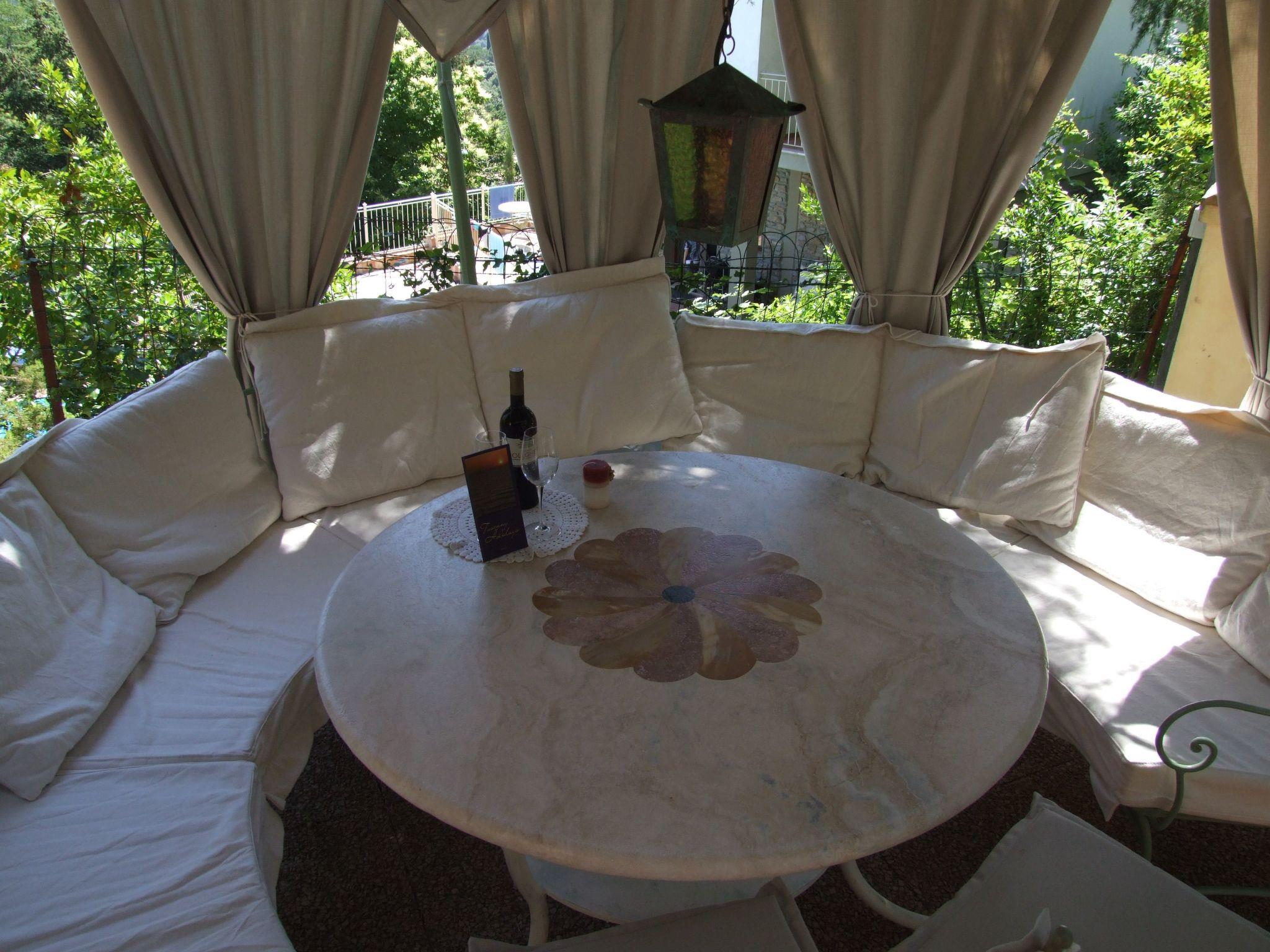 Vor diesem Eingang befindet sich ein Pavillon mit einem Marmortisch und schmiedeeisernen Sofas mit bequemen Kissen. Der private Garten der Wohnung ist außerdem mit einem Grill, einer Außendusche und zwei Liegestühlen ausgestattet. Wenn man das Wohnzimmer betritt, befindet sich auf der linken Seite die gut ausgestattete Küche mit Gasherd, Gasofen, Kühl-/Gefrierschrank, Geschirrspüler, Toaster und Mokka- und Filterkaffeemaschine. Vor der Küche steht ein Holztisch mit sechs Stühlen. Im Wohnzimmer befindet sich auch ein Sofa, das in ein Doppelbett oder zwei Einzelbetten umgewandelt werden kann.
