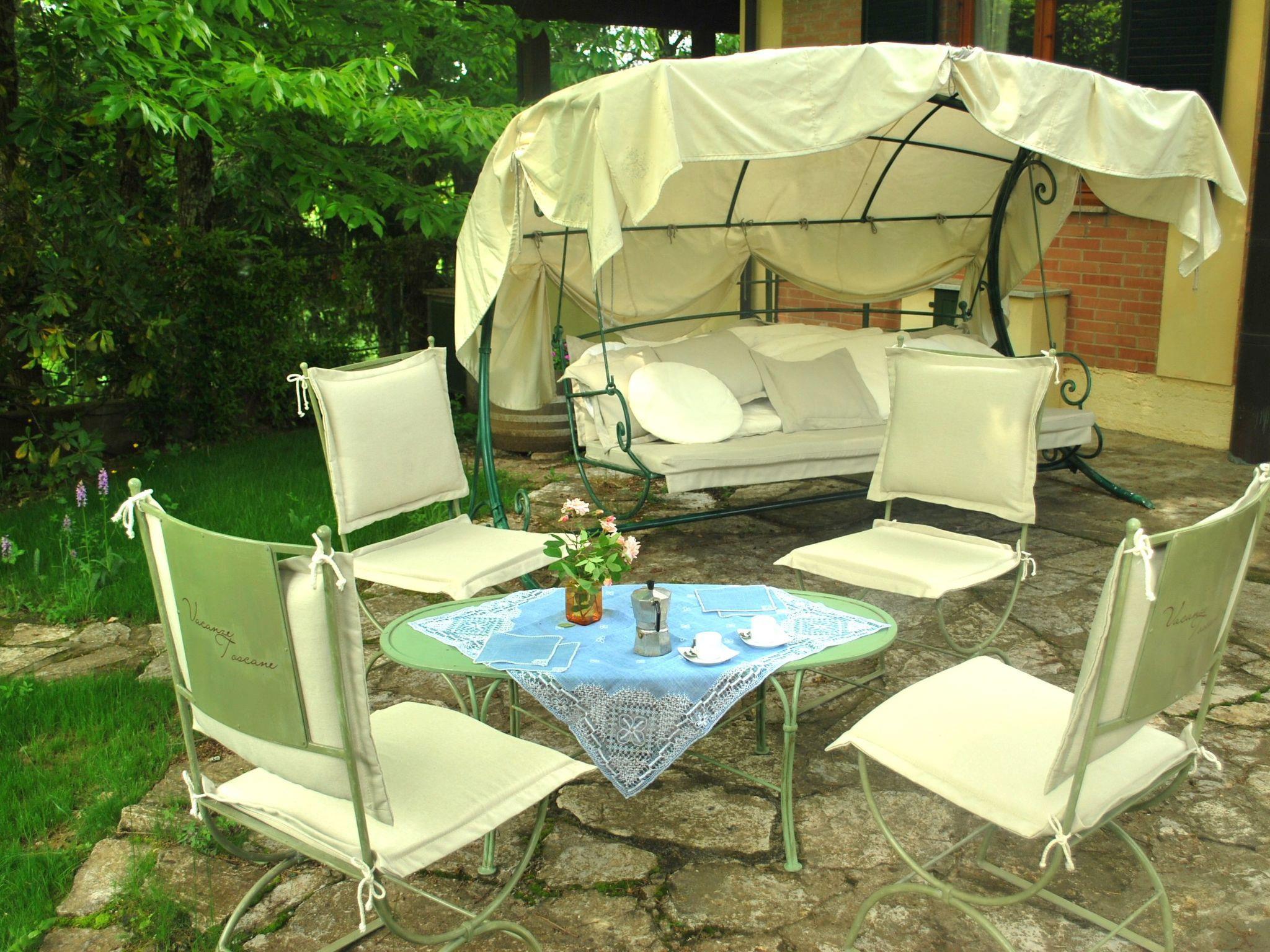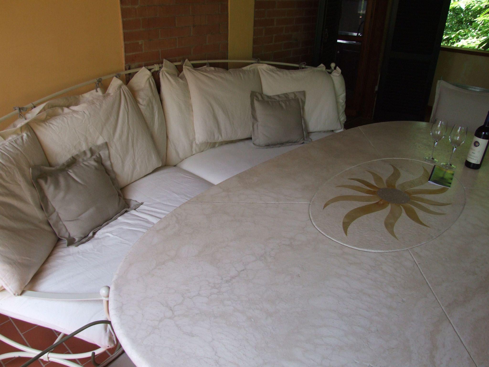 Vom Wohnzimmer aus gelangt man auf die überdachte Terrasse, die von einem grünen Kastanienbaum beschattet wird und ideal für Mahlzeiten im Freien ist. Sie ist mit einem Marmortisch und schmiedeeisernen Stühlen sowie einem Sofa mit bequemen Kissen ausgestattet. Vom Wohnzimmer aus gelangt man zu den beiden Schlafzimmern (eines davon mit einem Zusatzbett) mit eigenem Bad.