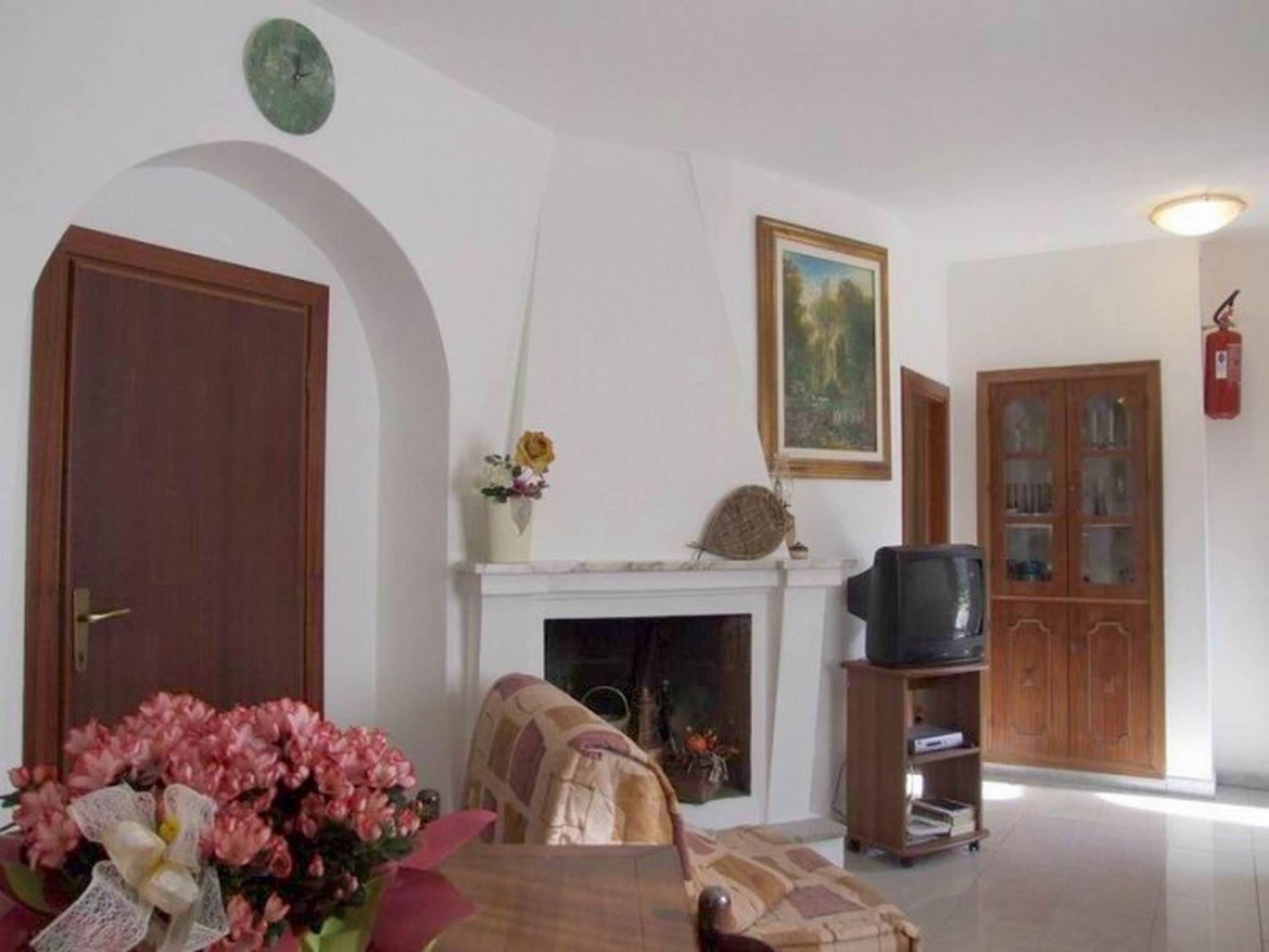 Das Wohnzimmer ist mit einem Schlafsofa und einem Kamin ausgestattet, während sich auf der linken Seite die gut ausgestattete Küche mit Gasherd, Gasofen, Geschirrspüler, Kühlschrank mit Gefrierfach, Toaster und Mokka- und Filterkaffeemaschine befindet. Zwischen dem Kamin und der Kochnische befindet sich ein Tisch für 8 Personen.