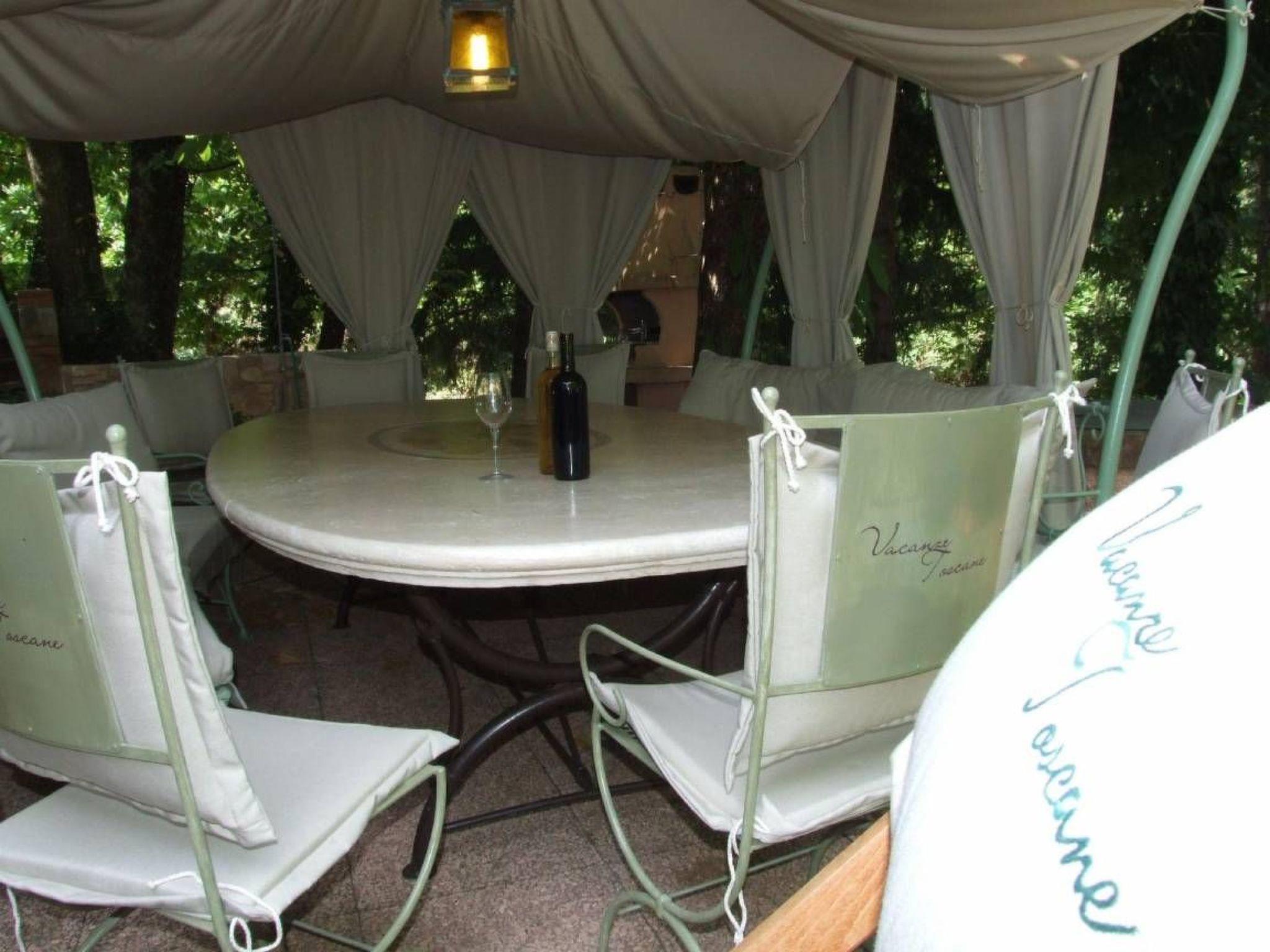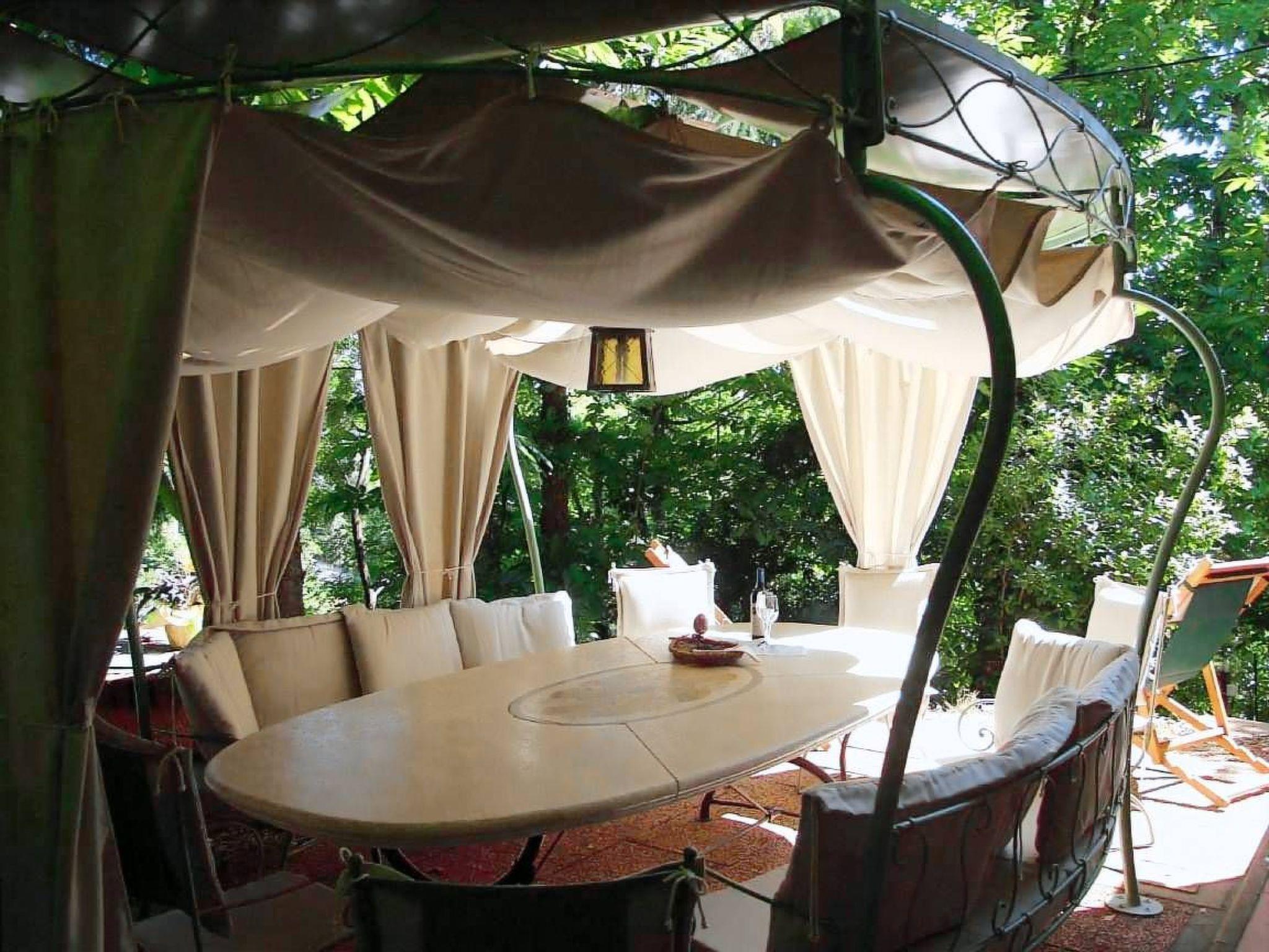 Vor diesem Eingang befindet sich ein Pavillon für Mahlzeiten im Freien mit einem Marmortisch und schmiedeeisernen Sofas mit bequemen Kissen.
