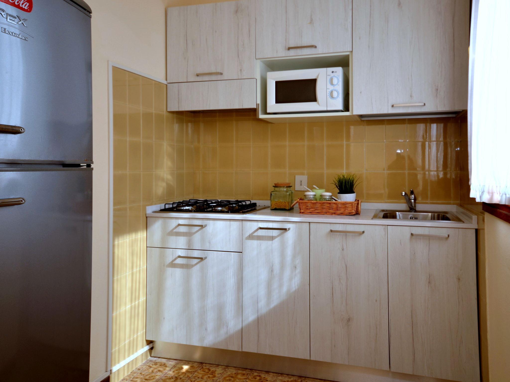 3-Zimmer-Wohnung 45 m2, im Obergeschoss. Teilweise renoviert im Jahre 2020, zweckmässig eingerichtet: Wohn-/Schlafzimmer mit 1 Diwanbett, Esstisch und Sat-TV. 1 Zimmer mit 1 Bett und 1 Doppelbett. 1 Zimmer mit 1 x 2 Etagenbetten. Kochnische (4 Flammen, Mikrowelle, Tiefkühler, elektrische Kaffeemaschine). Dusche/Bidet/WC. Klimaanlage, Warmluftheizung. Kleiner Balkon. Zur Verfügung: Safe, Kinderhochstuhl, Babybett bis 2 Jahre (extra). Maximal 1 Haustier/Hund erlaubt. IT027034B43D33MABG