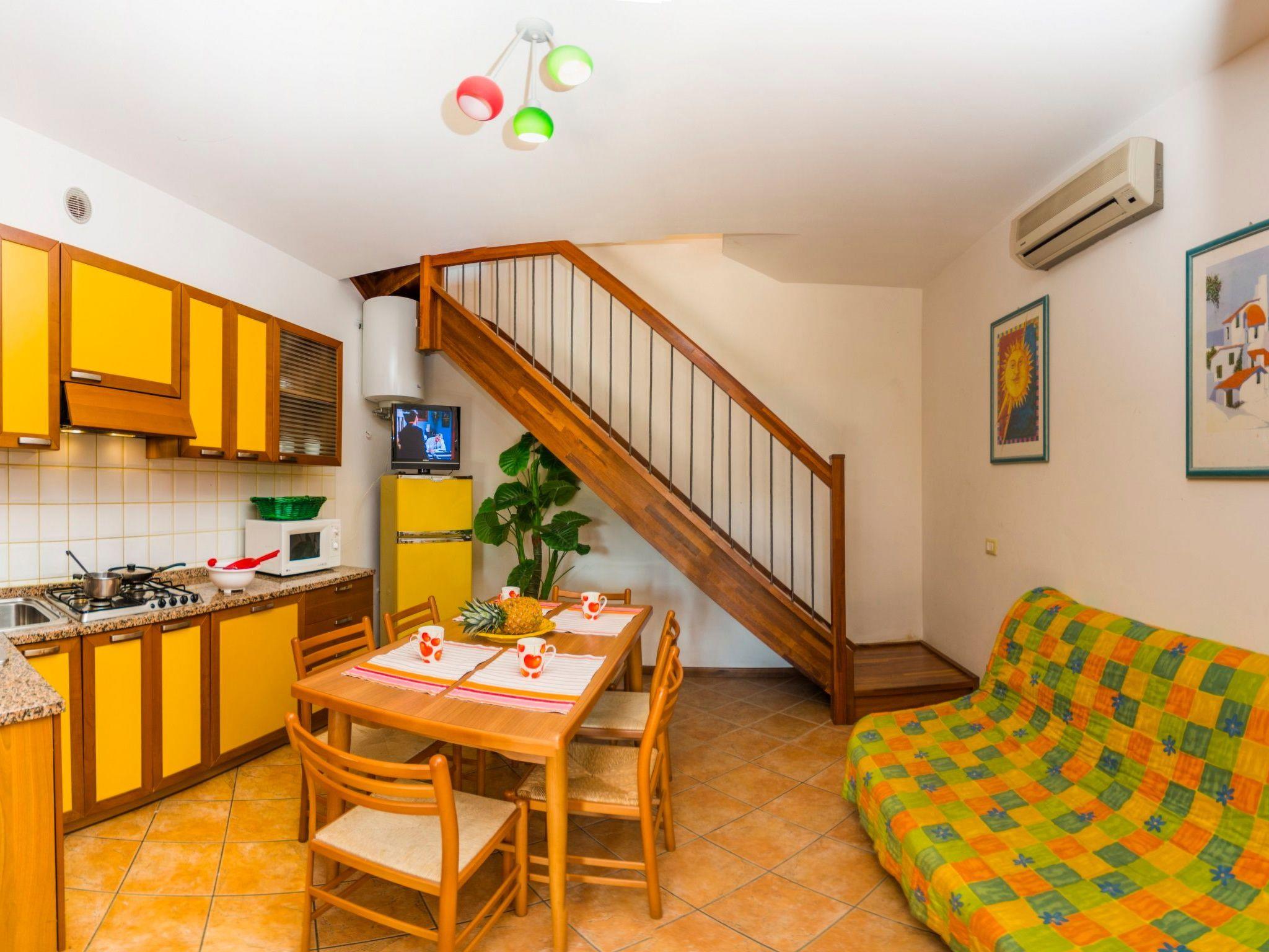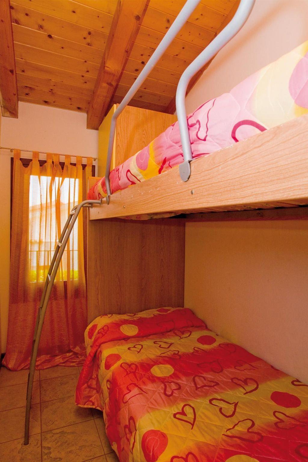 Ogni villetta, disposta su due piani, al piano terra trovate un accogliente soggiorno con divano letto, affiancato da un angolo cottura perfettamente attrezzato con fornelli a gas, un grande frigorifero, aria condizionata, lavatrice e TV. Al primo piano, le sistemazioni continuano con due camere da letto, una con letto matrimoniale e l'andere ideal für Kinder mit Etagenbetten, sowie ein Badezimmer mit Duschkabine.