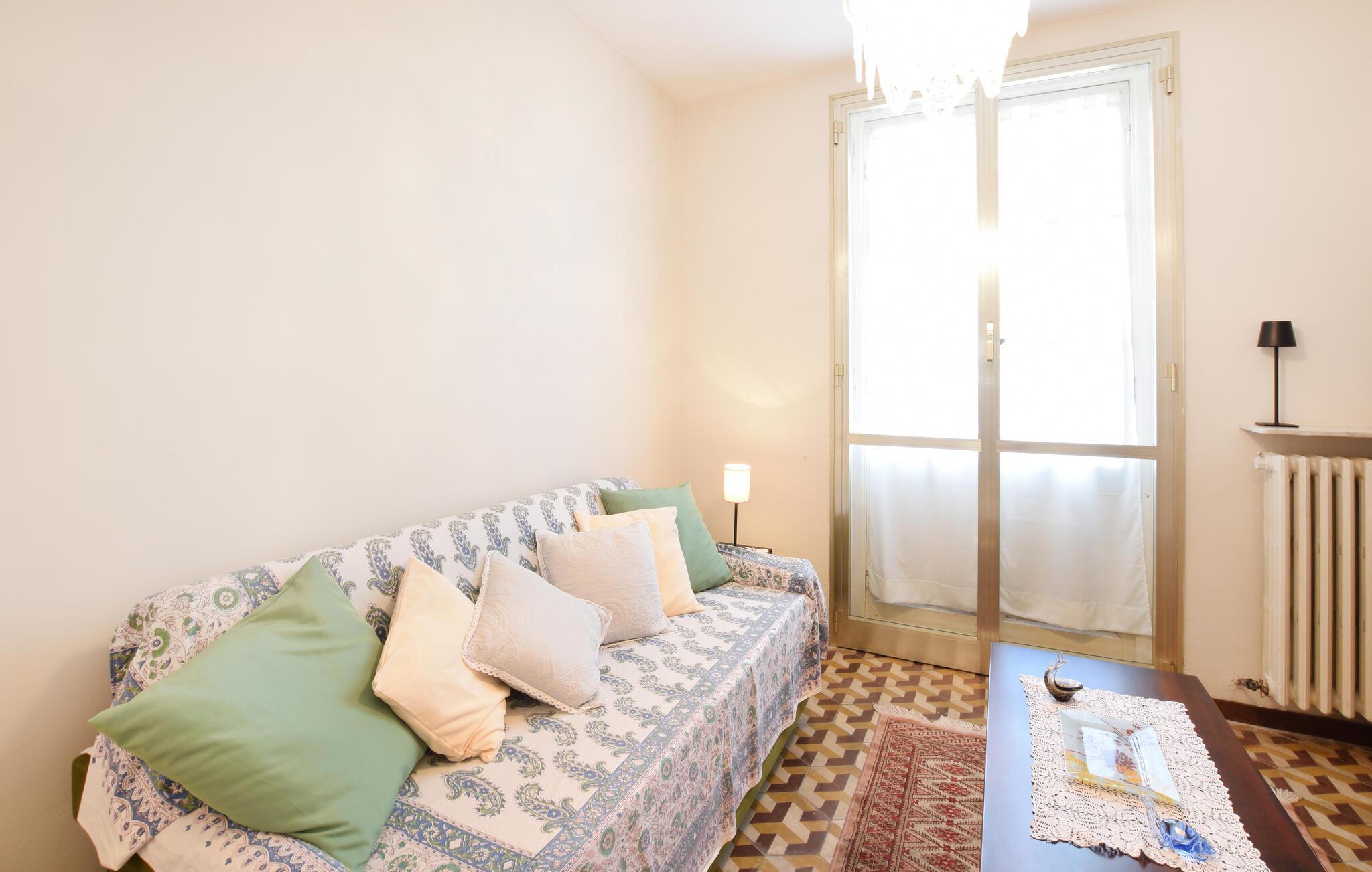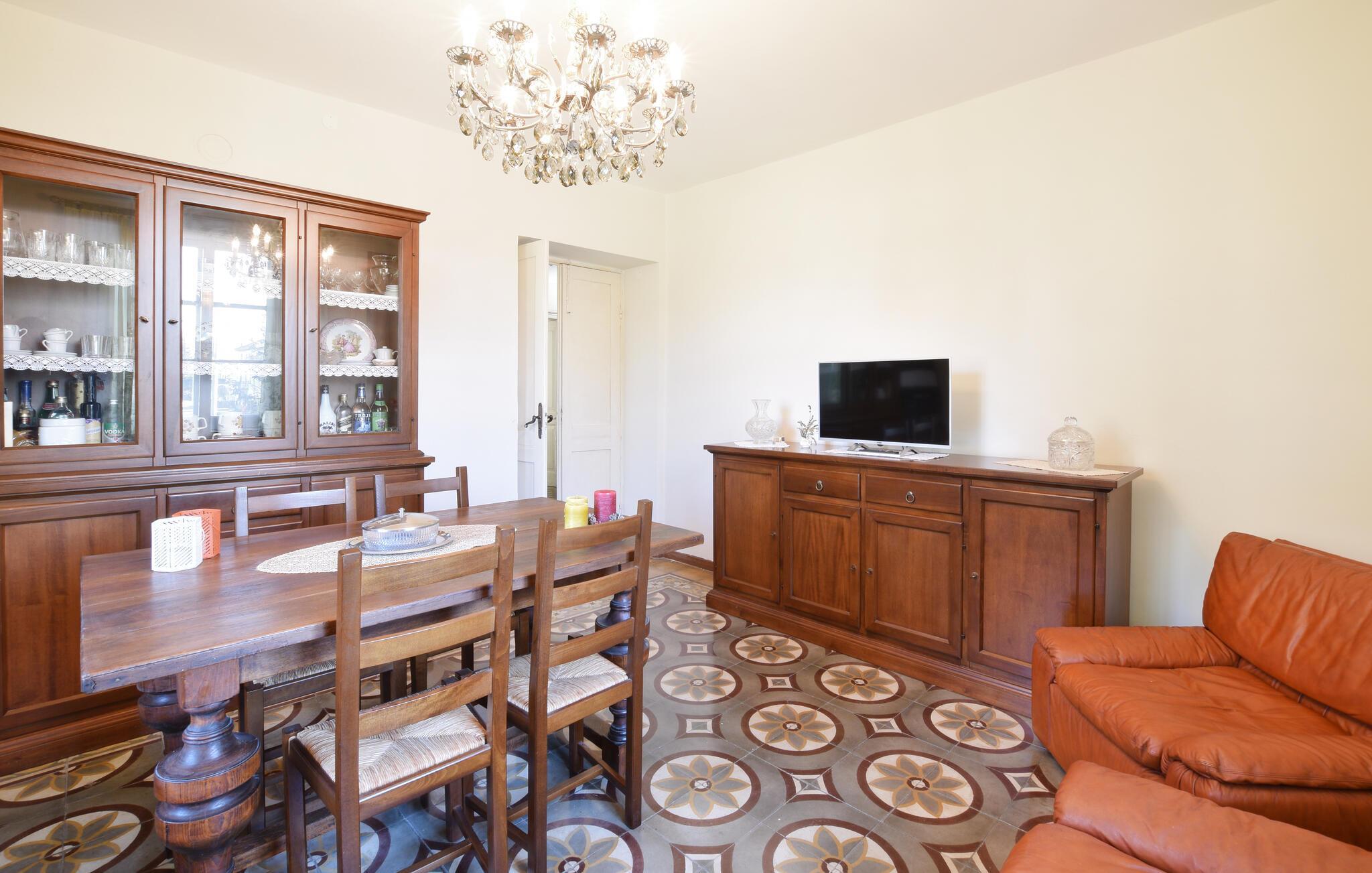 Genießen Sie gemeinsame Zeit im gemütlichen Innenbereich dieser einladenden Ferienwohnung, der mit warmen Farben und liebevollen Details besticht. Kochen Sie gemeinsam in der voll ausgestatteten Küche mit Retro-Touch, und genießen Sie Ihre Mahlzeiten am einladenden Esstisch mit Blick auf die grünen Bäume. Legen Sie nach einem ereignisreichen Tag auf dem bequemen Sofa die Füße hoch und widmen Sie sich einem spannenden Buch oder veranstalten Sie einen Spieleabend.