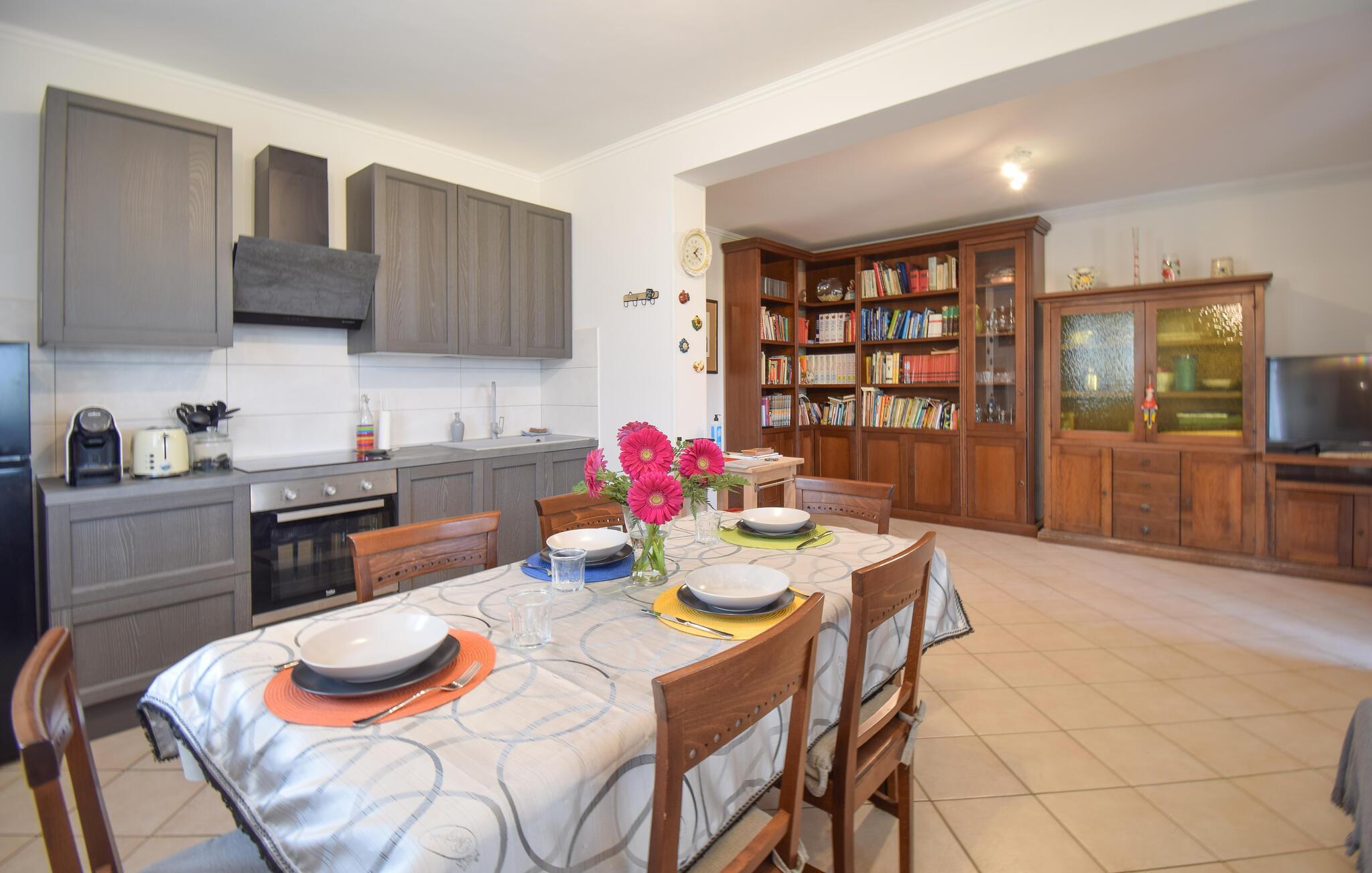 Willkommen in dieser geräumigen und freundlichen Ferienwohnung, die Sie mit einer behaglichen Wohnatmosphäre und einem schönen Blick auf die Landschaft begrüßt. Genießen Sie hier harmonische Mahlzeiten mit Ihren Liebsten, planen Sie Ihre Unternehmungen am einladenden Esstisch, schmökern Sie in der Bibliothek und streamen Sie abends eine spannende Serie, die allen zusagt.