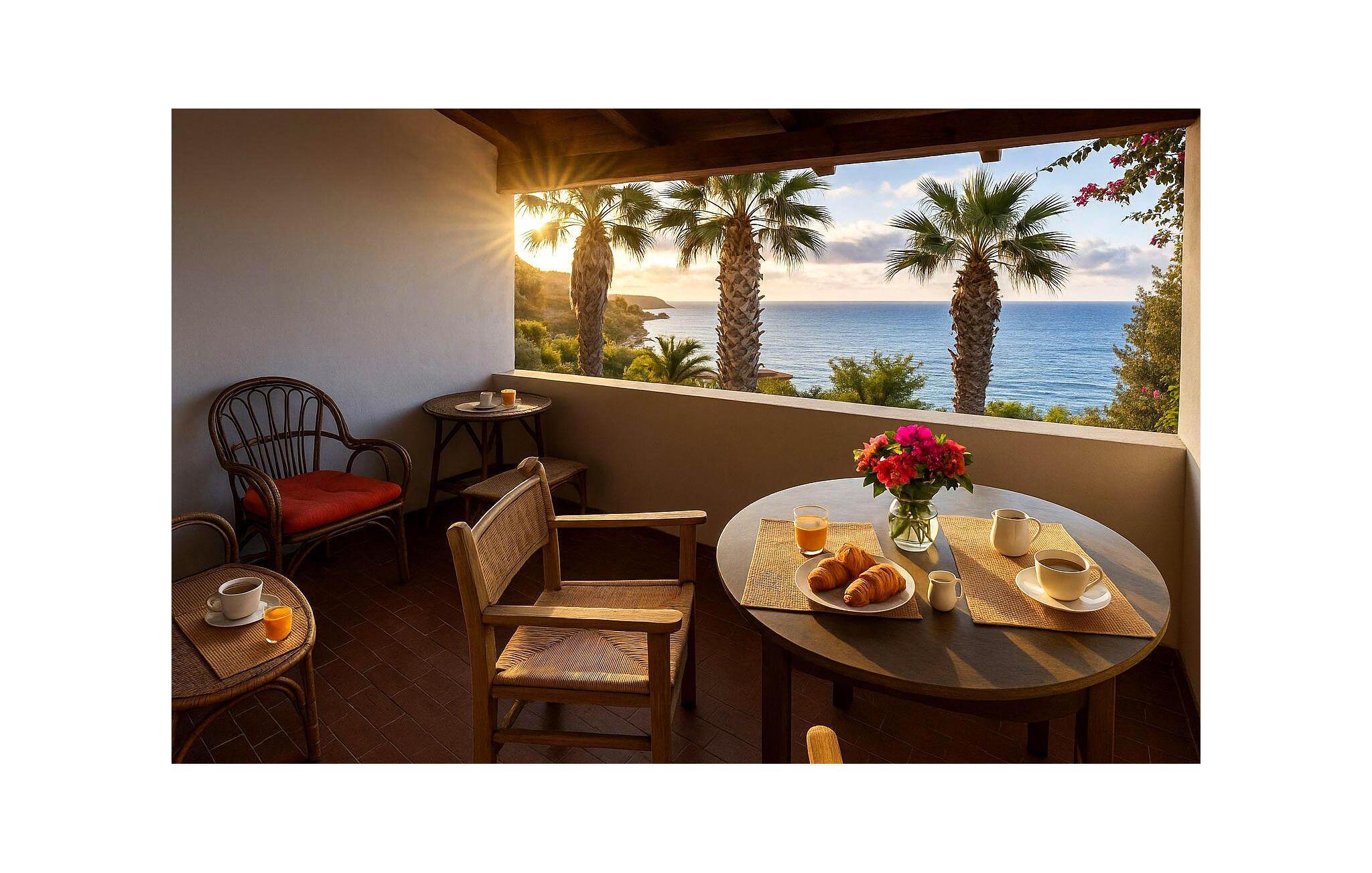 Ihr schöner Balkon ist der ideale Ort für ein Frühstück mit Blick auf Palmen und das Meer. An lauen Sommerabenden können Sie hier bei einem Glas Wein bis in die Nacht hineinplaudern und die mediterrane Atmosphäre auf sich wirken lassen.