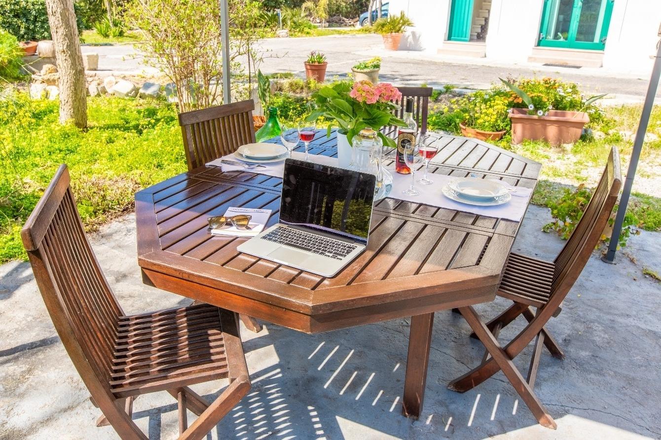 Sie haben private Räume: einen Pavillon im Garten mit Esstisch und einen Balkon in der Küche mit Sesseln und Frühstückstisch;