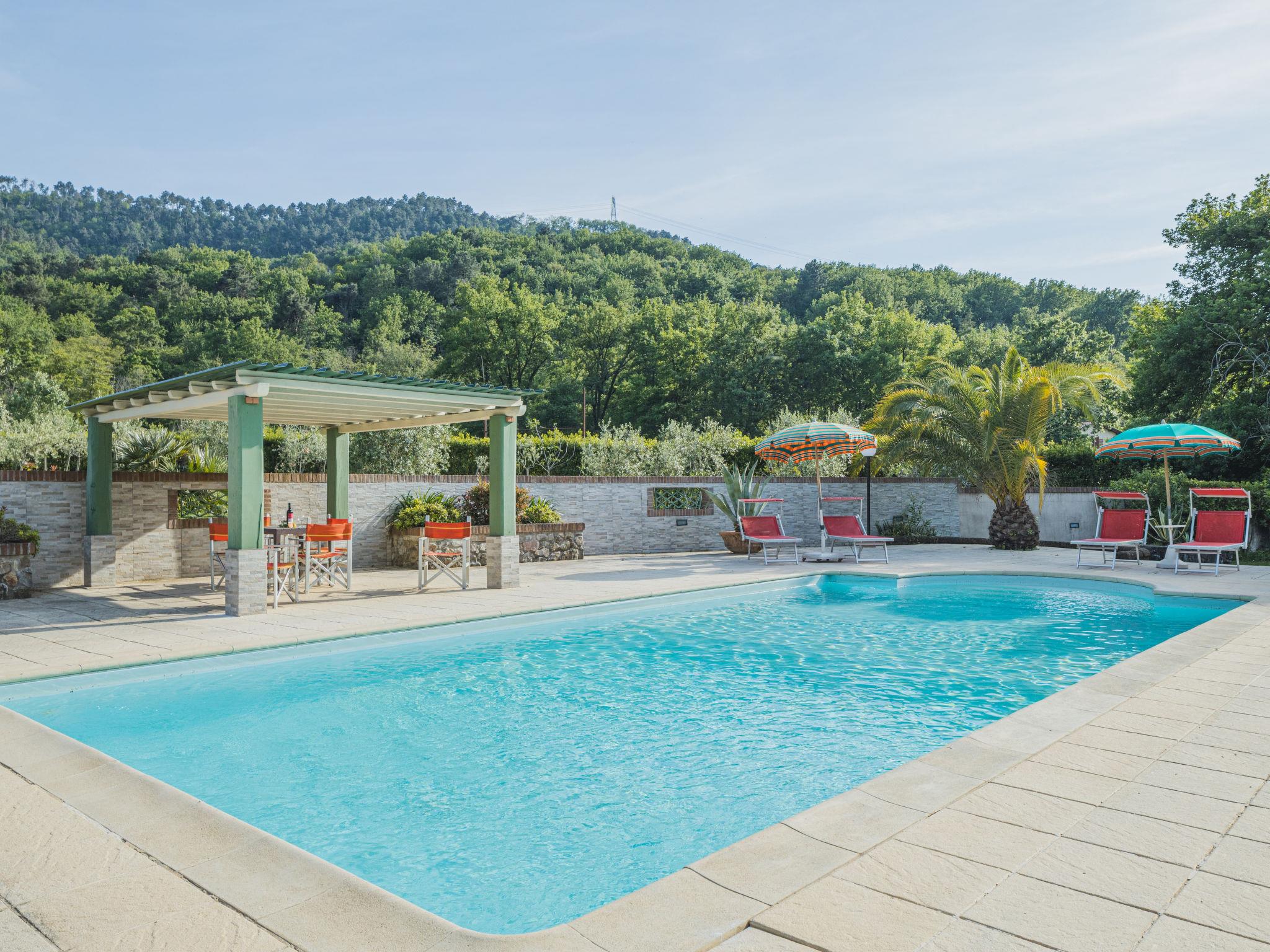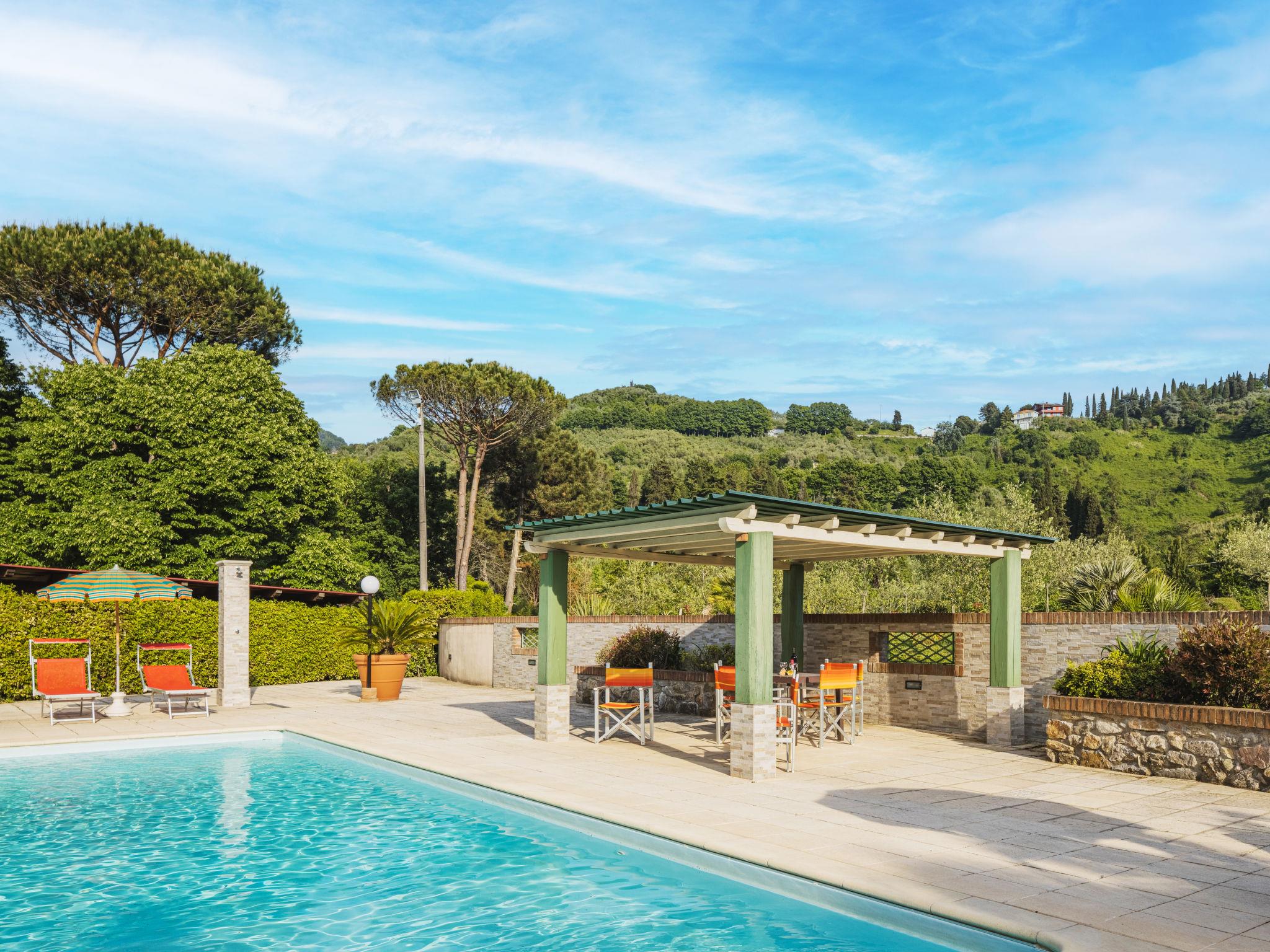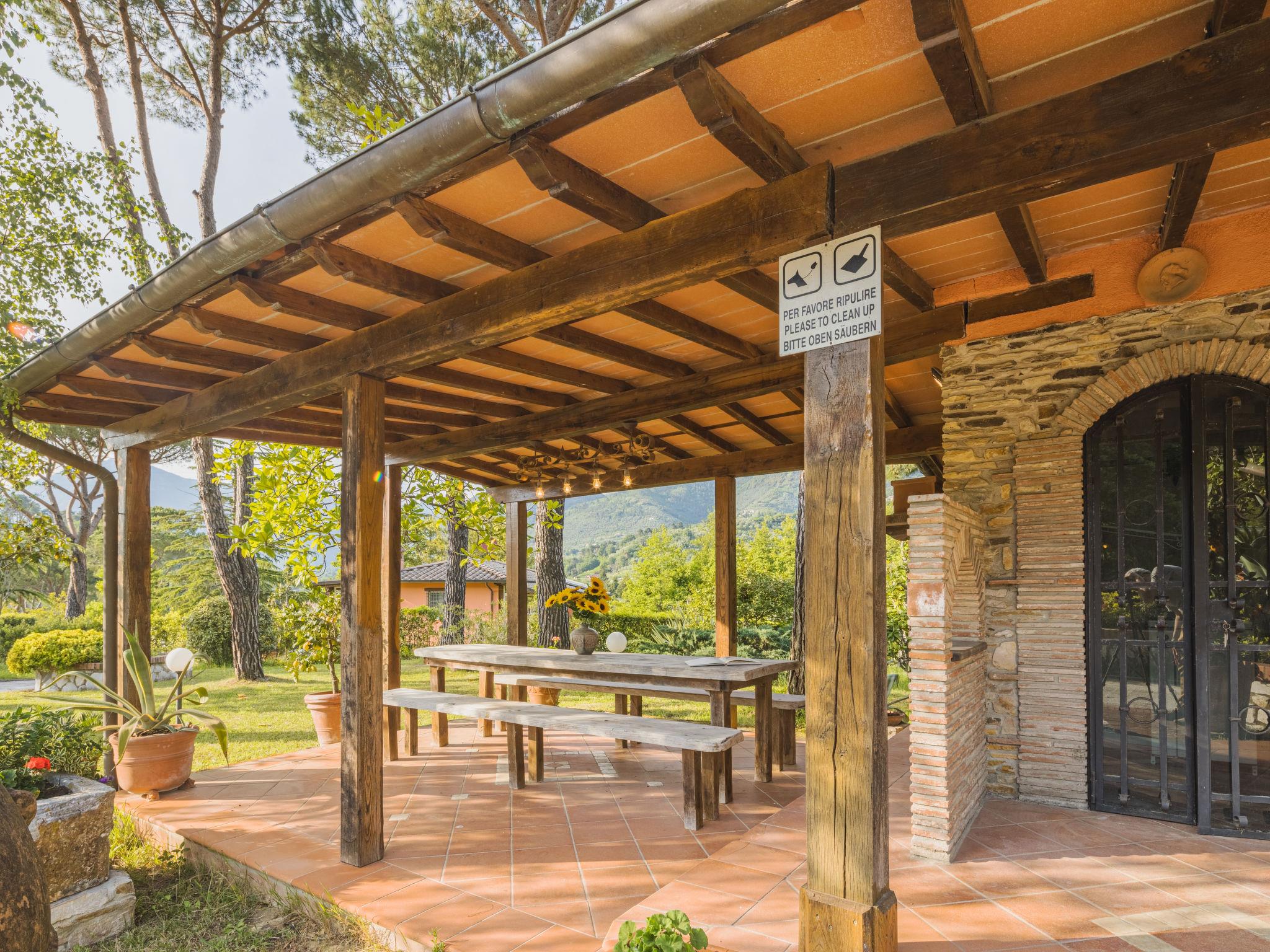 Pontemazzori 4 km von Camaiore: Schönes Einfamilienhaus "Costacce", umgeben von Bäumen. Im Ortsteil Pontemazzori, 4 km vom Zentrum von Camaiore, 14 km vom Zentrum von Viareggio, 39 km vom Zentrum von Pisa, 12 km vom Meer, 12 km vom Strand, im Grünen. Zur Alleinbenutzung: Garten 2'000 m2 mit Pflanzen und Bäumen, Wiese, Schwimmbad (10 x 5 m, 120 - 150 cm tief, saisonale Verfügbarkeit: 06.Mai. - 30.Sep.). WC im Poolbereich, Aussendusche, Poolhaus mit Kochherd, Tischtennis, Terrasse, Poolpflege durch den Besitzer/Gärtner. Im Hause: Zentralheizung, Heizung vor Ort zu zahlen (28.Mar. - 30.Okt.), Heizung nur verfügbar von 31.Okt. - 27.Mar.. Parkplatz auf dem Grundstück. Lebensmittelgeschäft 2 km, Restaurant 4 km, Bushaltestelle 3 km, Bahnstation "Viareggio" 14 km, Sandstrand "Lido di Camaiore" 12 km. Nahe gelegene Sehenswürdigkeiten: Forte dei Marmi 20 km, Lucca 38 km, Carrara (cave marmo Fantiscritti) 49 km, Collodi (Pinocchio Park) 56 km, Riomaggiore (5 Terre) 81 km, Firenze 124 km. Bekannte Seen in der Umgebung sind gut erreichbar: Torre del Lago 24 km. Wandergebiete: Grotta all´Onda 17 km. Bitte beachten: Fahrzeug empfohlen. Tiere in der Umgebung.