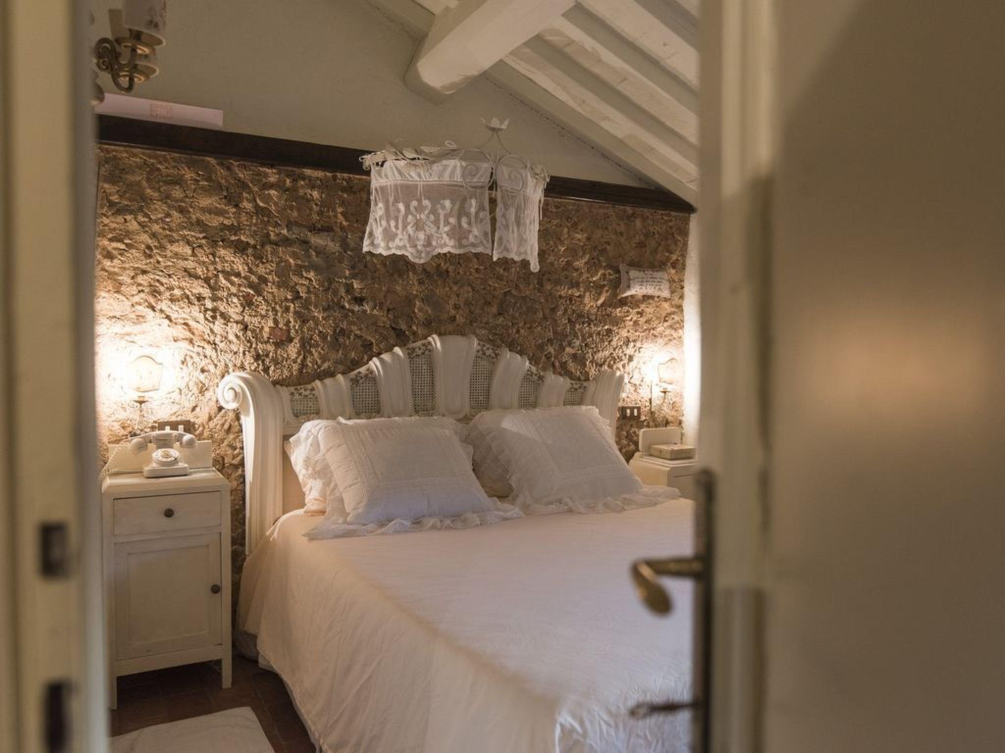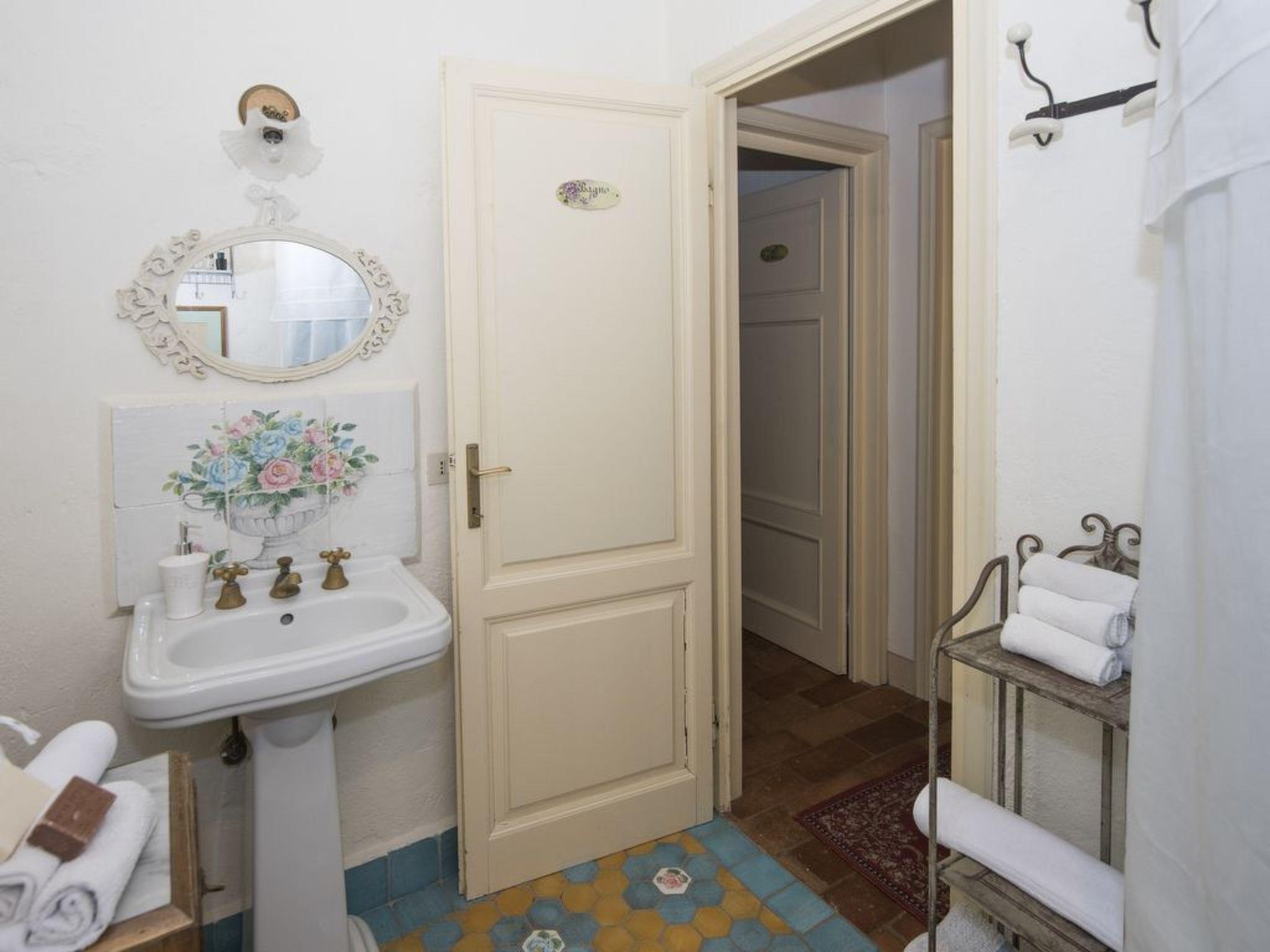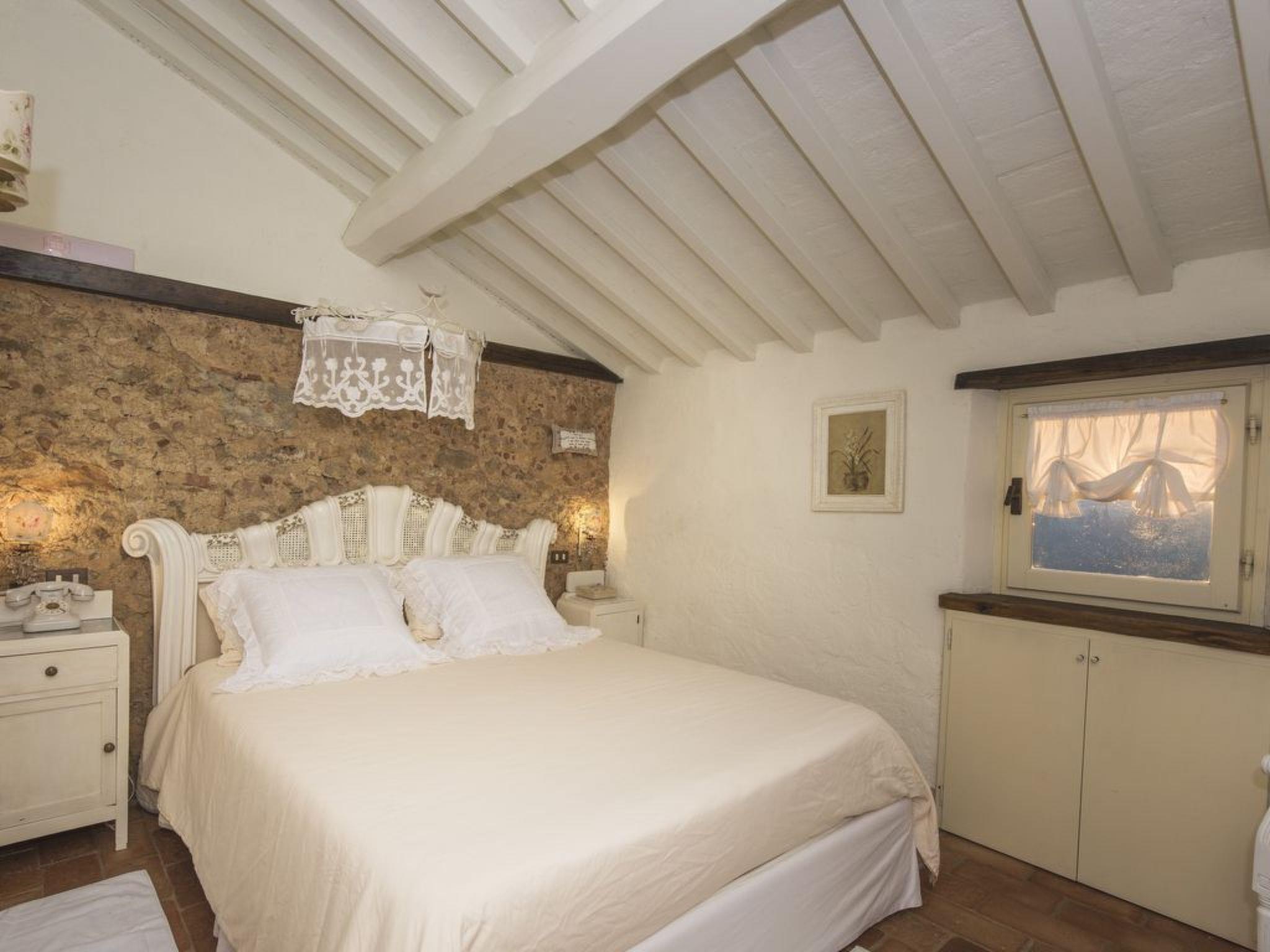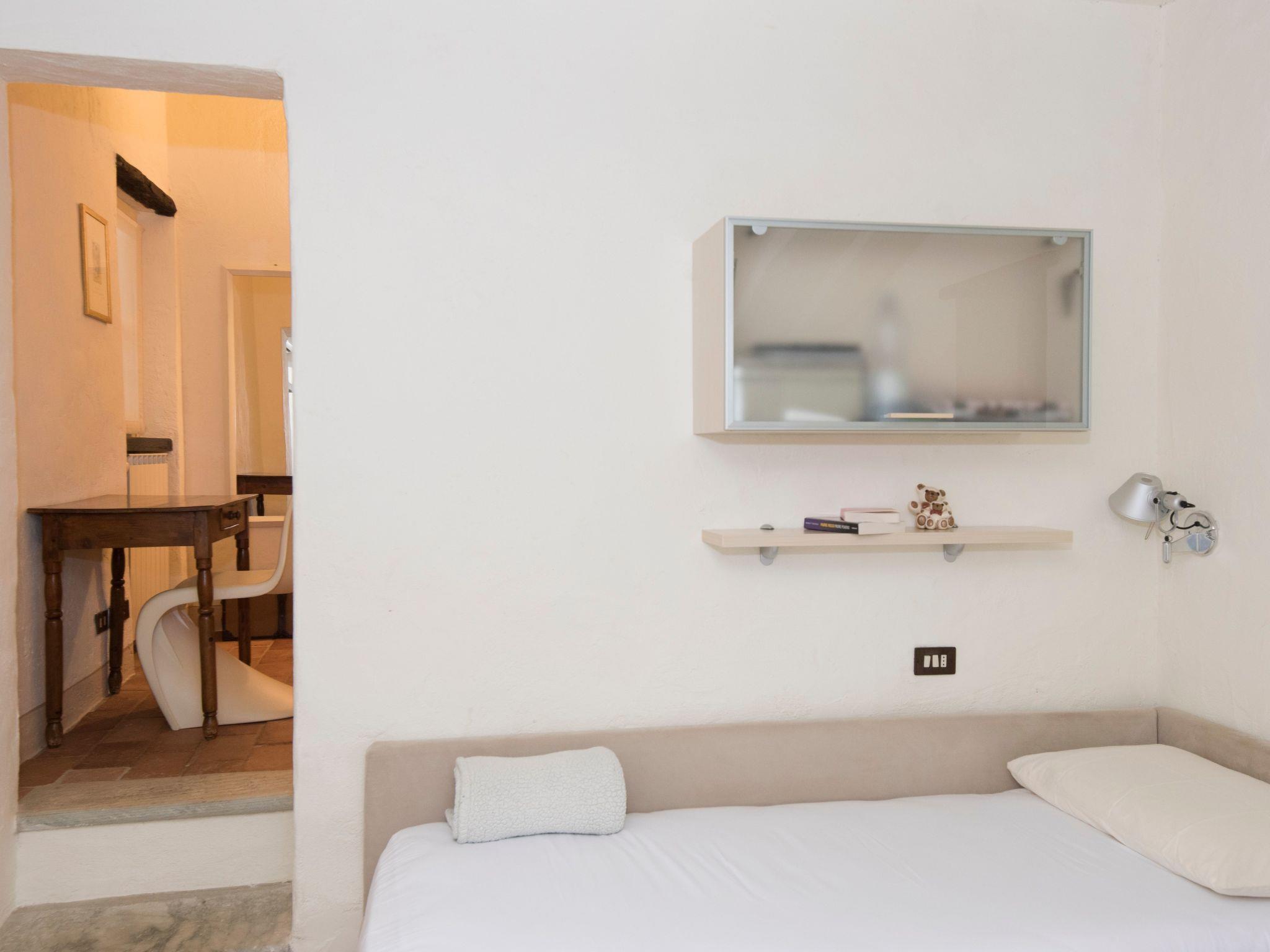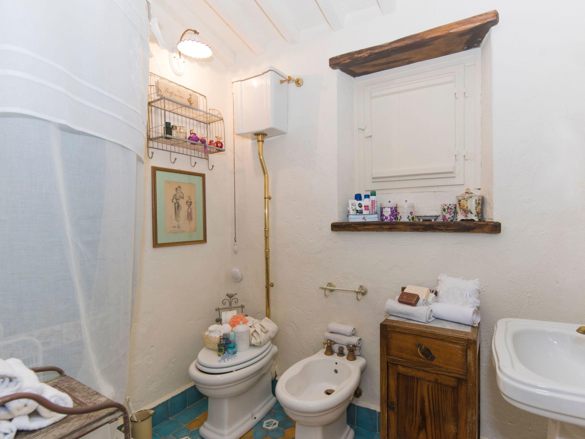 Die gemauerte Treppe des Tagesgeschosses führt zum Schlafbereich, wo sich ein Flur befindet, der sich zum Hauptschlafzimmer mit Kopfteil aus antikem gebeiztem Bett öffnet und dahinter eine schöne wiederhergestellte Steinmauer, ein kleines Fenster, ein weisser Schrank, ein Bad mit Dusche und hand geflieste Majolika-Bodenfliesen, begehbare Kleiderschränke, mit einer Treppe hinunter zum Schlafzimmer mit zwei Einzelbetten und ein Badezimmer mit eigener Dusche.