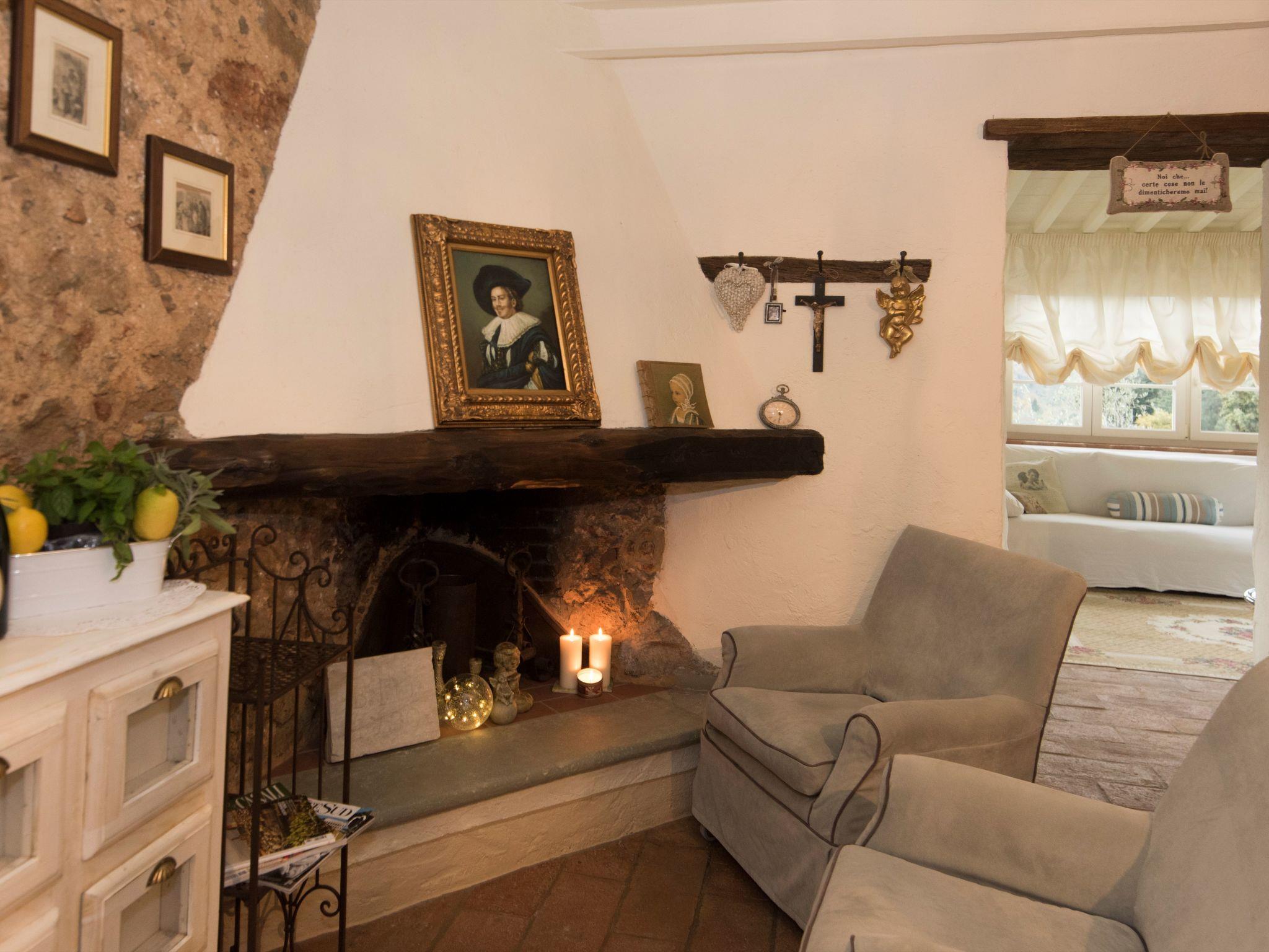 In der alten toskanischen Steinecke, die von zwei Sesseln eingerahmt wird, finden Sie einen Schrank und einen großen Kamin, um Momente der Entspannung zu genießen oder um ein gutes Buch zu lesen.