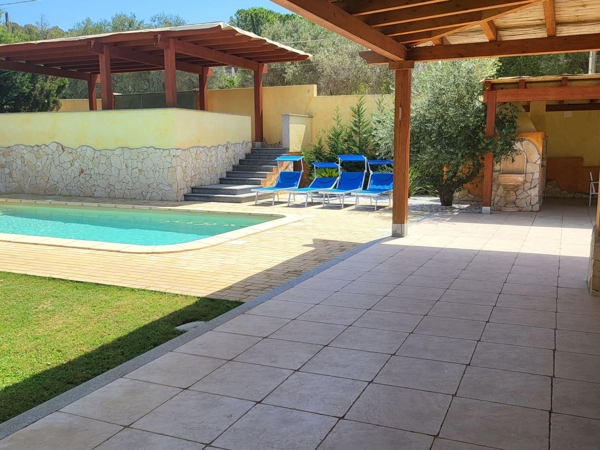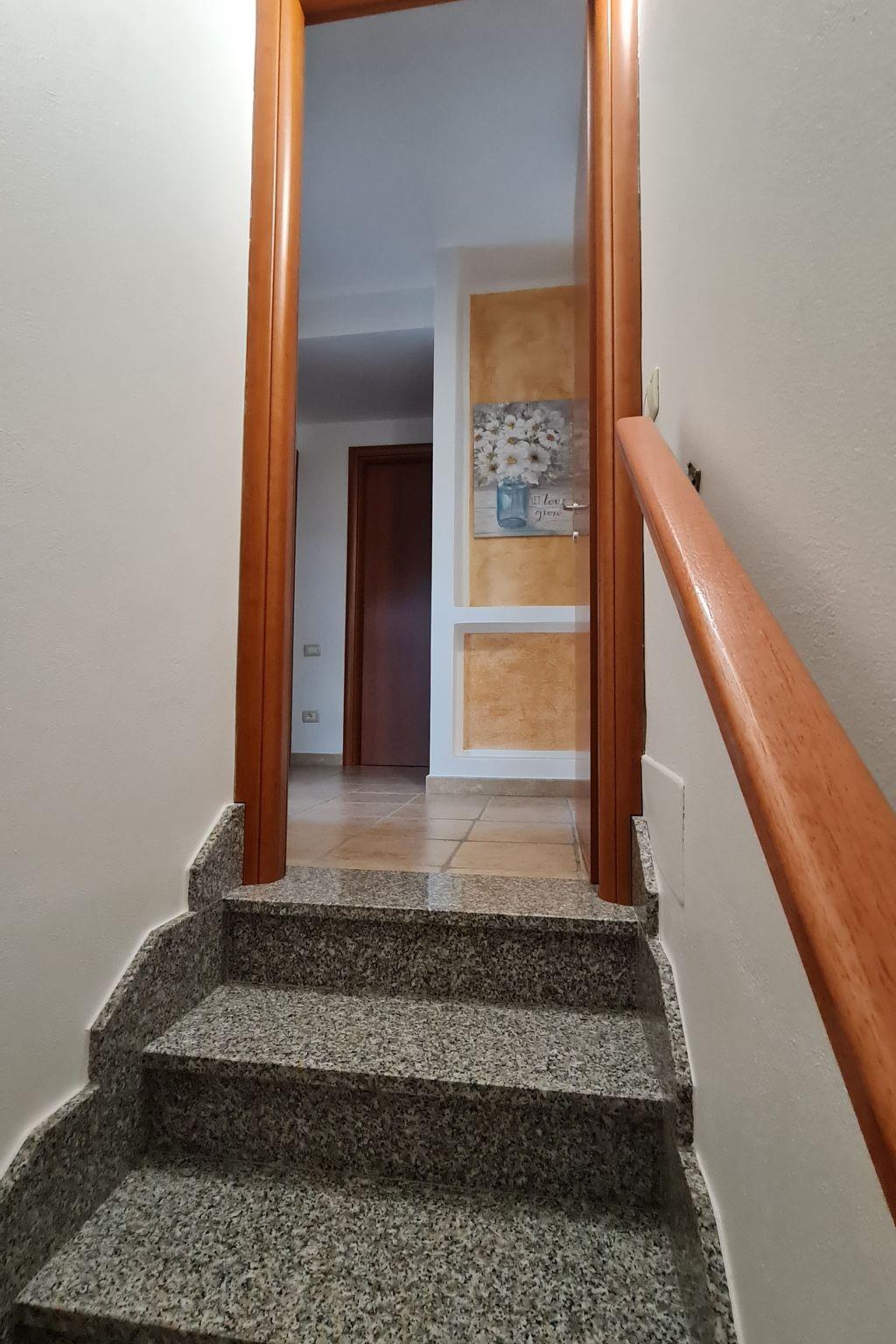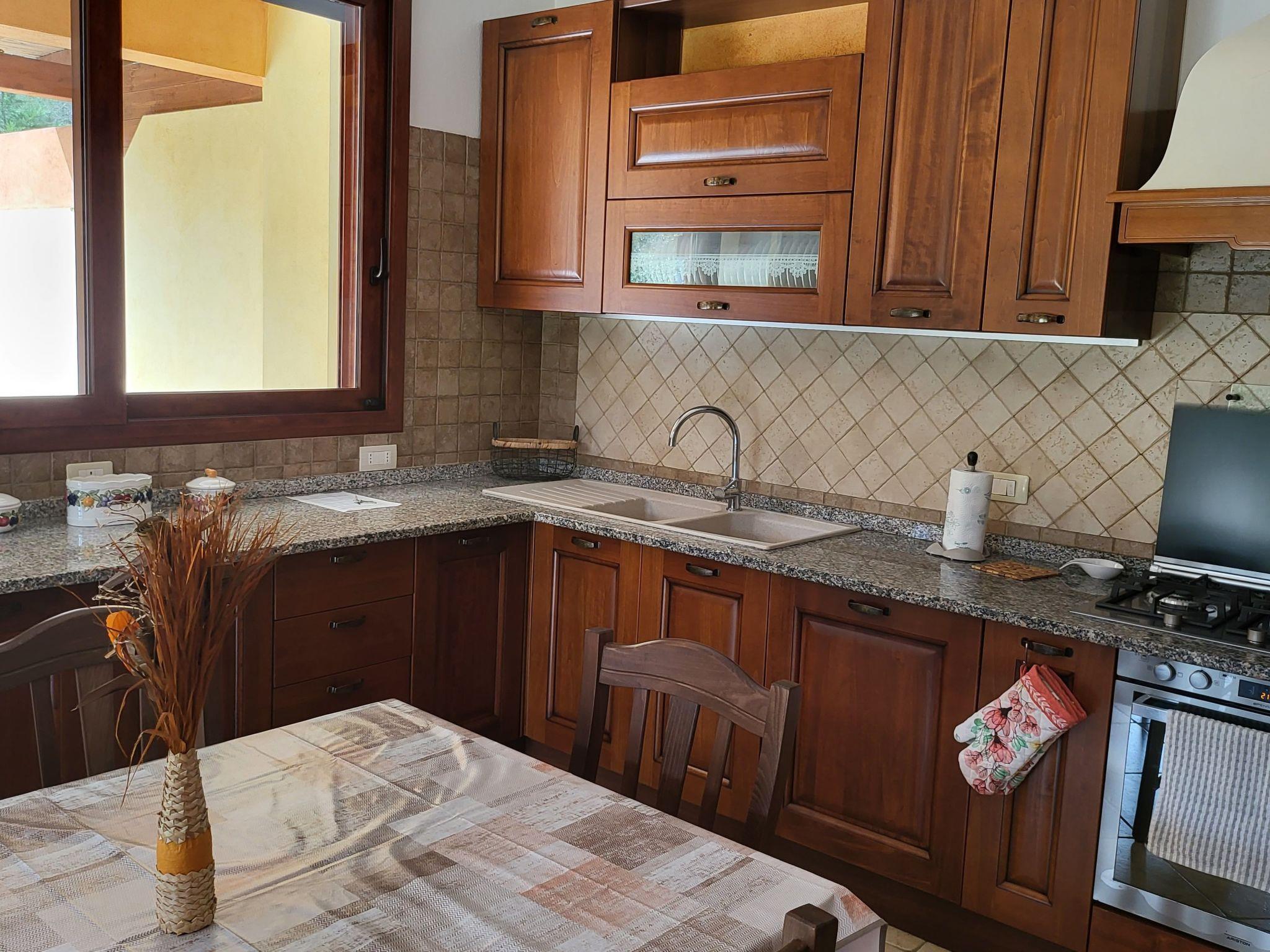 Der Zugang zur Villa erfolgt über einen Fußgängereingang oder mit dem Auto über den internen Parkplatz mit Schiebetor. Ein breiter Gehweg führt zur Eingangstür des Hauses. Im Inneren ist die Villa auf zwei Ebenen. Der Haupteingang im Erdgeschoss führt direkt in das Wohnzimmer mit TV und Essbereich. In einem einzigen Raum befinden sich das Wohnzimmer und die große, gut ausgestattete Küche. Die helle Glasschiebetür des Wohnzimmers und der Küche führt auf eine Veranda und zu einem überdachten Pavillon mit Tisch und Stühlen, ideal für ein Abendessen, bei dem man die typischen Produkte unseres sardischen Landes kosten kann. Vom Wohnzimmer aus erreicht man den Korridor, der zum Badezimmer und zum Schlafzimmer mit Doppelbett führt. Vom Korridor aus erreicht man die Treppe, die zum Schlafbereich im Obergeschoss führt, der aus einem Doppelzimmer, einem Zweibettzimmer mit zusammensteckbaren Betten und einem Badezimmer besteht.