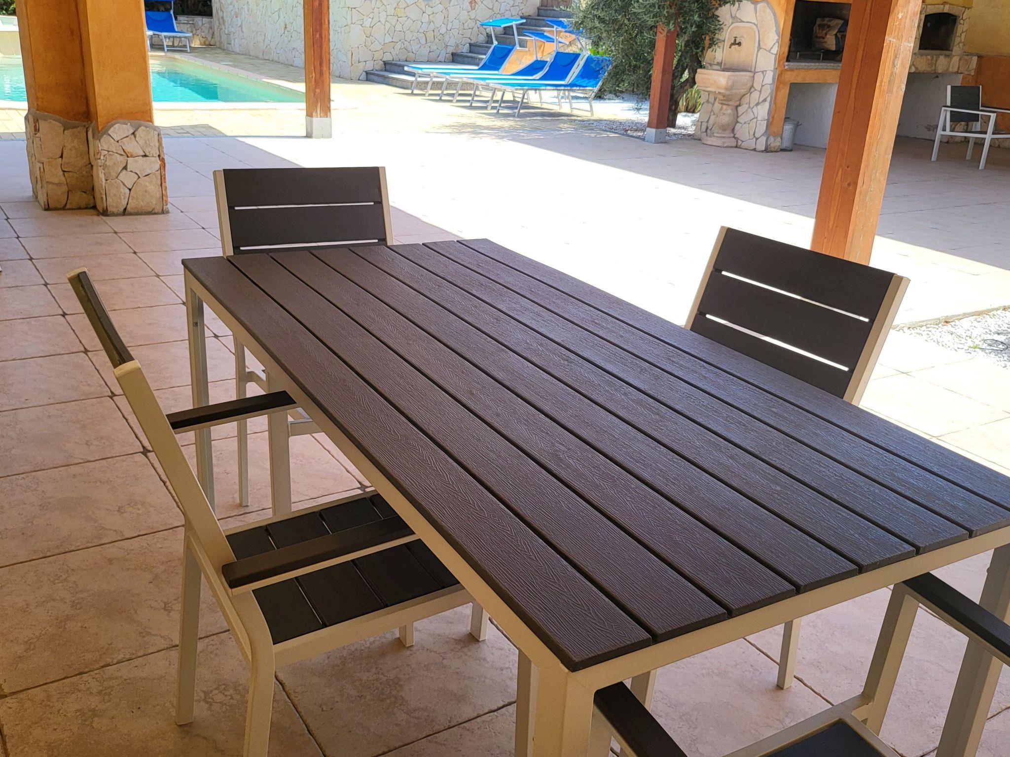 Der Garten ist direkt vom Haus aus zugänglich, indem man den Wohnbereich durch ein sehr großes Schiebefenster verlässt. Der Pool hat eine rechteckige Form mit einer internen Bank am Kopfende. Er hat eine Größe von 10 m x 4,2 m und ist über 2 seitliche Innentreppen erreichbar. Er ist mit PVC ausgekleidet und seine Tiefe variiert zwischen 1 m und 1,60 m. Die Liegewiese ist mit Liegestühlen ausgestattet.