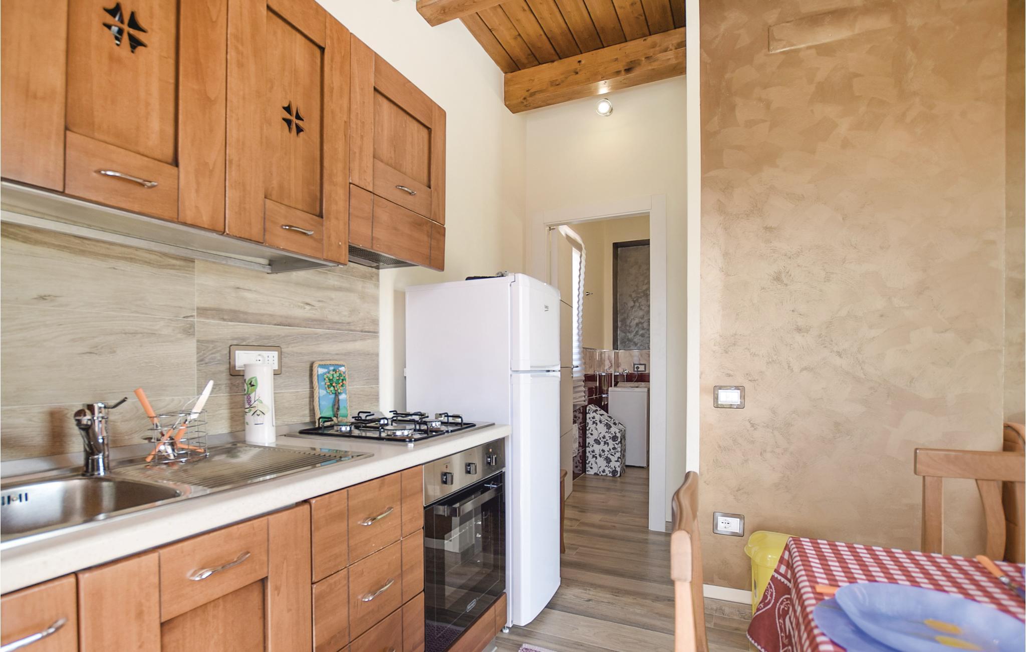 Ihr gemütliches Ferienhaus ist Teil eines Zweifamilienhauses. In der kleinen, gut ausgestatteten Küche finden Sie, was Sie für die Zubereitung Ihrer Mahlzeiten benötigen. Das rustikale Mobiliar aus Holz und die warmen Farbtöne schaffen eine behagliche Stimmung, die ideal zum Stil der Region passt. Der kleine Esstisch lädt zu gemeinsamen Mahlzeiten ein, während die geöffnete Tür den Blick in den sonnigen Garten freigibt.