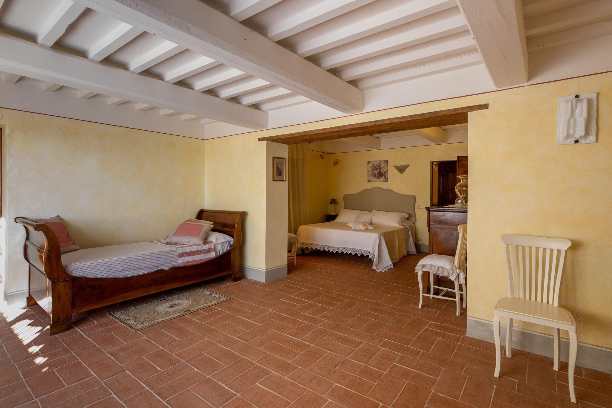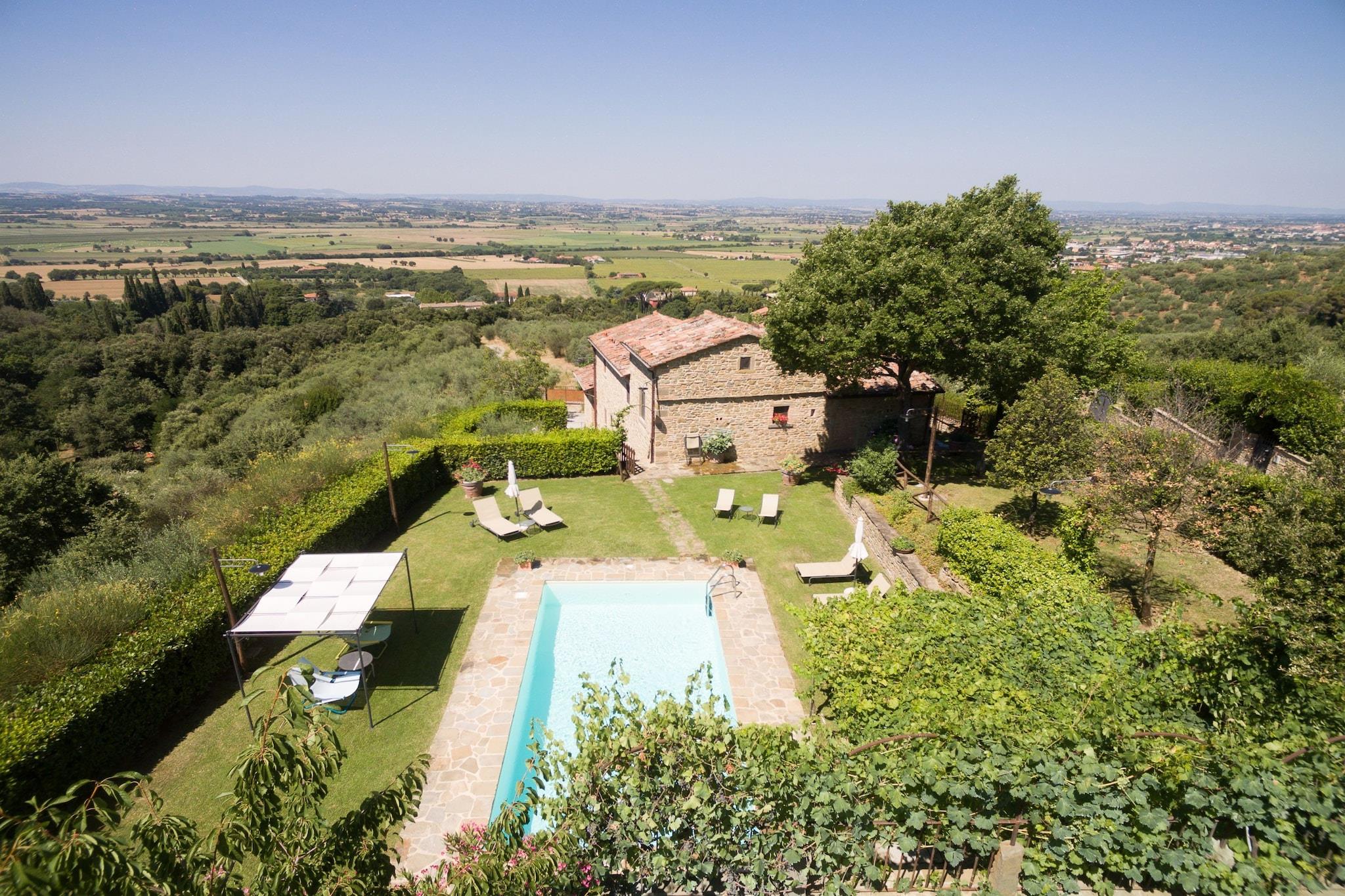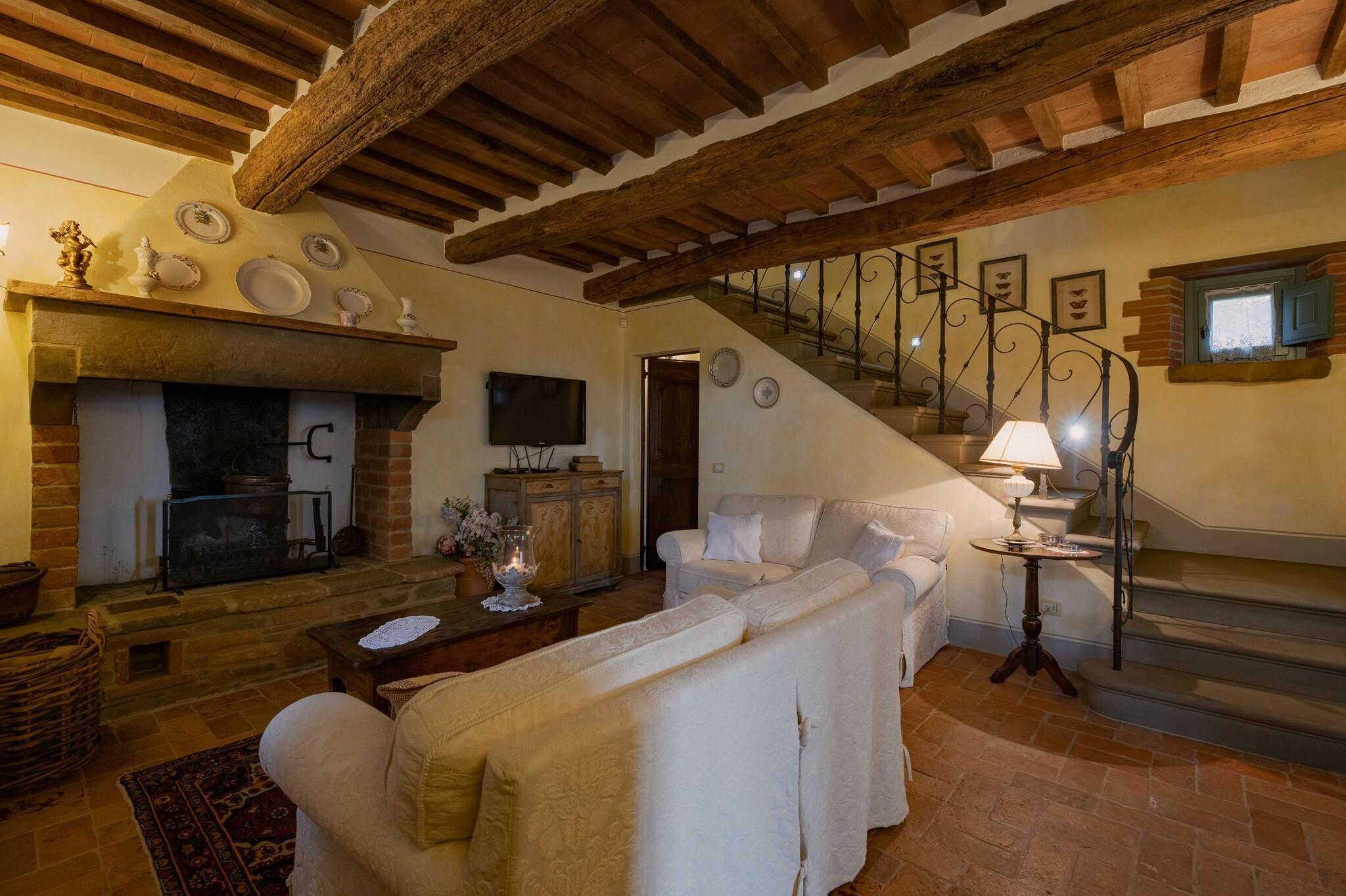 Casa Lamate ist ein Ferienhaus im toskanischen Stil in Panoramalage über dem Valdichiana. Umgeben von einer großen Terrasse und einem eingezäunten Garten bietet es den idealen Ort für entspannte Momente unter Olivenbäumen und Eichen. Eine kleine Ecke ist mit Grill und Holzofen ausgestattet. Nur wenige Kilometer von der bekannten etruskischen Stadt Cortona entfernt, die reich an Traditionen, Kultur, Kunst und kulinarischer Geschichte ist, ist es dank seiner strategischen Lage der ideale Ausgangspunkt für Besuche der wichtigsten Kultur- und Stadtzentren Mittelitaliens. Das Haus erstreckt sich über drei Etagen, jede mit direktem Zugang von außen. Der Haupteingang führt in die große Küche und die Außenveranda – ideal für köstliche Abendessen mit Blick auf die Landschaft. Eine Bogentür trennt die Küche vom gemütlichen Wohnzimmer mit Sofas, in dem der Steinkamin hervorsticht. Im ersten Stock befinden sich drei Schlafzimmer. Eines der Doppelzimmer verfügt über ein eigenes Bad; die beiden anderen Schlafzimmer teilen sich ein Badezimmer mit Dusche.