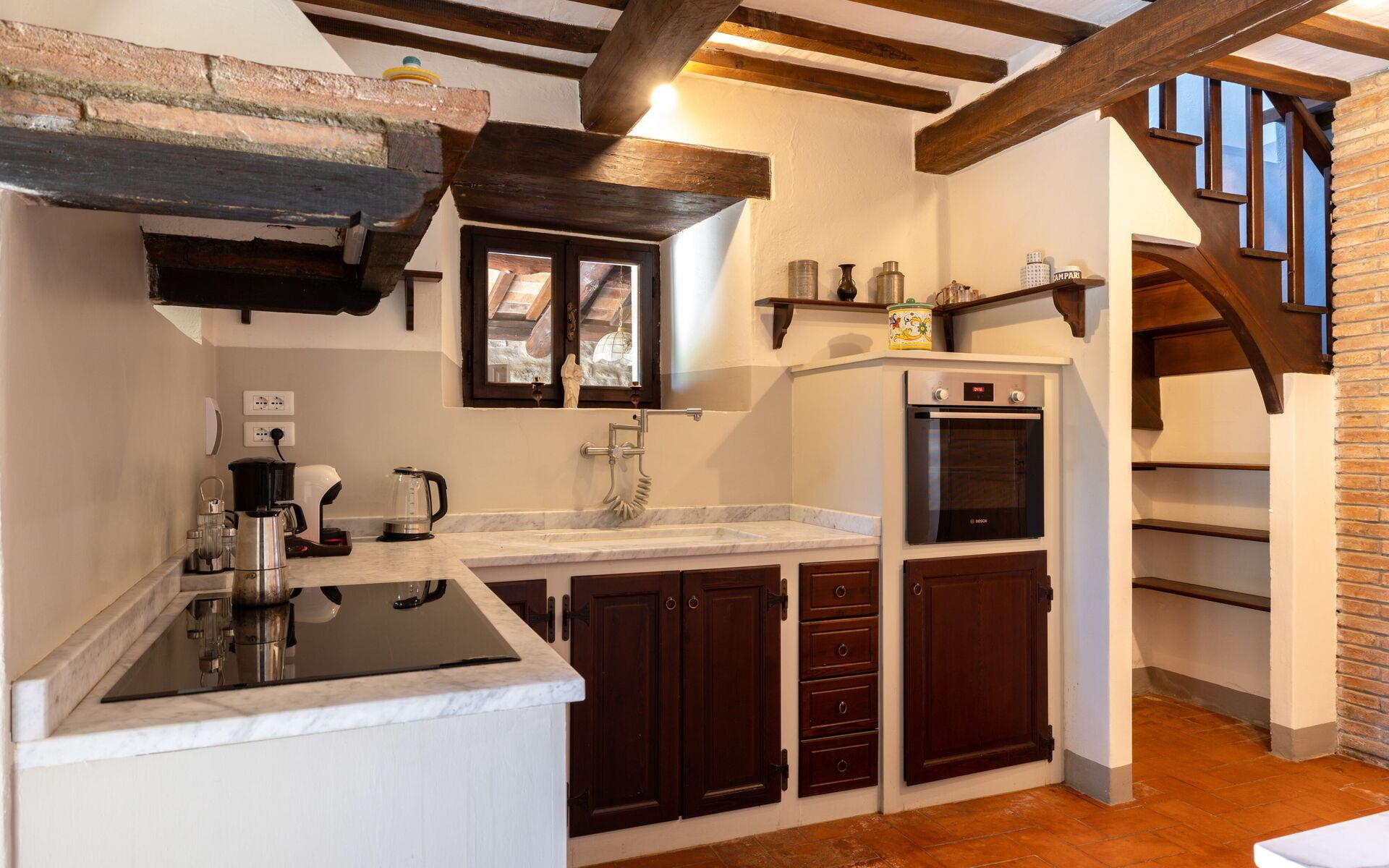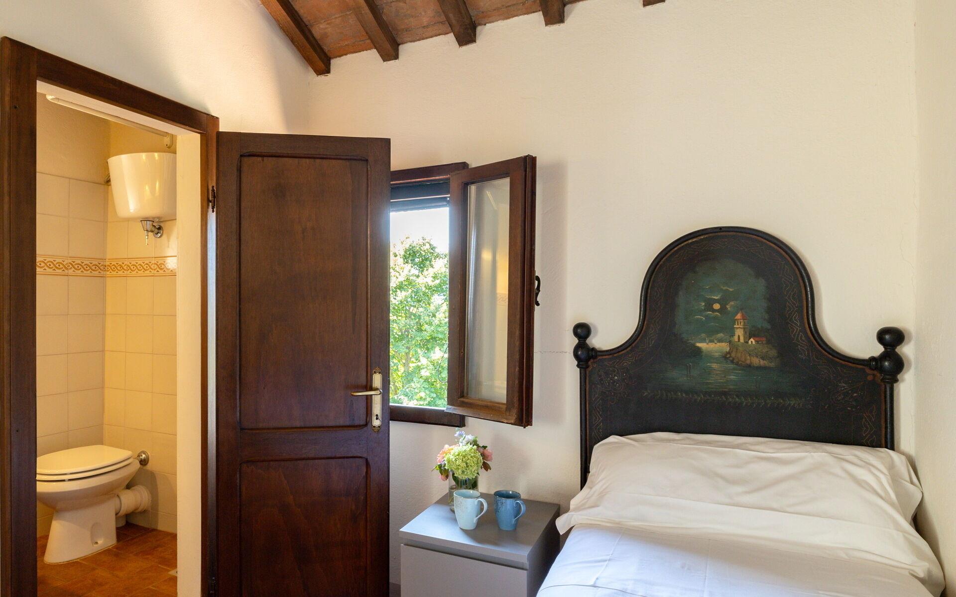 Villa delle Rose entwickelt sich auf zwei Ebenen (etwa 250 Quadratmeter insgesamt) und es kann leicht Gastgeber für bis zu 8 Gäste. Sie betreten die Villa über den Haupteingang im Erdgeschoss, der Sie direkt in den Wohnbereich führt, wo Sie ein wunderschönes Wohnzimmer im toskanischen Stil mit einem großen Kamin, Smart TV und einem bequemen Sofa erwartet. Im Erdgeschoss befindet sich auch die Küche, die mit allem ausgestattet ist, was Sie brauchen, um Ihre Lieblingsgerichte zu kochen, und mit einem separaten Esszimmer, das über ein wunderschönes Buntglasfenster verfügt, von dem aus Sie die Aussicht auf die umliegenden Hügel bewundern können, während Sie Ihre Lieblingsgerichte essen. Im Erdgeschoss finden Sie ein Schlafzimmer mit Doppelbett und ein Bad mit Dusche. Der erste Stock ist sowohl über eine Innentreppe als auch über eine schöne Außentreppe aus Stein zu erreichen, die zu einem Flur mit einer Studioecke führt, von der aus man einen Panoramablick auf die Umgebung hat.