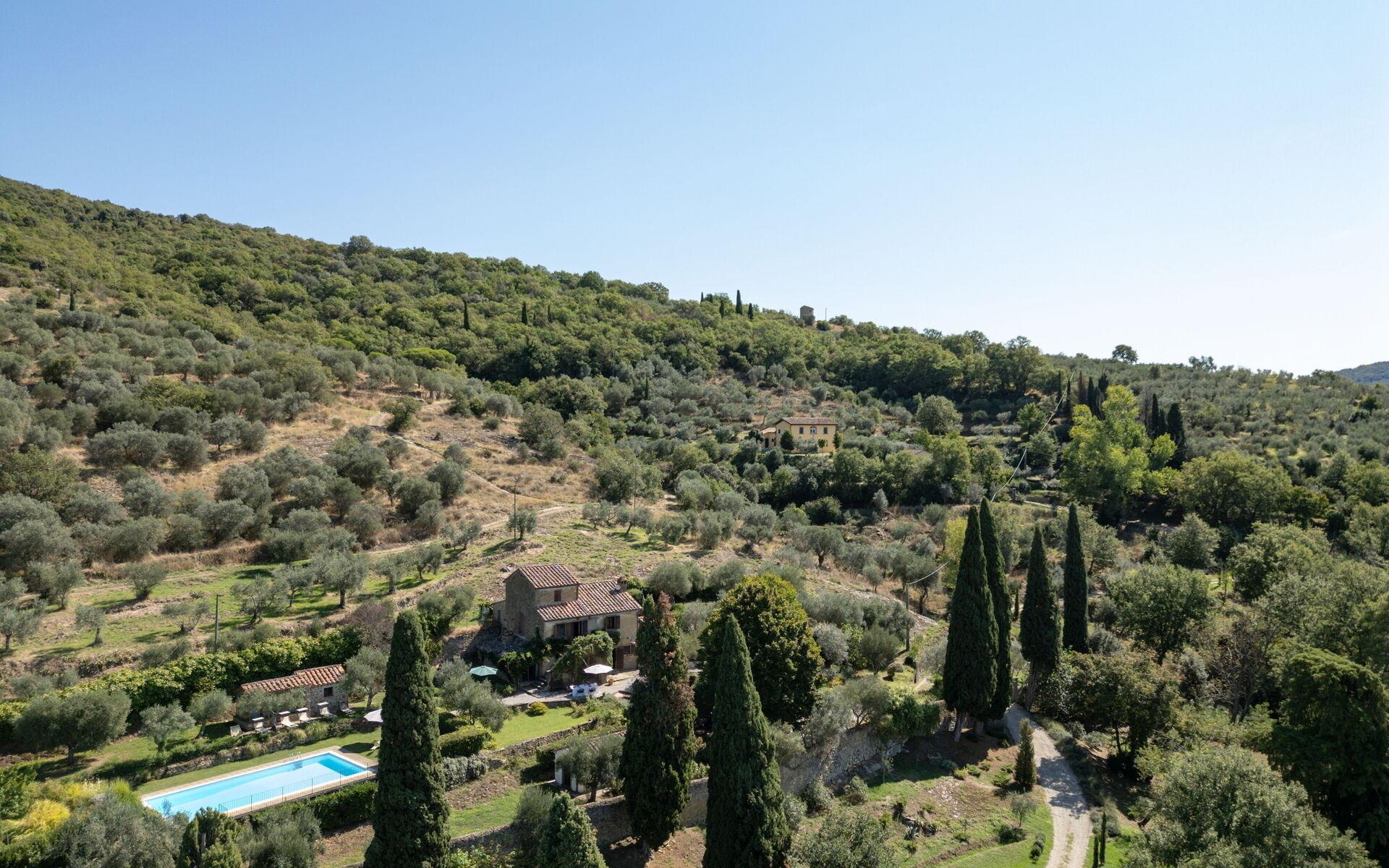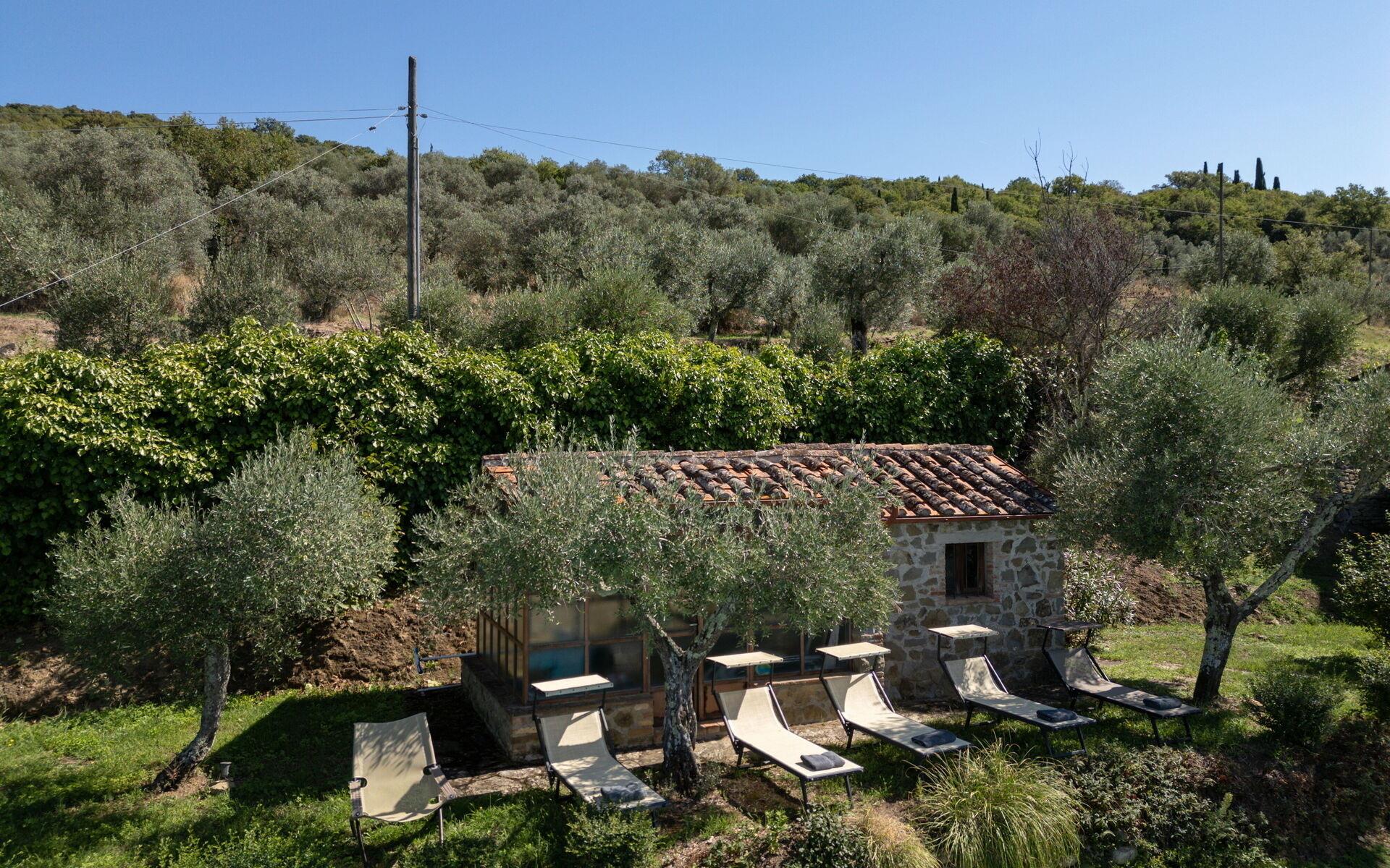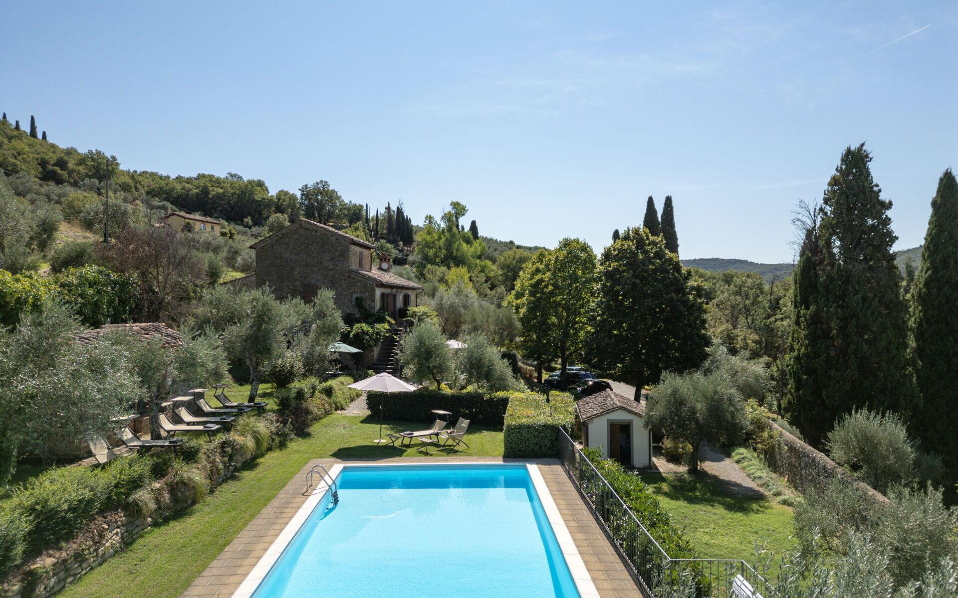 Geboren als ein landwirtschaftliches Anwesen, hat das Anwesen die typischen freiliegenden Stein und es hat die typischen toskanischen Landhaus Charme und Funktionen gehalten. Draußen steht das Haus auf den traditionellen und natürlichen Terrassen, die die hügeligen Strukturen kennzeichnen: vom Eingangsweg aus gelangt man zum Parkplatz und zu einem Nebengebäude mit der Waschküche. Wenn Sie auf die Ebene des Hauses hinaufgehen, stehen Ihnen ein Essbereich im Freien, ein Entspannungsbereich und alle Zugänge zur Villa zur Verfügung. Auf der linken Seite des Grundstücks befindet sich der Swimmingpool (geöffnet vom 26. April bis zum 1. November, Mindesttiefe 1,10 m, Maximaltiefe 2,10 m, Maße 5,5 x 12 m): tagsüber perfekt der Sonne ausgesetzt, in Panoramalage mit herrlichem Blick auf die umliegende Landschaft, mit einer Sonnenterrasse mit Liegestühlen und Sonnenschirmen. Er verfügt auch über eine Außendusche.