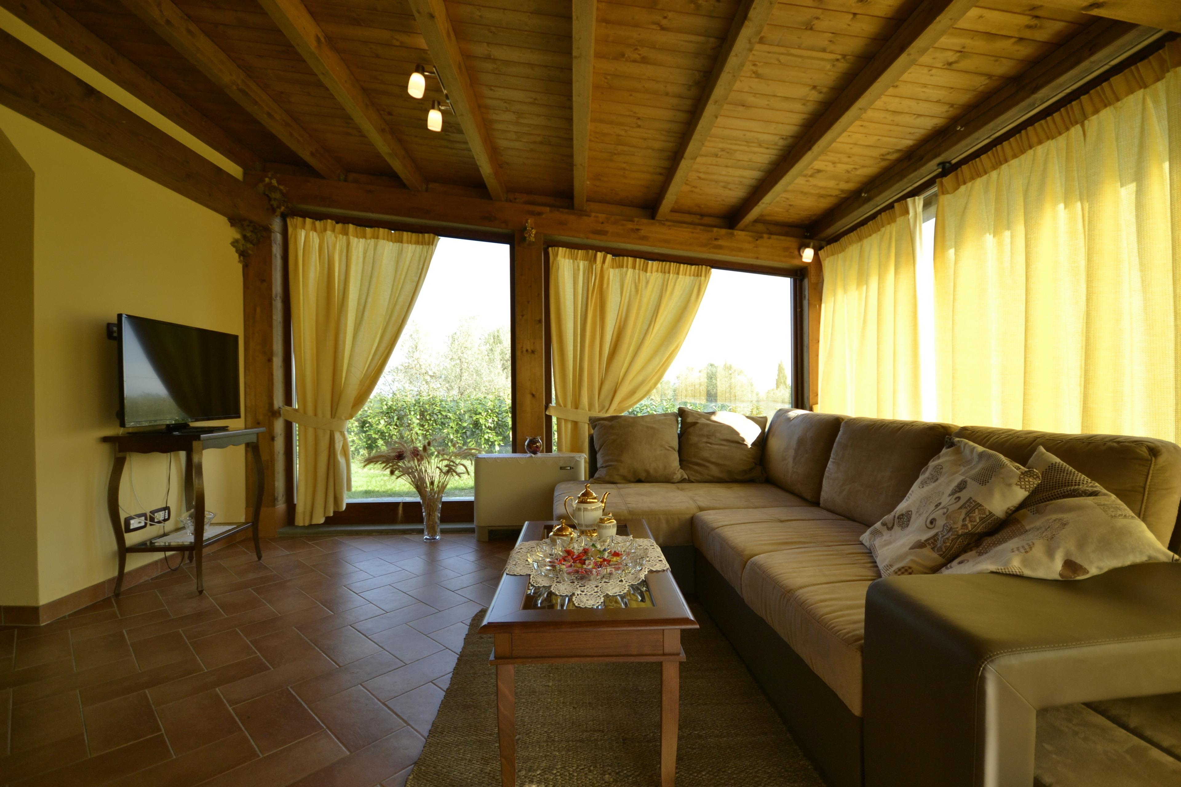 Vom Haupteingang aus betreten Sie den schönen und geräumigen Wohnbereich, der sich durch Glasfenster auszeichnet, von denen aus Sie einen herrlichen Blick auf die umliegende Landschaft genießen können.