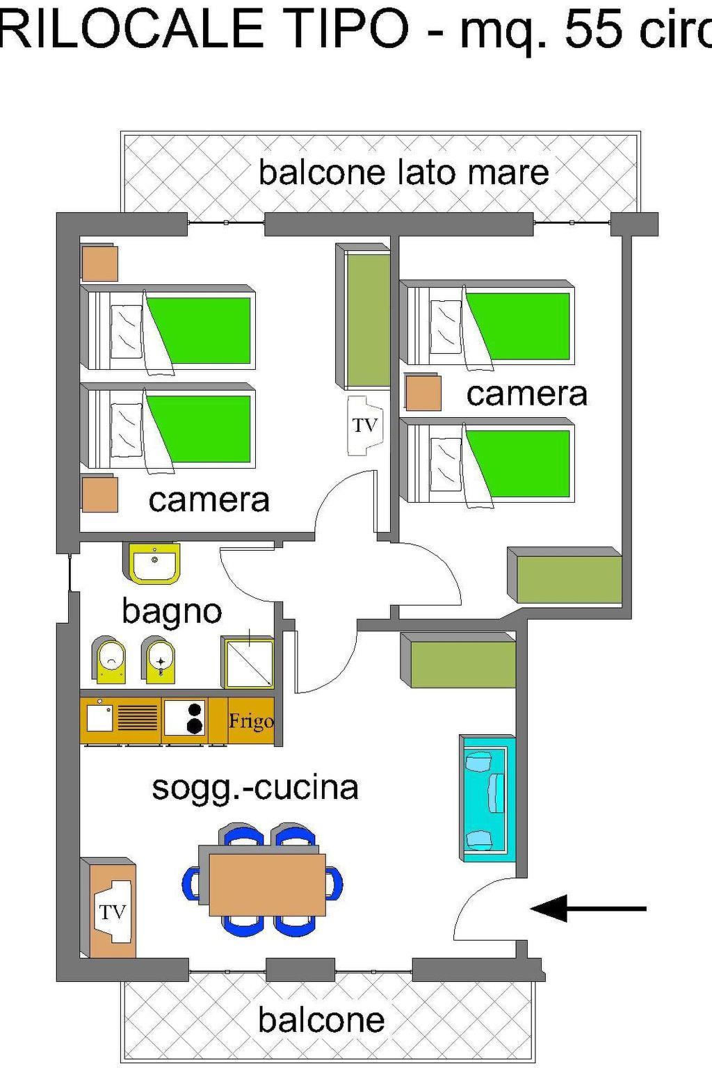 Dieser Wohnungstyp bietet vier bis sechs Personen Platz, verfügt über mindestens 55 m2 plus Balkon und besteht aus einem Wohnzimmer mit Doppelschlafcouch, einer Kochnische (mit Elektroherd, Mikrowelle, Kühlschrank mit Gefrierfach), zwei Doppelzimmern und einem Bad mit Dusche/WC.