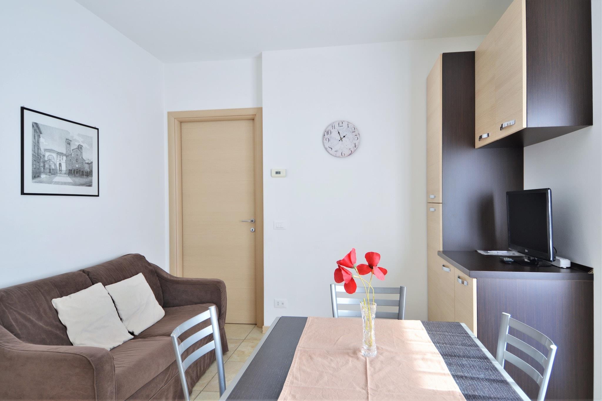 Charmantes Domizil am See Genießen Sie einen erholsamen Urlaub in diesem gemütlichen Apartment in der Residence Giuliana in Dervio – ideal für eine Gruppe von vier Personen. Nur 500 m vom Seeufer und Bahnhof entfernt, ist es ideal gelegen, um die natürliche Schönheit und den Charme des Comer Sees und der umliegenden Dörfer wie Vestreno und Corenno Plinio zu entdecken. Komfortabel & gut ausgestattet Das Apartment im ersten Stock verfügt über ein helles Wohn- und Esszimmer mit einem Einzelschlafsofa und ein komfortables Schlafzimmer mit einem Doppel- und einem Einzelbett. Die gut ausgestattete Küche verfügt über Backofen, Mikrowelle, Herd, Geschirrspüler und Kühl-Gefrierkombination. Eine Waschmaschine im Badezimmer sorgt für zusätzlichen Komfort. Lokale Köstlichkeiten & Entspannung Entspannen Sie nach einem erlebnisreichen Tag bei einem Drink auf der privaten Terrasse oder dem Balkon. Besuchen Sie den Strand Spiaggia di Dervio mit seinem atemberaubenden Seeblick oder spazieren Sie auf dem berühmten Wanderweg Sentiero del Viandante. Speisen Sie in lokalen Restaurants, genießen Sie Bootsfahrten vom Fährhafen oder erkunden Sie historische Stätten wie den Torre di Orezia – alles nur wenige Schritte entfernt.