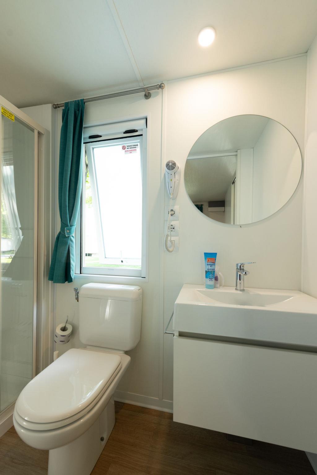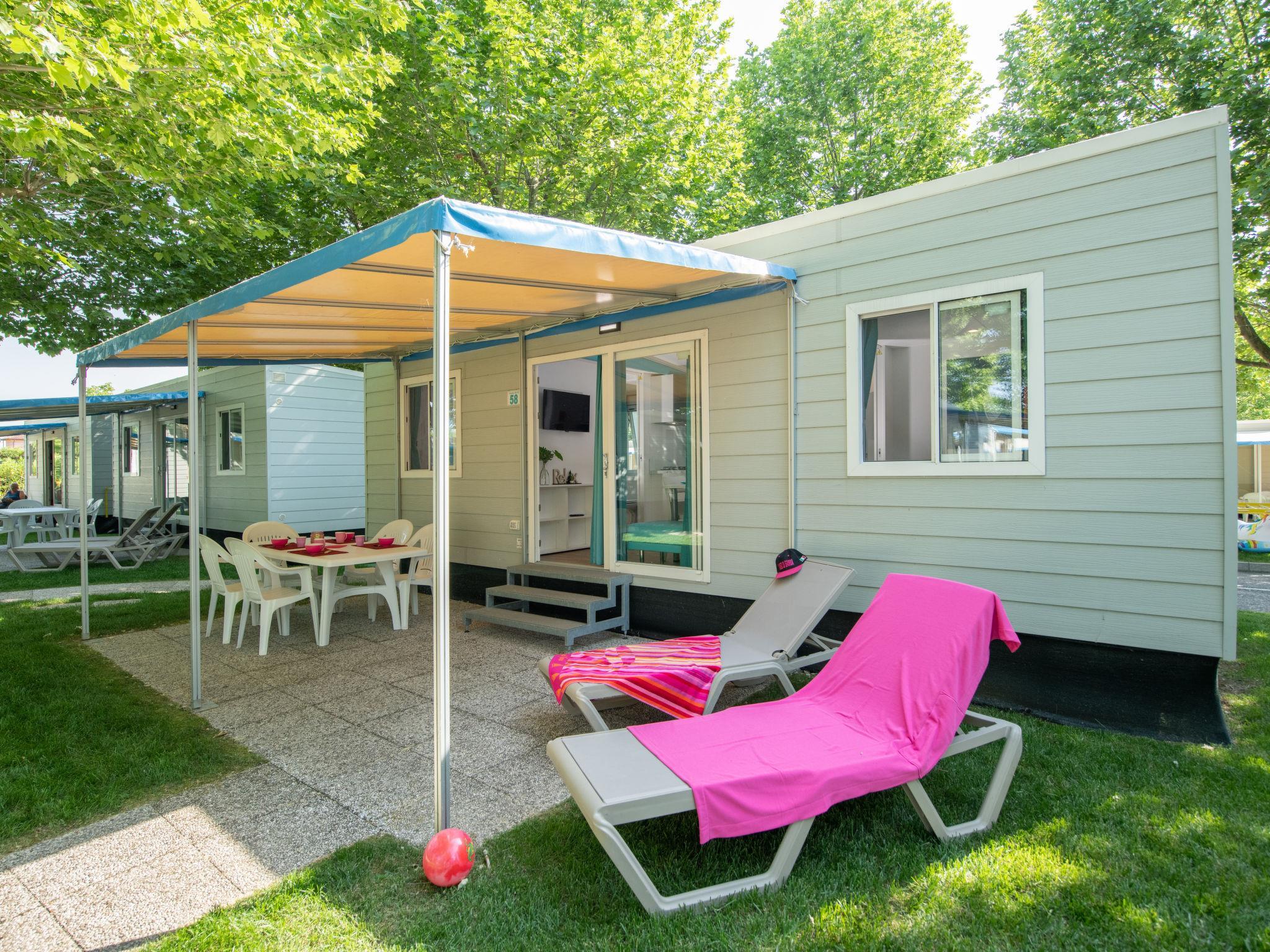 "Garda Blue", 3-Zimmer-Mobilheim 32 m2. Objekt geeignet für 4 Erwachsene + 1 Kind. Modern eingerichtet: Wohn-/Schlafzimmer mit 1 Schlafmöglichkeit (70 cm, Länge 185 cm), Esstisch, TV, Klimaanlage und Warmluftheizung. 1 Zimmer mit 1 Doppelbett (160 cm, Länge 200 cm), Dusche/WC. 1 Zimmer mit 2 Betten (75 cm, Länge 200 cm), Dusche/WC. Offene Küche (4 Flammen, Mikrowelle). Gartensitzplatz. Terrassenmöbel, Gartengrill, Liegestühle (2). Zur Verfügung: Safe, Fliegengitter, Haartrockner. Parkplatz (1 Auto). Maximal 1 Haustier/Hund erlaubt. IT017067B1HII4DV9G
