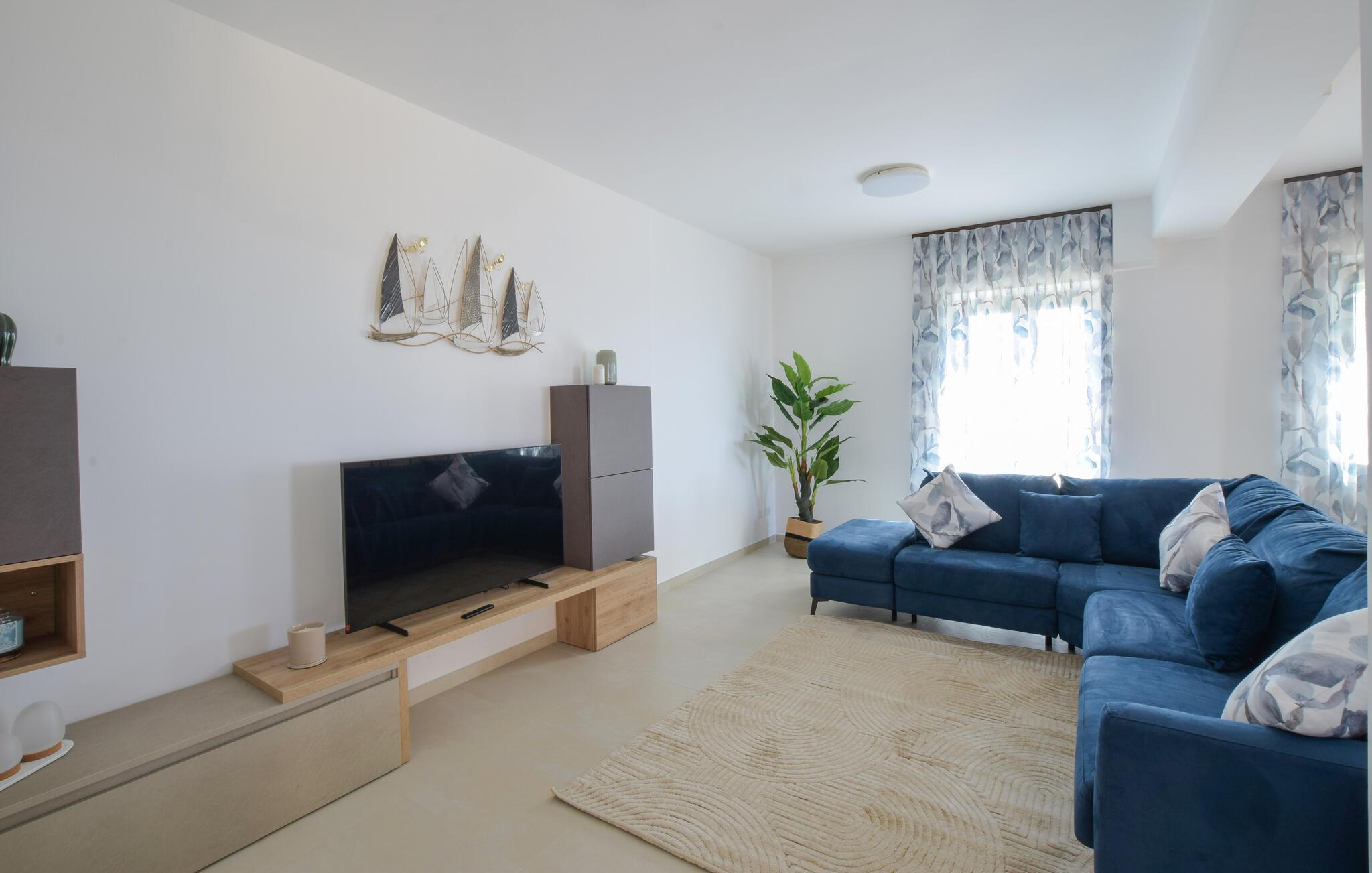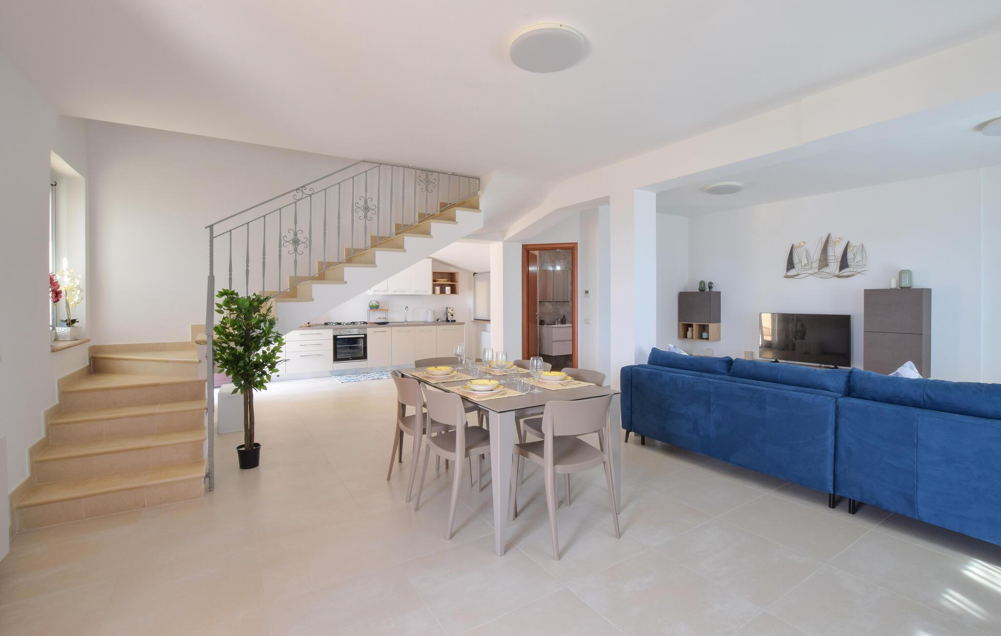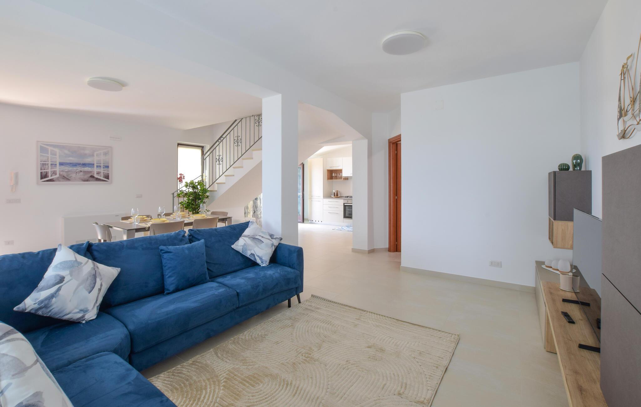 Willkommen in dem einladenden Haus, das Sie nur einen kurzen Spaziergang vom Strand empfängt und sich ideal für einen wunderbaren Urlaub nahe dem Meer eignet. Entspannen Sie nach einem erlebnisreichen Tag in den wohnlich-modernen Räumen und machen Sie es sich auf dem großzügigen Sofa bequem, wo Sie die Erlebnisse des Tages noch einmal Revue passieren lassen können.