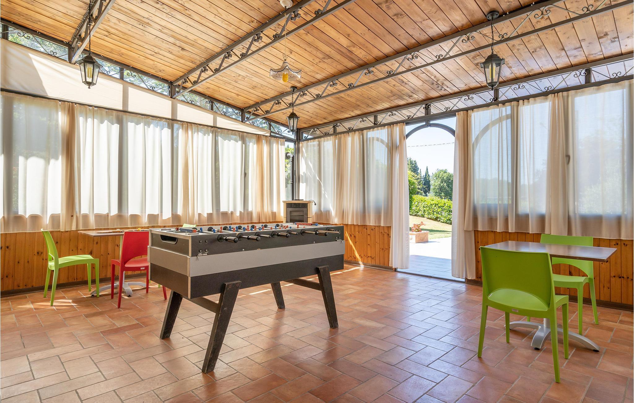 Etwa 8 km von Dicomano liegt dieses Ferienhaus in einem romantischen Seitental im Mugello, am Rande eines kleinen Weilers. Sie gelangen über den Vorgarten und die Terrasse in die Wohnküche; die verschiedenen Schlafzimmer und Bäder schließen sich an. Im Erdgeschoss steht den Gästen eine überdachte Terrasse mit Tischfußball zur Verfügung. Oberhalb vom Haus liegt der private sonnige Poolbereich (Salzwasser) mit Liegestühlen und Sonnenschirmen und mit bezauberndem Blick auf das gegenüberliegende Kirchlein und in das kleine Tal. Dieses Haus ist ideal für eine Gruppe, die sich gerne im Freien erholen und bewegen möchte. Auf dem großen Grundstück gibt es einen Kinderspielplatz, Tischtennis eine schattige Pergola und - etwas weiter entfernt - ein ganzes Spielfeld für Ballspiele und zum Kicken! Nicht genug damit: Es warten vor Ort 6 Mountain Bikes auf sportliche Gäste, denn die Gegend ist perfekt zum Trekken und Biken durch den nahen Naturpark des Casentino/Monte Falterona. Hier gibt es kleine Orte, mittelalterliche Burgen und Klöster zu entdecken, einschließlich der lokalen Spezialitäten mit Steinpilzen, Trüffel und gutem Schafskäse. Die freundlichen Eigentümer bewohnen das Nachbarhaus und stehen den Gästen bei Bedarf gerne mit Rat und Tat zur Verfügung. Als Kontrastprogramm bietet sich ein Ausflug nach Florenz: Lohnenswert ist eine Fahrt nach Florenz mit der Mugello-Bahn, sie fährt vom nahen Städtchen Dicomano aus. Entlang der besonderen Straße Muraglione, die bei Motorradfahrern beliebt ist, erreicht man die Adria-Küste: San Marino (ca. 2 Stunden) und Rimini (90 Minuten). Oder entspannen Sie sich einen Tag lang in den Thermalbädern von Castrocaro (ca. 50 Autominuten). Dicomano mit Geschäften, Pizzeria, Bar 8 km.
