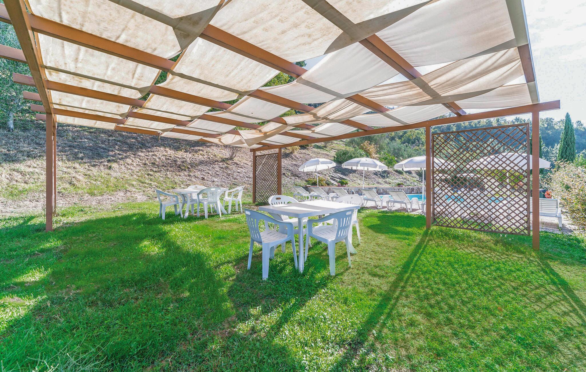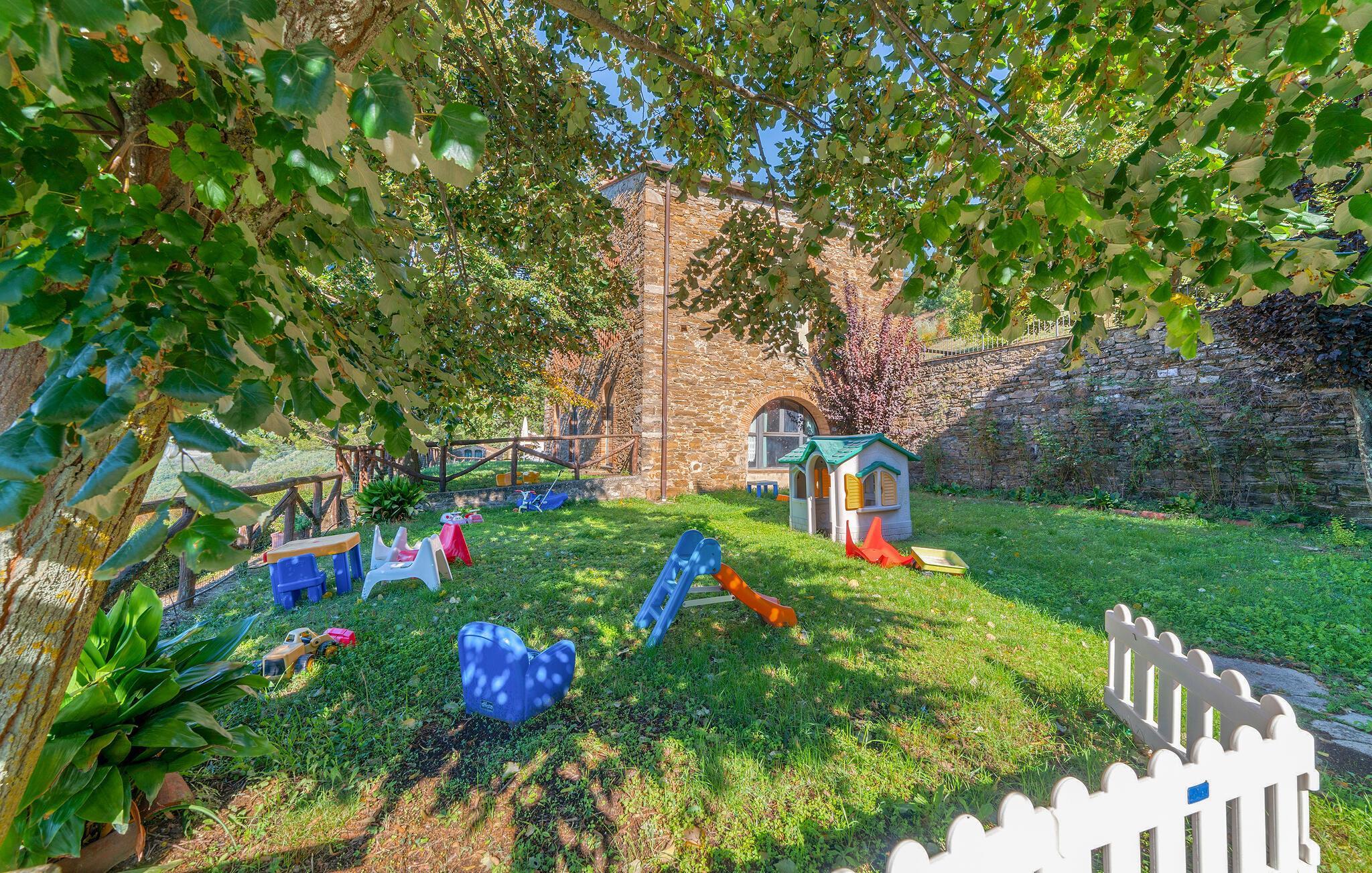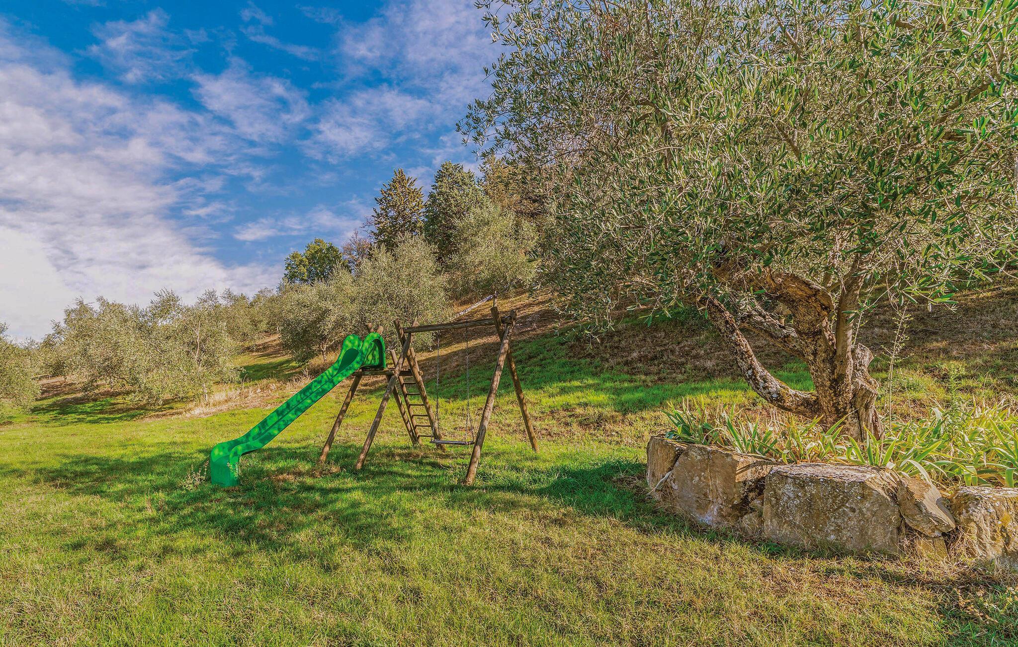 Der Außenbereich ist ein wahres Paradies. Entspannen Sie am großen Gemeinschaftspool mit Liegen und Sonnenschirmen oder genießen Sie ein Picknick auf der grünen Wiese. Für die kleinen Gäste gibt es eine Schaukel und eine Rutsche sowie viel Platz zum Spielen. Nutzen Sie die Terrasse für Mahlzeiten im Freien und bewundern Sie dabei den herrlichen Blick auf die Landschaft.