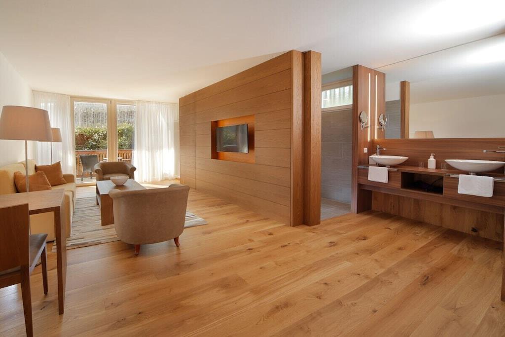 Die Ferienwohnung verfügt über 2 getrennte Doppelzimmer mit Badezimmer und über eine voll ausgestatte Küche. Die Badezimmer verfügen über eine Dusche, WC, eines mit Bidet, Föhn und Beautyspiegel. Ein Flat-TV, WLAN und Telefon befinden sich im großzügigen Wohnraum mit gemütlicher Sitzcouch. Eine Klimaanlage, welche durch unsere Photovoltaikanlage betrieben wird, reguliert die Heizung und die Kühlung und sorgt für ein besonders behagliches Wohnklima. Eine beheizte Schwimmbadanlage mit Panoramalounge und 2 Etagen Liegewiese, sowie ein Sandtennisplatz, Fitnessraum und Saunabereich ergänzen Ihr Wohlbefinden in unserem Resort.