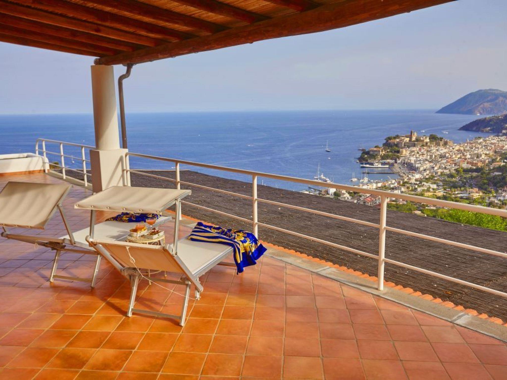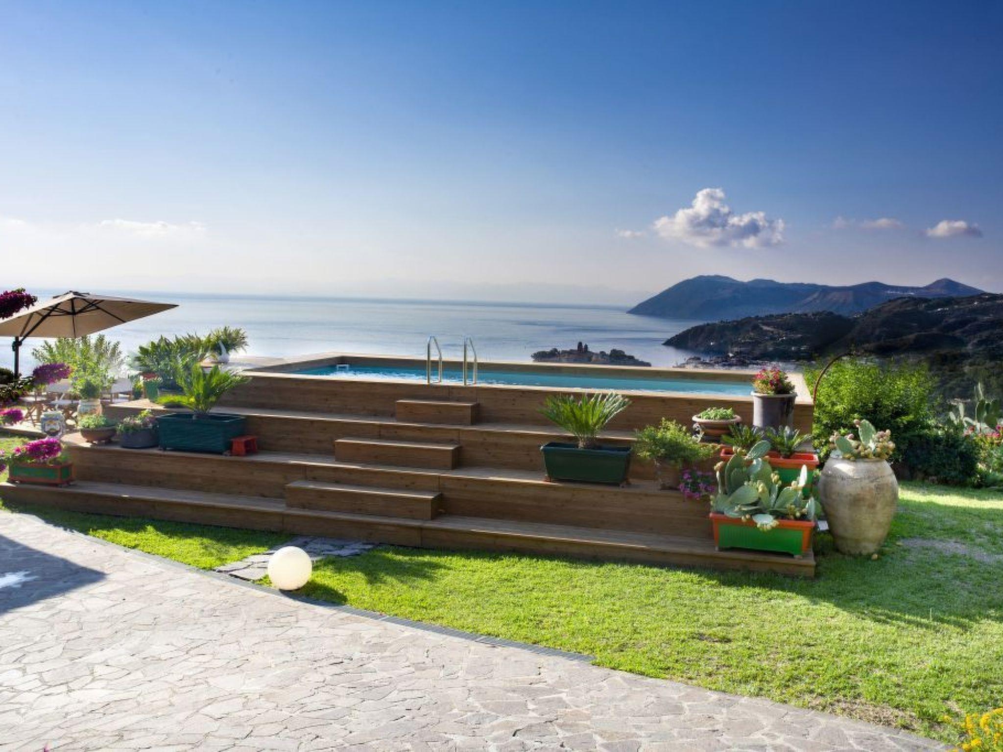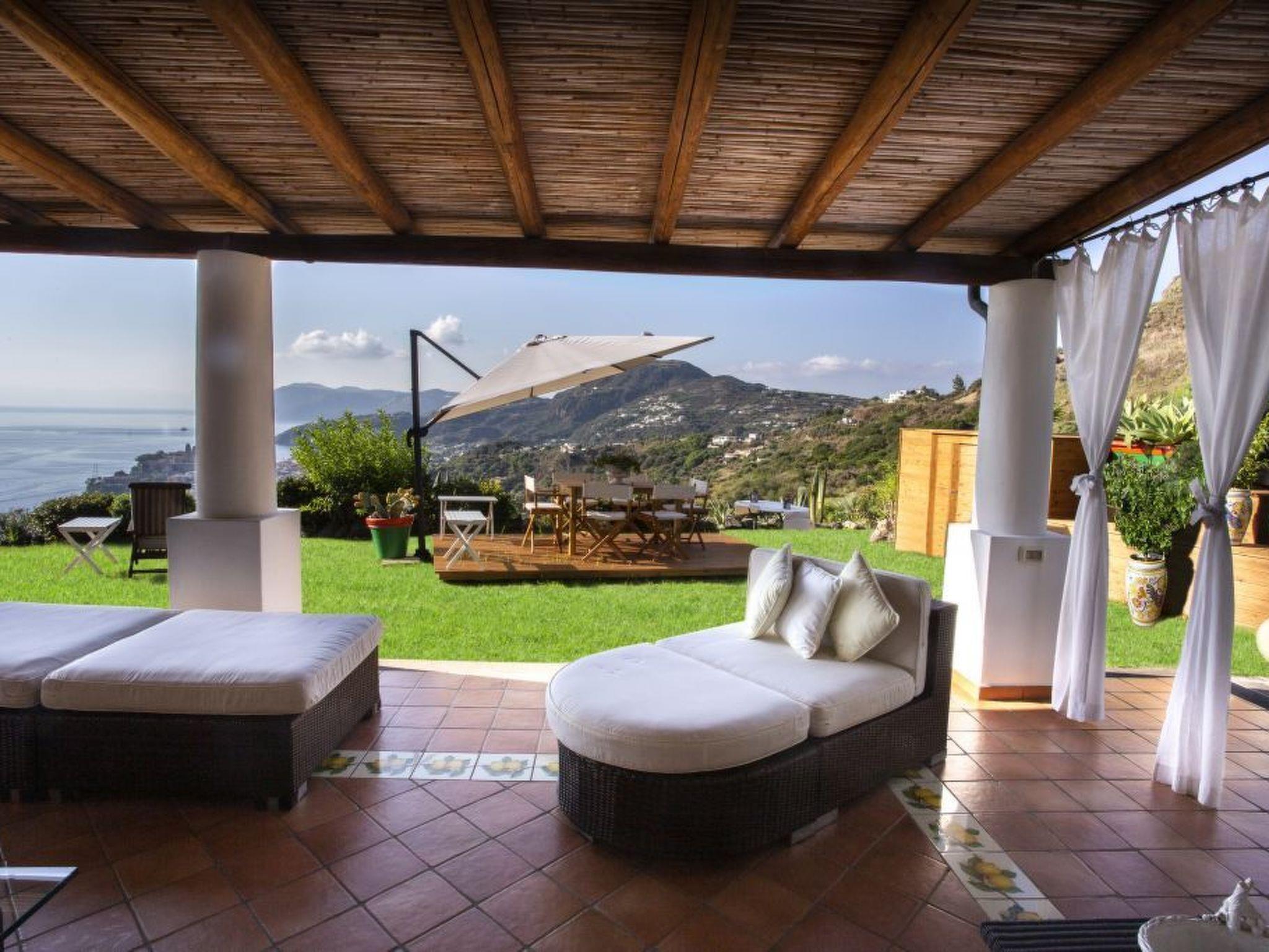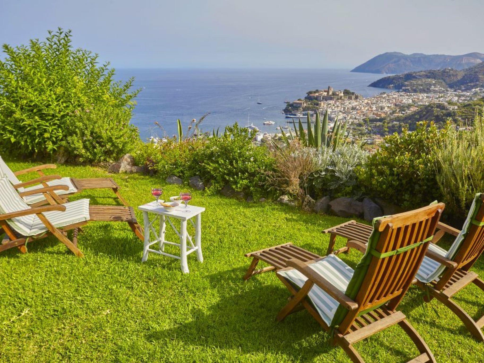Im Außenbereich verfügt die Villa über einen großen privaten Garten mit Rasen, der durch Pflanzen und Bäume bereichert wird, die den oberirdischen Pool (7,60 x 4 m) einrahmen, von dem aus man einen Panoramablick auf Lipari und die Küste von Vulcano genießen kann. Die überdachten Terrassen sind ideal, um im Freien zu speisen oder sich in der Sonne zu entspannen und das Meer zu bewundern, das sich bis zur sizilianischen Küste erstreckt. Die Ausstattung des Außenbereichs mit Liegestühlen und Entspannungspunkten lädt zum Dolce far niente ein, das für den Mittelmeerurlaub typisch ist.