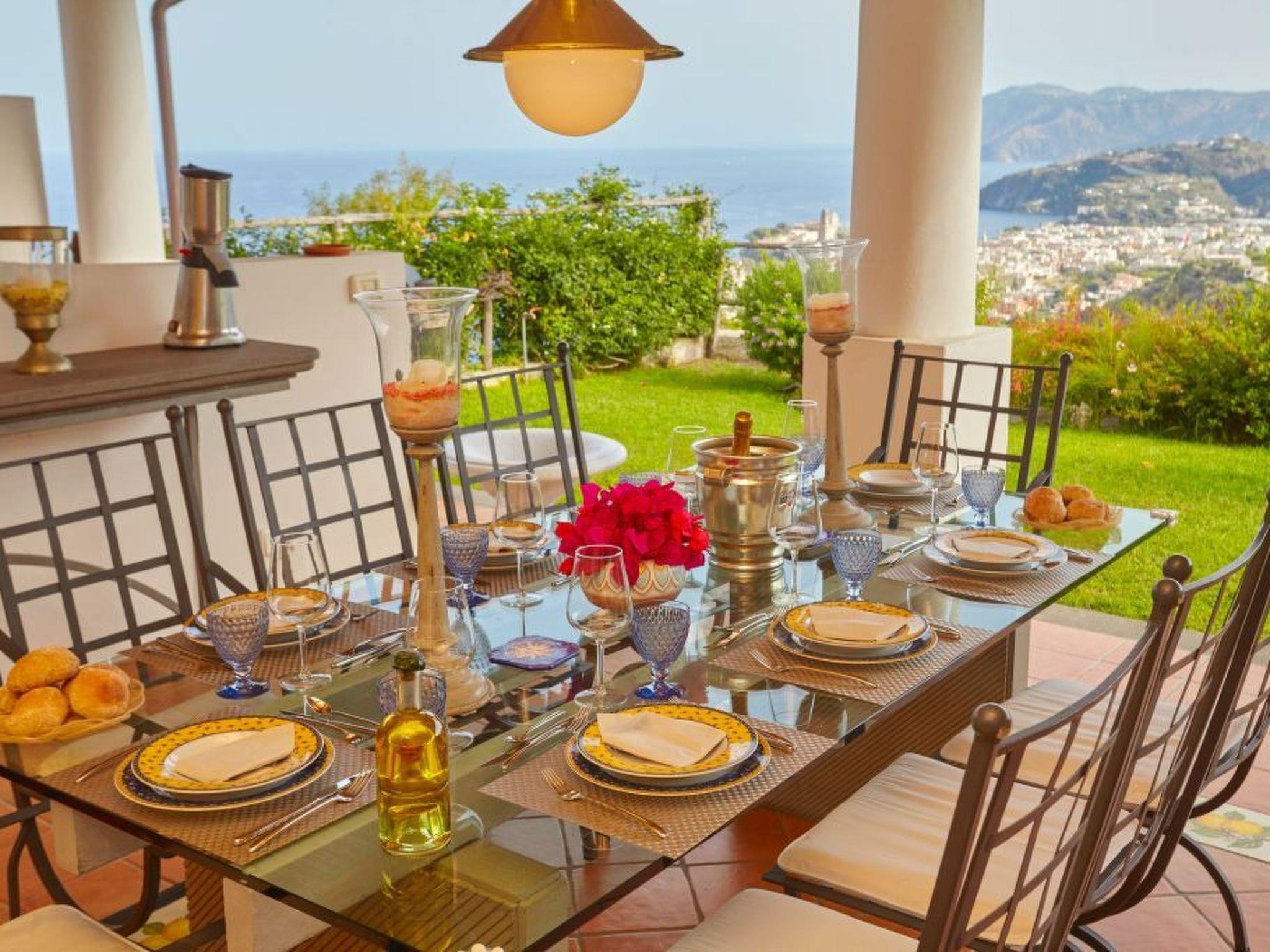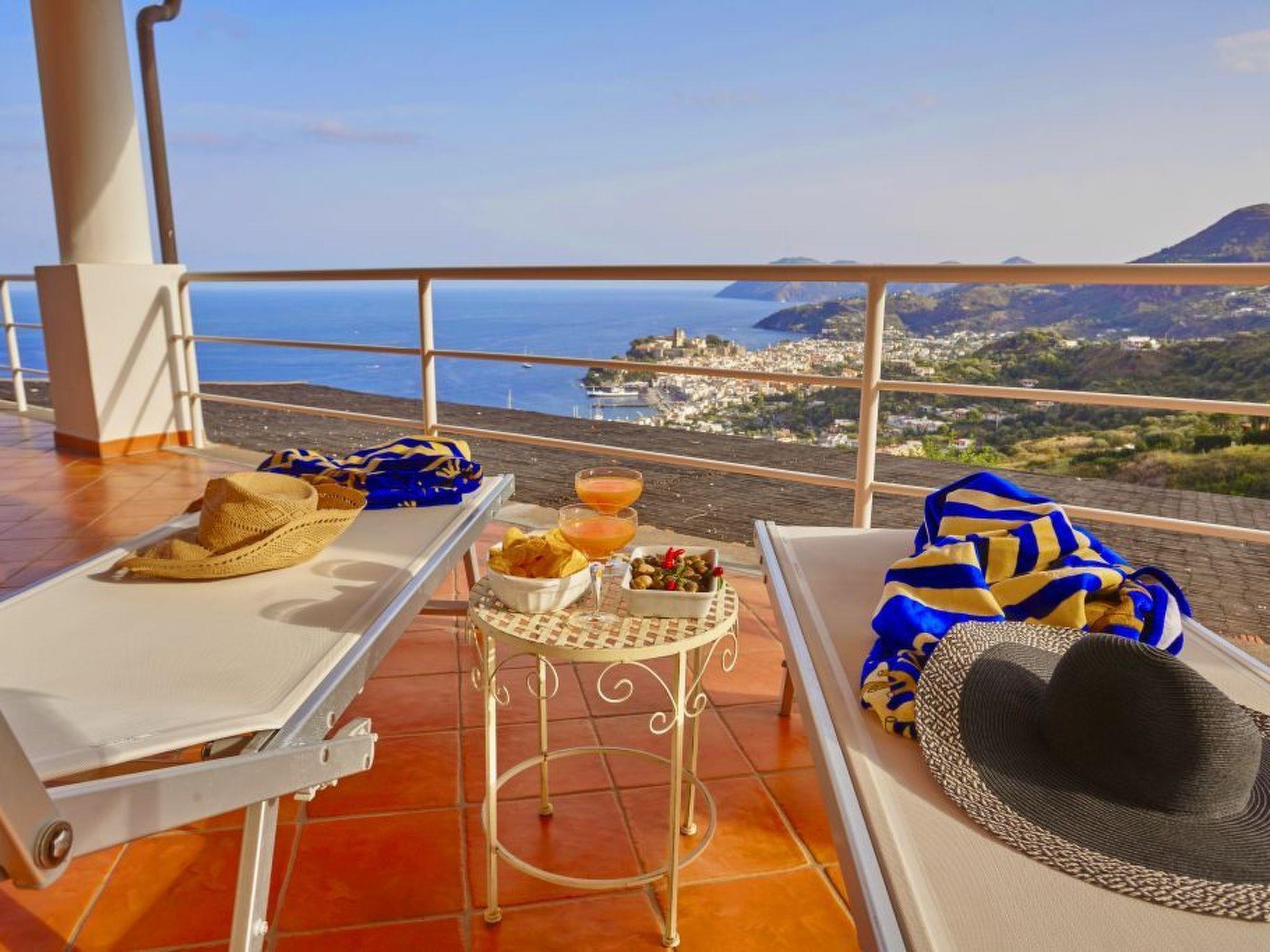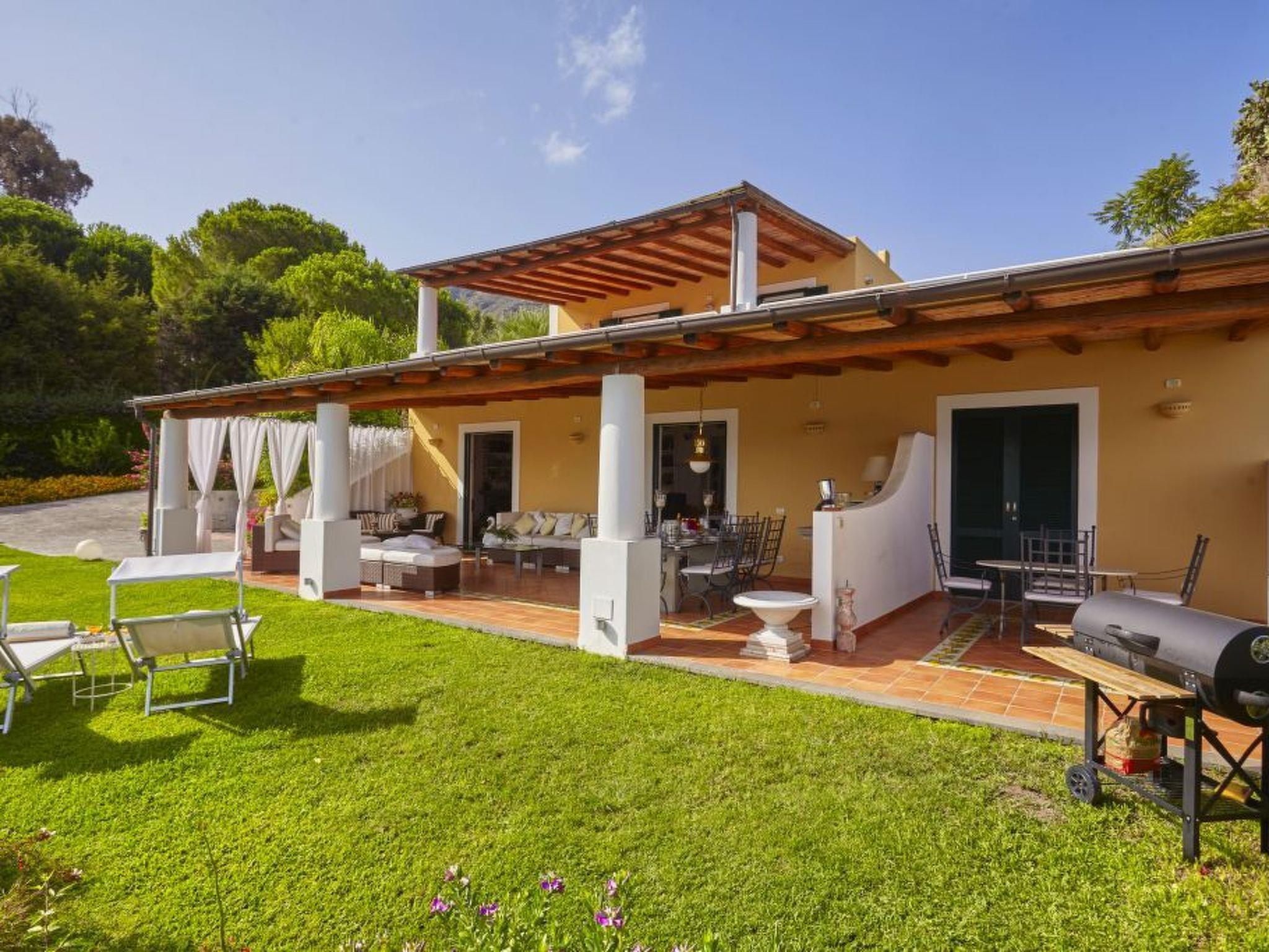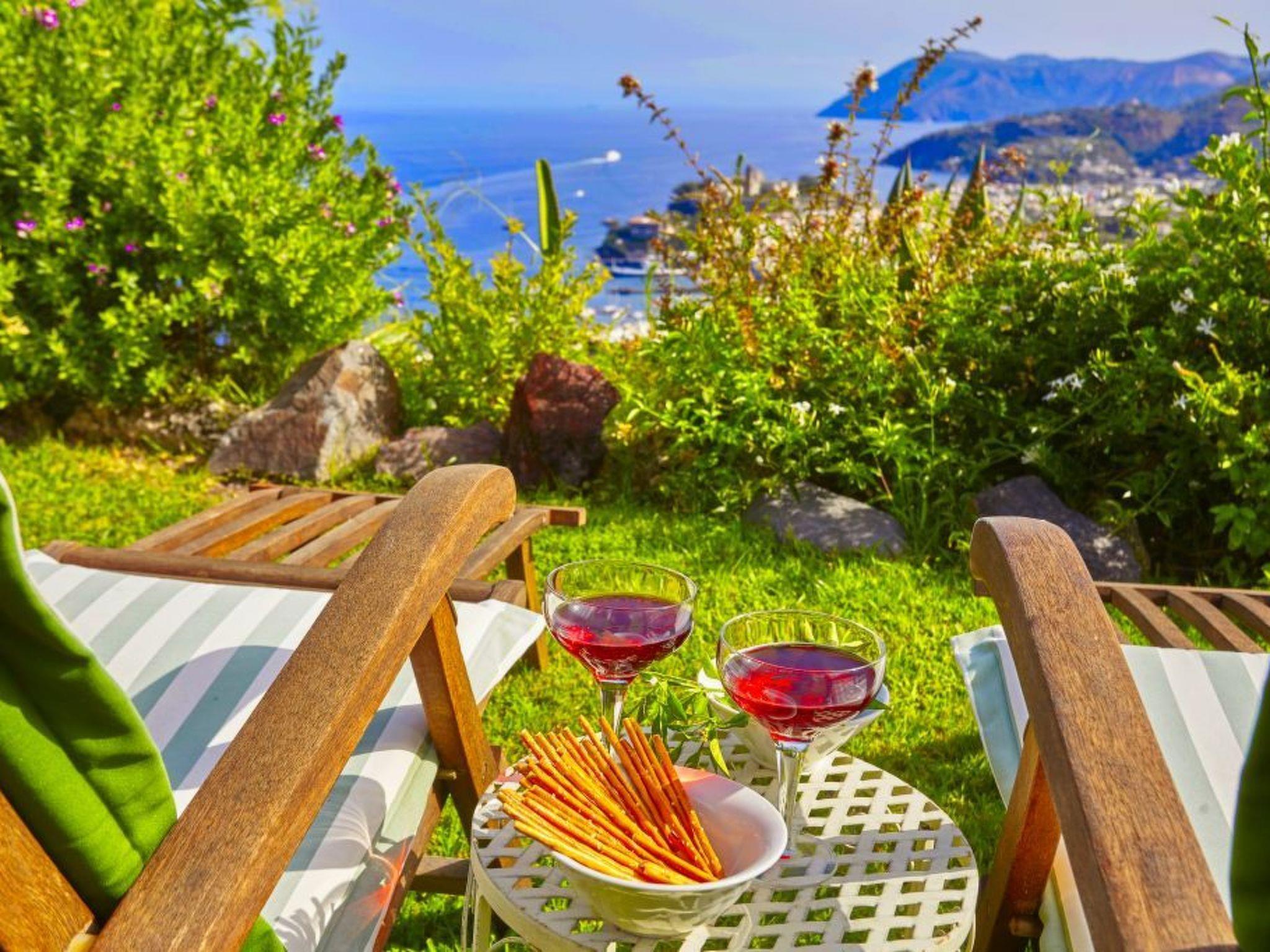 Im Außenbereich verfügt die Villa über einen großen privaten Garten mit Rasen, der durch Pflanzen und Bäume bereichert wird, die den oberirdischen Pool (7,60 x 4 m) einrahmen, von dem aus man einen Panoramablick auf Lipari und die Küste von Vulcano genießen kann. Die überdachten Terrassen sind ideal, um im Freien zu speisen oder sich in der Sonne zu entspannen und das Meer zu bewundern, das sich bis zur sizilianischen Küste erstreckt. Die Ausstattung des Außenbereichs mit Liegestühlen und Entspannungspunkten lädt zum Dolce far niente ein, das für den Mittelmeerurlaub typisch ist.