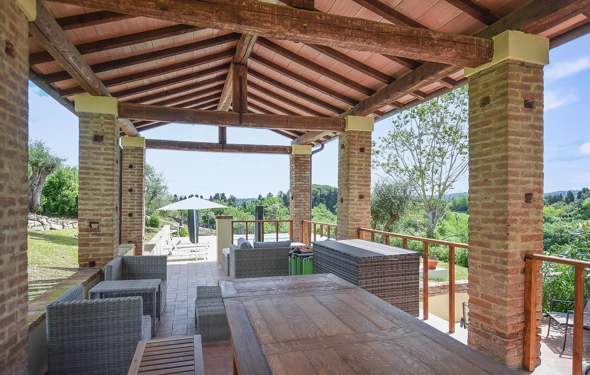 Draußen erwartet Sie ein großzügiger Garten, der zum Verweilen einlädt, sowie ein Swimmingpool, den Sie mit der anderen Haushälfte teilen können. Genießen Sie gemeinsame Mahlzeiten im Freien oder einen ruhigen Nachmittag unter der toskanischen Sonne.