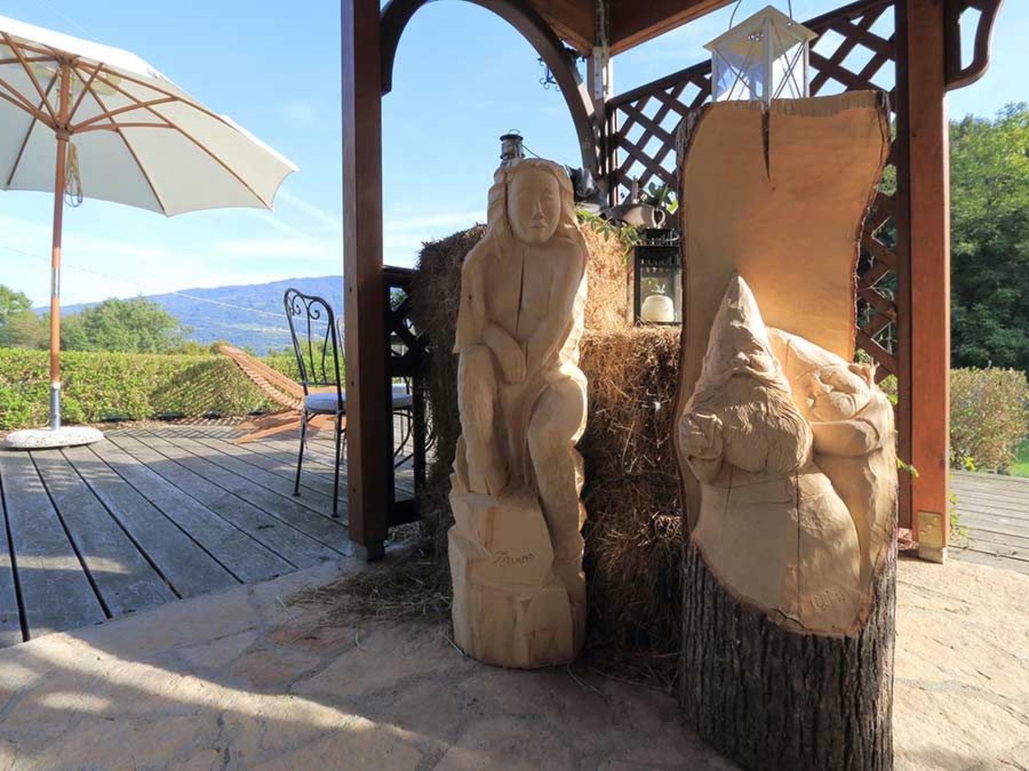 Große Terrasse mit Pavillon, Sonnenliegen, Grill und Spielen für die Kleinen. Wir wohnen in einem Ferienhaus mit großem Garten und möchten diesen Raum auch mit unseren tierischen Freunden teilen. Bei einem Spaziergang durch den Garten können Sie süße Enten, Gänse und andere Hoftiere treffen, die unseren Teich beleben; Sie können auch saisonale Früchte von den Bäumen in unserem Park pflücken; Sie können unsere fleißigen Bienenfreunde bewundern, die köstlichen Honig produzieren.