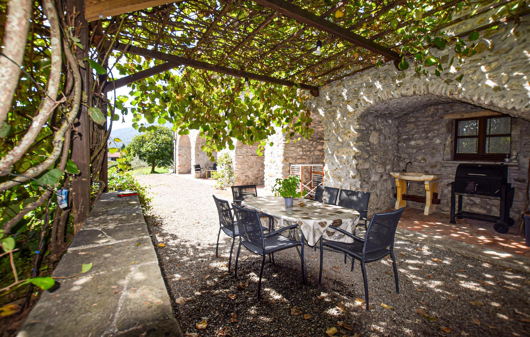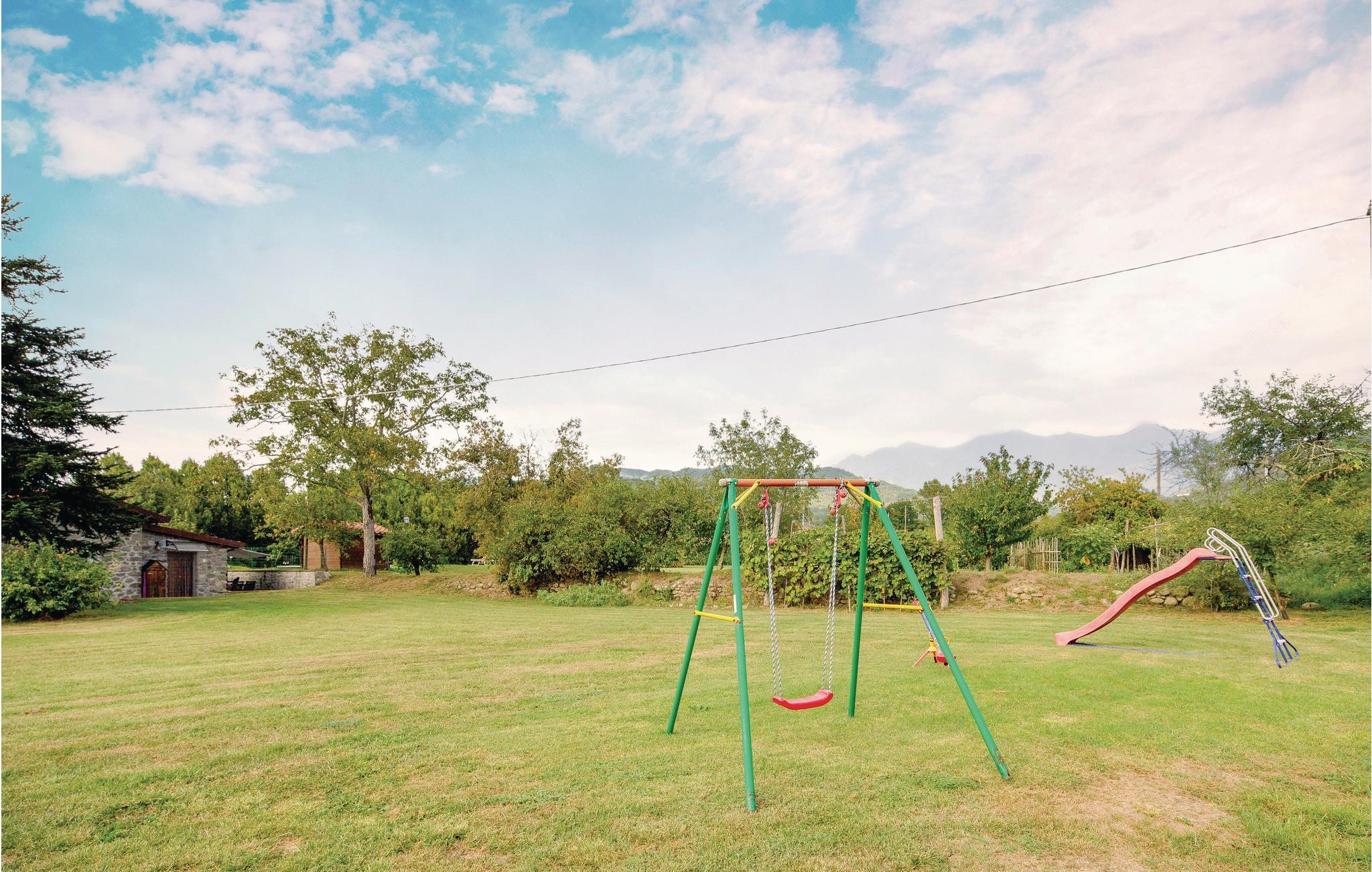 Gehen Sie hinaus in den weitläufigen, eingezäunten Garten und genießen Sie den gemeinschaftlich genutzten Pool, der von Sonnenliegen und Sonnenschirmen umgeben ist. Ruhen Sie sich im Schatten der überdachten Terrasse aus oder bereiten Sie Mahlzeiten am Grillplatz zu. Lassen Sie die Kinder auf der Schaukel und der Rutsche spielen, während Sie die herrliche Aussicht auf die umliegenden Hügel und Berge genießen.