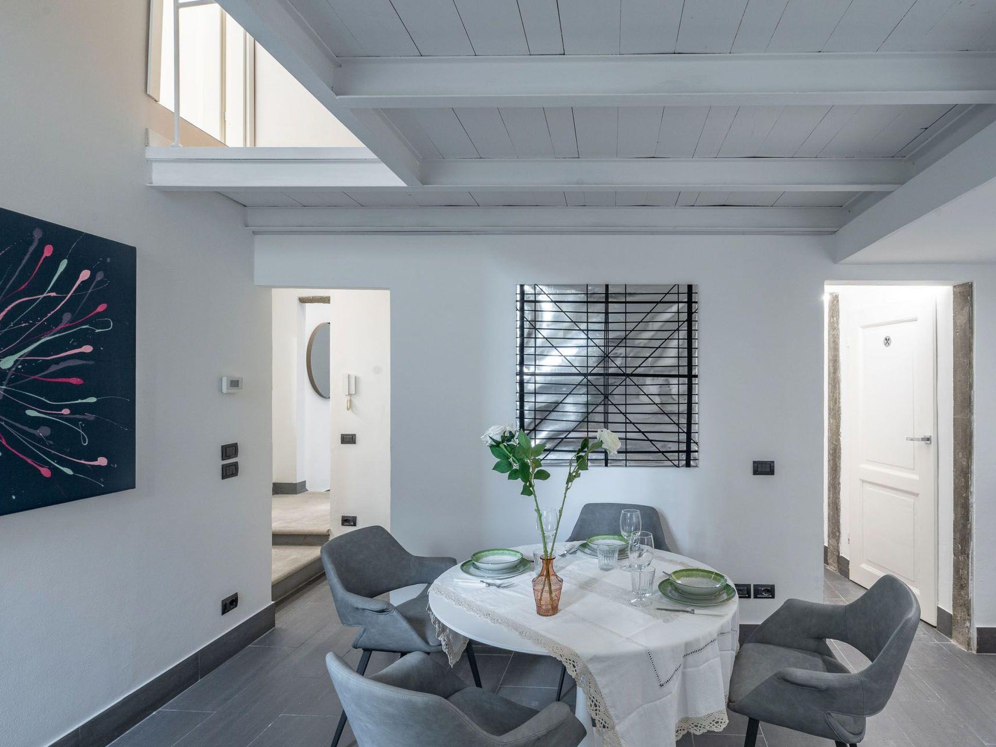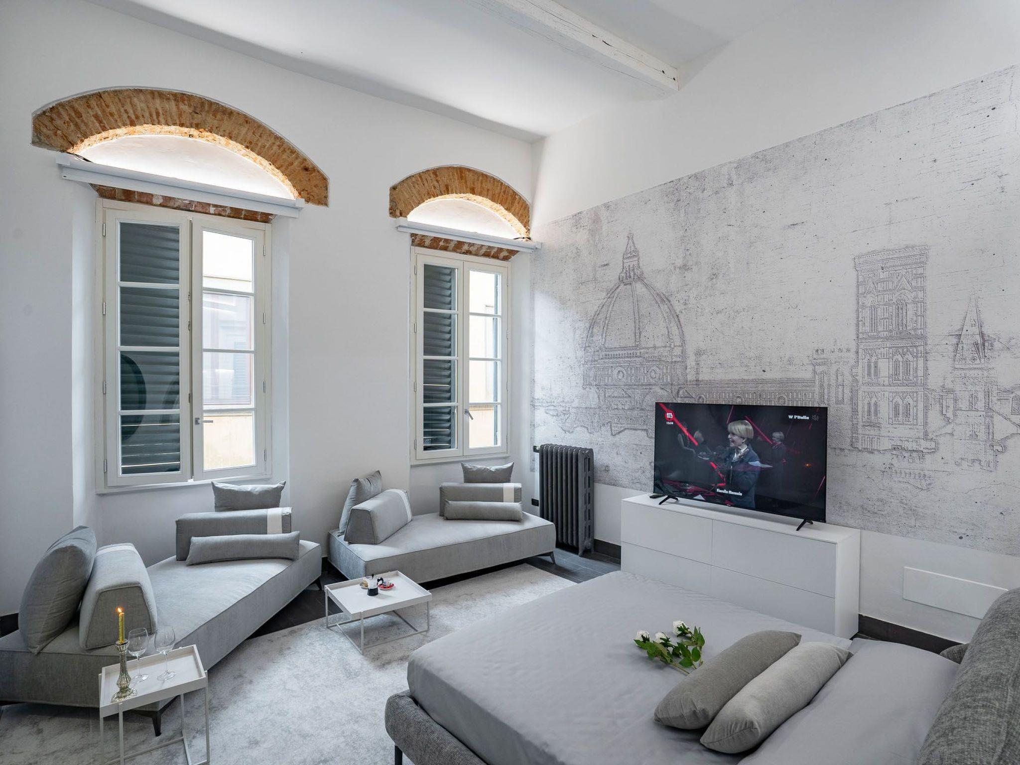 Via Giraldi House | interno 7 befindet sich im zweiten Stock eines Neorenaissance-Gebäudes mit Aufzug in einer der schönsten Straßen von Florenz, nur wenige Schritte von der Kathedrale von Florenz und der Piazza della Signoria entfernt. Diese klimatisierte Wohnung kann bis zu 6 Personen beherbergen. Die zwei Doppelzimmer und zwei Bäder sind so konzipiert, dass sie ideal für 4 Personen sind. Im Hauptraum, in dem zwei große Fenster für natürliches Licht sorgen, bieten zwei Designer-Sofas die Möglichkeit, zwei weitere Personen unterzubringen. Ein 50"-Fernseher, modernes Mobiliar und automatische Jalousien vervollständigen dieses Zimmer. Das andere Zimmer befindet sich im Zwischengeschoss, das über eine Holztreppe zu erreichen ist, und verfügt über einen warmen Holzparkettboden und ein eigenes Bad. Eindeutig romantisch. Die moderne Küche ist komplett ausgestattet (Induktionskochfeld, kombinierter Backofen, Geschirrspüler).